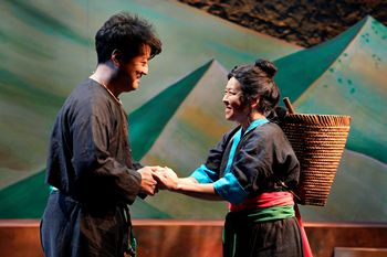 The title character refers to Kalia's father Bee Yang, whom we meet as a Hmong youth, hunting and fishing, searching for his missing father, and courting his future wife Chue Moua in a traditional Hmong ball-toss at the New Year's festival. He tells her he is called "a thinker and a feeler"–a song poet. After American forces withdraw from the region in 1975, Pathet Lao and North Vietnamese forces seek genocidal retribution on the Hmong for their wartime collaboration with the United States. Bee and the other men hide in the jungle until they are able to rescue the women and children being held captive. The group makes its way through the jungle and across the treacherous Mekong River to a refugee camp in Thailand where, in 1980, Kalia is born. After six years enduring the harsh camp conditions, the family immigrates to the United States. The first act of The Song Poet ends as Bee, about to board the airplane bound for America, pauses and takes a long, sorrowful look back at the contours and colors of Southeast Asia, wondering if he will ever again see the world as he has known it. The first act is a fluid, unfolding story of love for a place, culture and family. The second act opens with the family–Bee Yang, Chue Moua and daughters Daub and Kalia–in St. Paul, Minnesota. Scenes now seem to leapfrog through stages of their adaptation to American life. They declaim the shockingly cold weather, Chue vents her frustration over not knowing English. Bee is frustrated by the loss of heart to sing as he did in their homeland, juxtaposed against their daughters singing the all-American "This Land Is Your Land," which they learned at school. We next see Bee miserably working in a dehumanizing factory where all that matters is speed and output. He endures harassment and illegal labor practices in order to give his children a better life. This scene is well conceived–particularly the factory machines given voice by members of the Minnesota Opera Chorus–but feel less specific to the Hmong experience and generalizable to the stories of all poor immigrants forced throughout our history to accept the least desirable, most dangerous jobs. Up to this point, the score and libretto, production, and performances are sublime. But now the opera seems to begin a race through the rest of their journey. Abruptly, the next scene jumps to Dawb and Kalia as young women–Dawb now an attorney and Kalia an aspiring writer–and the musical selection "Sisters are life partners too" is not up to the caliber of all that precedes it. We jump again, this time to the Minnesota Book Awards where Kao Kalia Yang receives the creative non-fiction award for her first book, "The Latehomecomer." There is no singing in the scene at all and barely any speaking, just an announcement as the award is bestowed and Kalia, huddling with her family, all looking proud. What a missed opportunity for Bee Yang to sing about what it means to him to have his daughter so highly recognized in their new land, and for a work that is the story of his family's struggle and perseverance, and for Kalia to sing about what it means to her to bestow this gift and this honor on her family. What could be a powerful summation of the family saga is curiously unmarked. In the last narrative leap the family is back in Laos for the first time since their unnerving departure. The lush landscape provokes memories for the elders but is known to their children only through stories and songs. They acknowledge the long road travelled from this place to their drastically different lives halfway around the Earth. The opera ends with a nod to how they have managed to find their way from the old to a new life, but without giving voice to the pain they suffered to reach this happy end. After such intense emotion, especially through its first act, The Song Poet finishes on a low key, with a gentle sense of wistfulness for their past, gratitude for their present, and hope for their future. Kao Kalia Yang adapted her book to form The Song Poet's libretto and Jocelyn Hagen composed a gorgeous score to accompany those words. The soaring melodies use only Western instrumentations yet create music that carries the tones of Southeast Asia, with the harp and xylophones making significant contributions. It is beautifully played by fourteen members of the Minnesota Opera Orchestra, seen on stage, vibrantly conducted by Tiffany Chang. As with the libretto, the most moving elements are in the first act, taking time to bring depth and color to the narrative. A scene in which Bee Yang bids farewell to his two pet dogs offers surprisingly potent insight into the man, but every scene has beautifully realized music that conveys feeling, character and setting. The cast perform solidly throughout. Museop Kim is particularly powerful as Bee Yang, his strong voice bringing emotional heft to his character. Corissa Bussian is a good match for him as Bee's wife Chue Moua, and her soprano blends well with Kim's baritone during several duets. Laura Sanders is winning and brings her clear soprano to the roles of Joua Thao (Chue Moua's mother) and the adult Kao Kalia Yang. Hai-ting Chinn's mezzo-soprano conveys warmth and confidence as adult Dawb Thao and as Youa Lee. Haozhen Wen and Xi Yuan are comically effective singing the roles of Lion Dog and Jackie Chan Dog, respectively. The twelve-member chorus, directed by Celeste Marie Johnson, raise their voices together beautifully, whether during a choral selection or backing one of the principal performers. Director Rick Shiomi moves the story from scene to scene with fluidity throughout the first act, staging scenes such as the ball-toss courtship activity and the arrival of enemy soldiers in the village with nuance and specificity, giving them a feeling of veracity. Penelope Freeh brings lovely choreography to the production. There are two especially stunning dance sequences, one conveying the deepening love between Bee Yang and Cue Moua, the 