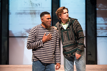 We Shall Someday is a small musical in terms of cast and stage effects, but huge in terms of heart and the depth of its theme. In three short acts, thirty to thirty-five minutes apiece, with an intermission between the second and third, it relates the struggles faced by members of an African American family across three generations. It invents three fictional characters, but places them each in a context of historical truth. We meet Julius Tate, a single father raising young twin daughters Sam and Ruby, wresting with what he could do to make the world better for his girls, then we meet Ruby as a thirty-year-old challenged by how to raise her fifteen-year-old son Jay as a Black man in a white man's world, and we meet Jay some years later as a diligent college student, struggling to choose between the risks and the imperatives of stepping forward in civil rights activism. Each of them is given an entire act to reveal in song and in lyrical spoken narrative, the symbiosis between their inner turmoil and a landscape soaked to the Earth's core with racist traditions, values and privileges. In 1961 we meet Julius in the small Arkansas town where he has always lived, except for a stint in the service. He works at the diner run by a good-hearted white woman, Miss Arlene, to support himself and his two young daughters. We do not yet know where their mother is. It is the time of the Freedom Riders, a campaign as foreign to Julius as night is to day–Julius, who was taught by his grandmother to "keep your head down and don't make a fuss. White folks don't like fuss." But Miss Arlene sees something in Julius that tells her he needs to join the Freedom Riders. She tells him "It seems you've earned some time off," and offers to watch his two girls while he steps out into an unknown, dangerous world that changes his life. Ruby is thirty when we meet her. She was fifteen when she got pregnant with her son Jay, and now he is fifteen. She fled from the hospital where she saw him torn asunder by a white policeman's club, unable to bear the sight. She finds solace at the cemetery where both her father and her twin sister Sam are laid to rest. She talks about her father, her mother, and her bold, bright sister who said she wanted to be president when she grew up–Ruby incredulously exclaiming "President–she, a girl–and Black!" She talks about Jay and the terror a mother faces raising a Black boy in such a world. She finds strength from her forbears and from her son. She hears her father telling her that after a harsh imprisonment, the Freedom Riders got back on the bus, and "Baby girl, don't nothing change if you don't get back on the bus. You are my bus, and Jay is yours." Jay gets a scholarship to attend college in New York City. He is there when Rodney King is beaten by a Los Angeles policeman, captured on video for the world to see and prompting a wave of riots. Jay is still there when, a year later, that officer is acquitted. His white roommate Scooter tells Jay there is a protest. Jay knows what protest did to his grandfather, he knows what a white policeman can and will do to a Black man like himself. Scooter wants Jay, expects Jay, to join him. Jay agonizes, can Scooter possibly understand why he might not? To Scooter it is a no brainer, but it is a crushing dilemma to Jay, who knows that if anything happens to him his mother will be left all alone. Ted Shen has composed rapturous music for We Shall Someday, with distinct songs that flow from one piece into spoken dialogue, then into another song, so seamlessly that speech and singing seem one act, modulated by the specific feeling being triggered at a given point in Julius or Ruby or Jay's life. And those words penned by Harrison David Rivers, with contributions from Shen, whether spoken or sung, are achingly precise in conveying the wounds within and the itching provoked by the scabs grown to hide the wounds. We understand lives that are either racked with pain or troubled by an itch, but never at rest. The actors who portray the Tate family members–Ronnie Allen as Jay, Erin Nicole Farsté as Ruby, and Roland Hawkins II as Julius–are all three magnificent. While all have lustrous voices that do full justice to Shen's score, the power and clarity of Hawkins' expression reaches a length further, to somewhere beyond the stars. Each dominates the act devoted to their character, though the others appear at times as a chorus or as the presence of beloved family members felt within. Bradley Johnson plays a white prison guard, a white police officer, and Scooter, Jay's naive white ally roommate, and joins in the choral work. Though his brief bits are cardboard figures, Johnson portrays them admirably, and he too has a beautiful voice. The show ends with a coda, an anthem sung by all four actors as a video is screened depicting a host of positive images of multi-generational connections among African American families. Sarah Bahr's single set piece is an abstract multi-leveled space in tones that suggest alabaster, a stony monument to the small steps taken by Julius, Ruby and Jay Tate, and millions like them, that are not the fabled strides of Martin Luther King or Cesar Chavez, but contribute to the full power of a movement that will not be stilled. And yet, within that vastness is a tiny space that represents the inhumane confines of a prison cell. The set is augmented by slides that establish the places in which the story is set, with Kathy Maxwell responsible for excellent projection design. Amber Brown's costumes provide apt trappings for each character, while Kyia Britt's lighting design is attuned to the rise and fall of the score, as emotions and focal points shift. C. Andrew Mayer designed the soundscape that supports the narrative. Shen's score has been movingly orchestrated by Tony Award winner Michael Starobin and is performed by a superb six-member band conducted by music director Denise Prosek. We Shall Someday is without fault. It i