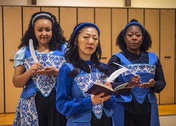 Emilia was commissioned by and premiered at Shakespeare's Globe Theatre in 2018, transferred to a run in London's West End in 2019 and, in the early stage of the COVID lockdown, was available to view via streaming in fall 2020. The play appears to be just finding its legs on American stages. In London it won the 2020 Olivier Award "best entertainment or comedy"–a category meant to distinguish comedic works from "serious drama." The categorization is both apt because the play is very often extremely funny, as well as a misnomer, because it is deadly serious. I was totally unfamiliar with the life and work of Emilia Bassano Lanier before encountering the play, and venture to guess I am in good company. Emilia's father, who was a court musician, died when she was only 27 years old. She was then sent to live with a succession of countesses who saw to her education and groomed her for marriage. She declined the expected course of marrying well in order to be provided for and instead became the mistress of a powerful Baron, who married and was much older than Emilia, but treated her well. However, when she became pregnant with his child she was ushered into a marriage with Alfonso Lanier, a union of convenience for both parties and, based on all accounts, an unhappy one. All of the above is documented in Lanier's diaries, letters, dedications, and records kept by her physician, and aside from changing some names, Malcolm's play follows this narrative quite closely. From here, however, Malcolm's invention of the character Emilia veers away from what is known to be true and enters the arena of broad speculation. The Emilia of the play meets William Shakespeare and enters into a liaison with him that included sharing their literary gifts along with sex. Shakespeare is impressed by Emilia's ability but belittles the idea of her work being published, let alone her claiming the mantle of "poet." There has been speculation that Lanier was the mysterious "dark lady" to whom Shakespeare addresses some of his sonnets, but no evidence has been produced to back this notion, or that they had any kind of relationship at all. However, for our Emilia, his publication of what she believed to be private poems and his appropriation of her poetry into his own work are betrayals stoke a rage that empowers her to break through all barriers and become the poet she was meant to become. And what of that poetry? It is stridently feminist, certainly in the context of its times. For example, Emilia rails against the church's vilification of Eve as the temptress and asserts that Adam was as much responsible for the fall from grace. Her collection, published when she was forty-two years old, is titled "Salve Deus Rex Judaeorum" (Hail, God, King of the Jews). The title poem relates the crucifixion of Jesus from the point of view of the women who were present. The play brings Amelia's staunch feminism to a head in a cry of righteous anger against the bonds that have kept women from an equal share of our social goods. It is clear Malcolm means these appeals not only reflecting the historic Emilia, but to address the world as it continues to exist. Ten Thousand Things' signature style, mentioned above, entails playing to small audiences seated two rows deep on four sides of a small square playing area, without stage lighting or amplification and the most minimal of set pieces. Everything needed to stage their shows can fit in the back of a van. Most actors take multiple roles with creative costuming allowing them to make rapid transitions from one role to another. While they present their work to paying audiences at standard venues, such as the Open Book, their format enables Ten Thousand Things to bring live theatre to communities and settings where people typically have little or no access to it. These include shelters for the unhoused, prisons, adult learning centers, urban community centers, and halfway houses. The shows are performed in gyms, libraries, cafeterias or community rooms with all the lights on, so actors can see everyone in the audience and audience members can see one another as well as the actors. The paying audiences have the same experience, which is a joy to behold. In Emilia, all roles–male and female–are played by eight female actors, and they make for a wonderful ensemble. This is a twist on the theater in Emilia's day when only men appeared on stage, playing both male and female parts. Three play Emilia at different stages of her life: Marisa Tejada as the young Tejeda; Sum Mee Chomet as a young woman; and Greta Oglesby as the mature Emilia, who stakes her rightful place in the world. All are superb. Their costuming (Sarah Bahr designed the marvelous array of costumes) have common elements to identify the three actors as one woman, and there are moments when they are all present, observing their younger or older selves, as if seeking unity in the disparate episodes of Emilia's dramatic life. The remainder of the cast do sublime work; I will name each, along with characters that left the strongest impression: Maggie Chestovich as Lord Henry Carey and as Eve; George Keller as Alphonso; Mo Perry as Shakespeare and as Lord Howard; Kimberly Richardson as Susan Bertie and as Lady Margaret Clifford; and Sophina Saggau as Lady Katherine. Particularly impressive are the scenes in which these actors appear as a collective of washerwomen who give Emilia much needed support and in turn are transformed by her vision. One gets a sense of a true community among these hard-scrabble women. Marcela Lorca directs Emilia with the touch of a master storyteller, attentive to every detail that brings the tale to vivid life, while embossing it with the passion intended both by the playwright and her compelling subject. For example, a scene of midwifery is exquisitely realized to create palpable tension, drawing the audience in as witnesses to the grueling process of birth. The set design by Sarah Brandner is effective,