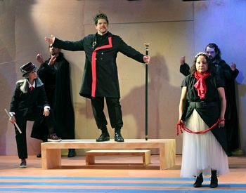Whether or not Carson has done the work of a playwright, translator or adaptor, she has done it brilliantly. The current production of Antigonick by Full Circle Theater is mesmerizing from start to finish, and the best work yet from this bold company that continues to push the envelope. Martha B. Johnson, one of Full Circle's "core artists", directs the production, striking a tension from the first moment that continues unabated for the play's seventy-five minutes. Sandy Augustin choreographed the dance and movement which is a significant element of the storytelling, so much so that it would be hard to discern the thin line between the work of choreographer and director, the result being an exquisite collaboration. The story, already an old legend when Sophocles committed it to writing, deals with honor, fidelity, and the place for justice between the rule of law and obedience to a higher power. Antigone is one of four children born to Oedipus, King of Thebes, and Jocasta. Oedipus, you may recall, was sent away from Thebes as an infant. Upon his return as an adult, he unknowingly killed his father (the king) and married the widowed queen Jocasta, who was his mother. The play begins after Oedipus' demise, as Antigone and her sister Ismene watch their brothers, Polynices and Eteocles, duel to the death for the throne. The death of both sons allows Jocasta's brother Creon to assume the throne of Thebes. Because Eteocles had defended Thebes while Polyneices had lead an army from neighboring Argos, Creon decrees that Eteocles be given a hero's burial, but Polyneices' body be left untouched and unburied, to become carrion for the vultures–the worst signifier of disgrace and dishonor. Defying her uncle, Antigone anoints her brother's body and covers it with soil in accordance with the dictates of the gods. The play proceeds with the confrontation between Creon, representing the law of man and Antigone, adhering to the gods, as tragic results heap more misery upon the royal family and the kingdom. This is not the age of the ancient Greek democracy. In the times depicted, the "law of man" was the law of just one man, a king whose whims go unchecked by the voices of the community. Those voices are represented by the Chorus, whose commentary on the resolute will of the king and the brave defiance of the grieving Antigone veer back and forth, like an op-ed page presenting the strengths of both arguments. They tip one way or another depending on who has made the most recent and impassioned claim of authority. In Carson's rendition, Kreon makes his positions known by spewing out his daily chosen verbs and nouns, without constructing sentences around them: free floating words untethered by context that he can bend or draw upon to satisfy his whims–bearing a striking resemblance to certain current politicians. Antigone and Ismene, in contrast, discuss the work of Hegel, the 18th century German philosopher, and make references to literature by Virginia Woolf and Bertolt Brecht, imbedding articulate ideas into their arguments that gives them not only a context, but a modern context that shows the currency of the questions. And what of Carson's invented new character Nick–or "nick of time," as Kreon wails when he recognizes his folly? Nick never speaks and appears in a cutaway waistcoat and top hat, with a blood-red feather tucked in the blood-red hatband. Nick is positioned beside or behind the action for most of the play, but when the Chorus express themselves in dance, Nick shifts to the middle of the throng, moving in unison with the chorus but standing out owing to the jaunty costuming. Otherwise, while characters speak or act, Nick appears to be taking measurements of the murals headless horses, their front legs reared up and tangled in red wires that adorn either side of the stage. Nick measures the horses' legs, the distance between legs, the bend in the leg, and so on, but never reporting back to the throng. Only once Kreon realizes that he waited too long to clear his thinking does Nick bring meaning to the people of Thebes. At that time, as they form a large circle with Nick in the center, Nick's arms take on positions like the hands of a clock while the chorus moves rhythmically to the beats of time moving forward. The nick of time slips into time lost forever. The stunning staging and choreography is lifted even higher by a cast that is wholly immersed in the project. Oogie_Push is remarkable as Antigone, a bastion of righteous strength even as she recognizes the dire consequences of her defiance. Rich Remedios is equally striking as Kreon, issuing a self-satisfied smirk as he proclaims authority that stems not from any natural order but from his ability to bully a crowd into submission. When the inevitable fall occurs (this is, after all, a Greek tragedy), his devastation is shattering. As Nick, Sandy Augustin has a gamin-like presence, seeming to take pleasure in adherence to their directives, without being caught up in the drama of the public arena. Most of the actors who forming the "chorus" double in another role. Laila Sahir is stirring as Ismene, agonizing over her sister's flaunting the law. Sebastian Grim is moving as Haimon, Kreon's son who is betrothed to Antigone, struggling to support his father's laws while trying to persuade Kreon to align the law with public sentiment–and with his own heart. Eva Gemlo gives a heart-wrenching portrayal of Euridike, Kreon's wife and Haimon's mother, who suffers more quietly but no less persuasively than others. The role of Teiresias, the blind seer, who arrives to enable Kreon to finally "see" where righteousness lay, is divided between a recorded voice, fiercely spoken by Daniel Mauck, and a silent physical presence, sinuously danced by Dominique Jones. Both make outstanding impressions. Dividing the voice and the body gives Teiresias a presence with one foot in the material world and one in a world of deep, irrefutable vision. The physi