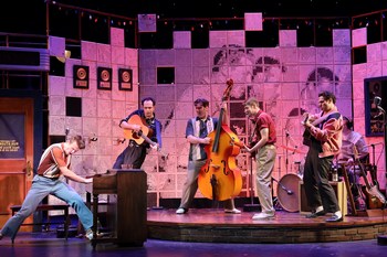 Well, there actually was a day those blazing lights of early rock and roll played together–not for a concert, but a happenstance gathering that turned into a jam session. It happened on December 4, 1956, at the Sun Records recording studio in Memphis, Tennessee. A version of that once-and-only-once event forms the basis of Million Dollar Quartet, the musical now having a return run at Old Log Theatre. The show delivers an electrifying feast of popular hits associated with each member of the quartet, along with a few songs more generally tied to the era. The songs are served up by a hyper- talented cast who sing like their hearts are bursting and move like their pants are on fire. Sun Records was owned by Sam Phillips, a music industry pioneer who recognized the thrust of a new sound that was igniting young people, especially young white people. It borrowed the sex and swagger from rhythm and blues, the sounds of Black music that was forbidden fruit to restless white youth. Phillips nurtured all four of those musical legends–Presley, Cash, Lewis and Perkins–early in their careers. The gathering on December 4th had not been planned, but savvy Phillips knew a story when he saw it. He himself dubbed it the "Million Dollar Quartet," then called a Memphis newspaperman to rush over and cover the big doings. Phillips had a tape rolling while the music played, but it was not released until 1981. By then he'd sold Sun, and its catalog had been licensed to a British company that released the recordings in Europe. It wasn't until 1990 that RCA re-recorded the original tapes and "Million Dollar Quartet" was released in the United States. Sixteen years later, Floyd Mutrux, an American writer-producer-director, and Colin Escott, an English music historian, wrote the book for a stage musical that re-created the original jam sessions, adding some invented narrative to give it heft. After try-out runs at several regional theaters, it opened on Broadway in 2010, where it lasted over a year, followed by a year-long run off-Broadway. Old Log first staged the show in 2016. Based on the rapturous response from the audience watching the show with me yesterday, it was a smart choice for an encore run. I am not much of a nostalgia seeker myself, and I was a young child in the '50s, so these are not the songs that accompanied the cauldron of my adolescence–and yet, I was hooked by the energy, the enormous talent, the well-crafted production and the fun. It's a big, joyful rock 'n' roll winner. The song fest includes such notable songs as "Blue Suede Shoes" and "Matchbox" (hits for Perkins), "Folsom Prison Blues," and "I Walk the Line" (Cash), "Great Balls of Fire" and "Whole Lotta Shakin' Goin' On" (Lewis), and "That's All Right" and "Hound Dog" (Presley). Among the twenty-three musical numbers is a rousing rendition of the old anti-war song "Down by the Riverside" sung by all four, and a lovely a capella rendition of the Christian hymn "Peace in the Valley." In fact, the majority of the songs played during the actual Million Dollar Quartet session were gospel tunes and hymns, reflecting the common denominator of deeply Christian values with which all four were raised. There were also quite a few old-school Bill Monroe bluegrass numbers. Mutrux and Escott's decision to jettison most of those in favor of familiar hits, with a lot more rock 'n' roll energy, is understandable and undoubtedly makes for a far more entertaining and successful show. In addition to the four main attractions and Sam Phillips, who doesn't sing but plays a crucial role in the show, is Dyanne, the sexy, hip-swiveling girlfriend who was in tow with Elvis. Dyanne is also a singer and provides two numbers–"Fever," first recorded in 1956 (two years before the famous Peggy Lee version) and "I Hear You Knocking"–as well as serving as a listening ear in a scene with Cash and Perkins expressing restlessness about their work with Phillips, and in a couple of scenes with Phillips baring his concerns. Elvis did in fact bring his then-girlfriend to the actual jam session, only she was a dancer named Marilyn. If any of these conversations took place, there surely is no record kept of them, but they serve the show well, letting us in on the issues roiling within each of these men who seem, to the outside eye, to have the world on a plate. That the narrative is managed without detracting from the main event, which is the songbook, is a sign of the fine work by Mutrux and Escott in constructing the show, and also to director Christine O'Grady's sure hand, keeping the 100-minute show (without intermission) moving seamlessly as backstories are presented and issues among those assembled are aired, never losing track of the music. The casting in this production is terrific. Elijah Leer is amazing as Jerry Lee Lewis, with a juvenile mentality, insufferable arrogance, insane keyboard playing, and non-stop energy. Armando Harlow Ronconi is wonderful as Presley, genuinely humble and a bit overwhelmed by the whirlwind his life has become. Mitchell Dallman is a swell Perkins, seething to have another big hit after his break-out "Blue Suede Shoes" and nursing a chip against those who have surpassed him (Presley) or seem poised to do so (Lewis). Eric Sargent is excellent as Johnny Cash, conveying a dignity that sets him apart, as his music, with its folk and country roots, veered away from the others. All four sing in voices that bring to mind the originals without slavishly aping them. The actual center of the piece is David Beukema as Sam Phillips, the heart of Sun Records, focused on the future of popular music and nurturing young talents who will create it. Beukema conveys Phillips' genuine passion for that mission. Myia Ann Butler looks, moves, and sounds great as Dyanne. For long stretches the part reduces her to window dressing, but Butler makes the most of the opportunities to display this character's talent and insights. On stage for the show's enti