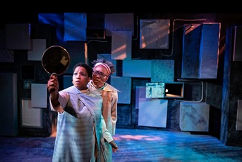 Where bull-jean stories follows a sequential narrative, and includes a number of colorful characters, female and male, each with distinctive personal qualities, bull-jean/we wake is an out-of-time experience, more ceremony than story, evoking bull jean and some of those whose lives crossed with hers, but from a vantage point set in the present, or perhaps even the future–the costumes (inventively designed by Amber Brown) have the look of leisure-wear for space travel, with A-line coats drawn at the collar but open in front, and lapels resembling large petals, as if the heads of the two actors are the buds of blossoming flowers. Entering the theater, we hear the playwright's recorded voice reading a series of numbers–some whole numbers, some with decimal extensions. They are not in standard numerical order and pauses between each number suggest the speaker is waiting for something to occur before moving on to the next. On the wall at the rear of the stage is an assemblage of quadrilateral panels of different sizes, some flush with the wall, others protruding out a bit, some patterned, others textured. An old wooden trunk sits in the center of the stage, and on either end of the set a boulder protrudes from the ground, the latter suggesting we are outdoors. The house lights seem already dimmed by half as we are seated. Without further dimming, or any announcement or ceremony, the actor Aimee K. Bryant walks down the aisle and on to the stage, and thus we begin. Bryant is soon joined by Omi Osun Joni L. Jones, the other performer in the piece. Bryant has been gathering up debris scattered on the floor–pinecones, perhaps some shells–and placing them in a see-through plexiglass box. When Jones arrives, she carries two jars, each filled with a brightly colored liquid. Jones opens the front of one of those quadrilateral panels, revealing a cabinet in which the jars are placed, as is Bryant's box, and a hand mirror retrieved. Jones and Bryant stand together, peering intensely into the mirror and declaring what they see and how they are seen. They each say, "I want you to see me," but in different ways. Bryant's statement conveys yearning, the scorch felt by someone who wants to be seen but is not. Jones' statement conveys pride, as if proclaiming that she is honoring those who are watching by allowing them to see her. bull-jean/we wake continues in a series of scenes, each introduced with a number, again the recorded voice of the playwright. In each scene, objects are similarly retrieved from the cabinets built into the wall, to be played with, cradled, or meditated upon by Bryant and Jones. As they do so, they issue incantations about bull jean, about folks bull jean shared her world with, and about universal feelings that course through their veins as they did through bull jean's. In one case an antique, crank-up record player emits the music of a wailing, old soul blues singer, the scratches on the old record paying honor to the tenacity of the singer who can still express her truth a hundred or so years after she began. Movement is another key part of the ceremony carried out by the two women, their bodies undulating in deliberate rhythms. In some sequences, light and sound pours creating physical phenomena like winds that the two performers brace themselves against. Throughout, Jones' response to the objects drawn from the cabinets to the elements of nature, and the words that reveal the life of the heart appears to come more easily, as if her relationship with her past and present are a source of pleasure, while Bryant seems often to struggle with those same stimuli, at one time exhibiting spasms as if trying to exorcise memories and messages from within. Nonetheless, the ceremony, which runs no more than 50 minutes, spirals slowly but steadily toward a place of joy that embraces both women. The audience is asked to participate with a bit of call-and-respond, and later several audience members receive cards to read from, bringing more voices into the swirl of the event, and by its conclusion both the performers and the audience have access to the state of awareness called for in the title: "we wake." Bryant and Jones both perform with authenticity, creating a sense that they are not "acting out" their parts, but experiencing them. Daniel Alexander Jones directs bull-jean/we wake, maintaining slow but steady pacing throughout. The enigmatic set design is by Andrea Heilman, the fanciful props are the creations of Kellie Larson, the evocative lighting design is by Wu Chen Khoo, and the expert sound design and composition are the work of Peter Morrow. The entire production comes across as a singular piece, in which it is difficult to separate the contributions of writer, performers, director and designers from one another. The result has the synergistic effect of making the totality of bull jean/we woke greater than the sum of its parts. Those who need theater to tell a story or offer distinct characters might choose to stay clear of bull-jean/we wake. I cannot in truth describe it as entertaining. However, "entertainment" is not always what we need. I absolutely can describe bull-jean/we wake as beautiful, poignant, mesmerizing, and saturated with feeling. I walked away with a sense that something very deep within had been touched, something that was part and parcel of Bull-Dog Jean LaRue's daily life but is almost always buried beneath the detritus of twenty-first century living. bull-jean/we wake runs through July, 2, 2023, at the Pillsbury House Theatre, 3501 Chicago Avenue South, Minneapolis MN. Regular price tickets are $25, Pick-your-price tickets are $5 to $24. For tickets and information, please call 612-825-0459 or visit pillsburyhouseandtheatre.org. Facial masks are required. Playwright: Sharon Bridgforth; Director: Daniel Alexander Jones; Assistant Director: Kaelani Burja; Scenic Design: Andrea Heilman; Costume Design: Amber Brown; Composer and Sound Design: Peter Morrow; L