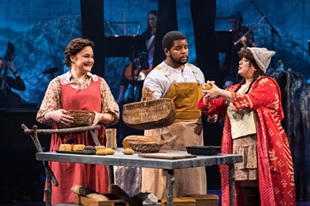 The Guthrie has returned to its pre-COVID practice of closing its season in the Wurtele Thrust Stage with a popular musical and has chosen Into the Woods as this season's offering. As we've come to expect, the Guthrie has bestowed elaborate costumes and stunning scenic elements upon this production. There is also the gift of a twelve-member on-stage orchestra led by music director Denise Prosek beautifully playing Sondheim's lush score, a score that runs the gamut from spritely tunes which can inspire even this senior citizen to go skipping out of the theater, to wistful expressions of hope, to heartfelt melancholy that touch usually protected places in the core of our being. The old tales incorporated into Into the Woods are "Cinderella," "Jack and the Beanstalk," "Little Red Riding Hood" and "Rapunzel." The newly created story is about a humble Baker and his Wife who long to have a child. They learn that when the Baker was a young boy his father angered a witch who then put a curse on the family line, making the Baker impotent. However, the witch is willing–for reasons of her own–to reverse the curse if the couple can, before the next three midnights pass, bring her four specific items, all of which can be found in the woods. It is the pursuit of these items that causes their journey to cross with the other stories. Though things are touch and go, the Baker and Wife succeed, as do the heroes and heroines of the other tales, leading to a happily ever after. But that is only Act One. In Act Two, this motley group discovers that having your wishes granted does not always bring the happiness you thought it would, and that deeds done to make those wishes come true have consequences. It is at this juncture that the adult themes of Into the Woods emerge, dealing with such topics as justice and retribution, loss of loved ones, gaining the empathy to see pain suffered by others through their eyes, giving up personal gain to find strength in community, adultery, and several brutal (though not graphically depicted) deaths. The resolution is eloquently expressed by Cinderella, speaking to her Prince: "My father's house was a nightmare. Your house was a dream. Now I want something in between." The Guthrie's production is directed by Sarna Lapine, niece of James Lapine (who also directed the original Broadway production), so one might imagine she has access to some of the creators' vision for the show. Ms. Lapine directed a 2017 Broadway revival of Sunday in the Park with George, the Sondheim and Lapine show that opened on Broadway in 1984, preceding Into the Woods by three years. Now taking on Into the Woods, she displays a sure feel for the show's elements, and brings to the fore the theme of moving from pursuit of individual goals to the development of a compassionate community able to solve existential threats, recognizing that pitfalls, false starts and sacrifices occur in pursuit of a greater good. In some ways it is a hard-nosed lesson, and also one very easy to relate to the world as it is today. To underscore this perspective, the scenic design by Mikiko Suzuki MacAdams has the raised thrust stage rimmed by what look like layers of scorched earth, and the space separating the playing area and the orchestra is occupied by trees that, rather than forming a thick forest, seem thinned out by blight, fires or drought. There are twenty-two speaking parts in Into the Woods–technically, one of those parts is a "mooing" rather than speaking part, Milky White, the cow Jack trades for magic beans that spur the growth of a beanstalk that reaches clear up to the realm of giants. Also, one character is unseen but has a very significant presence by way of its booming offstage voice. Some of these roles are relatively small, but each character has a distinct personality and contributes in some way to the narrative. With several roles double-cast, the company is composed of sixteen actors, ten of whom are making their Guthrie debuts, and six of those their Twin Cities debut. At the center of the narrative, the Baker and Baker's Wife's wish for a child courses through the entire first act and provokes the calamities of the second act. Robert Knight gives a bravura performance as the Baker, showing us this man's growth from indecisive fumbler, through a journey that includes great disillusionment and loss, to finally respond to the need for leadership, generosity and hope. Knight's voice is a gift, soaring especially in "No More" and "No One Is Alone." As the Baker's Wife, Madeline Trumble has a luminous presence, offering a cheerier take on a role that often casts a nettled outlook on life. Trumble has a lovely voice and gives a superb delivery of "Moments in the Woods," as she makes a reckoning between her values and desires. Emily Tyra is winning as Cinderella, exhibiting resourcefulness to make her wish come true, followed by confusion when she realizes all the baggage that comes with it. Her musings over what to do "On the Steps of the Palace" is marvelously performed. The roles of Narrator and Mysterious Man (usually, though not always, played by the same actor) here go to Regina Marie Williams. Her commanding stage presence makes these roles more central to the narrative arc then I perceived them to be in the past. She joins Knight in the deeply moving "No More," and together they deliver a perfect take. Others giving winning performances include Trevor James, a standout as earnest but dim Jack and brimming with exuberance in "Giants in the Sky"; Suzie Juul, dishing out brio as Little Red Riding Hood, and aptly hedging her encounter with the Wolf in "I Know Things Now"; Sasha Andreev both as the Wolf (who proffers a delightfully cunning "Hello, Little Girl") and as Rapunzel's Prince; and Kim Kivens as Jack's exasperated mother. John Yi is hilarious as Milky White, doing wonders with his eyes, though less credible as Cinderella's charming but philandering Prince. Oh, and that supremely fearsome vo