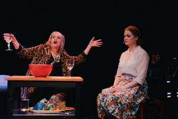 If Ruthless! is well served by Theatre Elision, the show has likewise been good to them, as this run is their third production of the show in their short history as a company. It is easy to see why the artists at Elision would want to come back to this exuberant property, which should also be a good draw for audiences still regaining the theatregoing habit after the COVID debacle. Ruthless! was first staged off-Broadway in 1992, where it had a ten-month-long run. It has had a successful Los Angles run, numerous productions around the country, an Off-Broadway revival, and an award-winning London production. With book and lyrics by Joel Paley and music by Marvin Laird, the show took shape when Paley and Laird hit on the idea of basing a musical on The Bad Seed, a mid-1950s melodramatic novel turned into a play turned into a film about a young girl with evil impulses. The rights-holders to The Bad Seed declined (along the lines of "are you out of your minds?), so Paley and Laird expanded on their original idea, keeping the gist of the narrative, but shifting the context to a showbiz milieu and interspersing references to other iconic films and shows, such as All About Eve, Gypsy, and Gone with the Wind. The score is full of pleasing tunes by Laird that could have been the B-list work of Golden Age musical composers such as Jule Styne, John Kander and Jerry Herman, whose B-list work is still awfully good. If the music doesn't match the best work of those giants, Paley's lyrics are sublimely funny, a cornucopia of arch wit and wordplay. His book is equally sharp, with such zingers as housewife Judy Denmark telling her precocious eight-year-old daughter Tina that she wants Tina to have a normal childhood, only to have Tina retort "I've had a normal childhood, it's time to move on." Tina wants desperately to be a big, fabulous star and sees the school play, Pippi Longstocking in Tahiti, as her first step. She swears that she would do anything to get the lead role, repeating the word "anything" in a menacing tone. Judy has no life but to be "Tina's Mother"–the title of the show's first song. Obsessively domestic, she never stops stirring, with a with a slotted spatula, whatever batter is in a bright red mixing bowl. Judy tries to curb Tina's ambitions, but an aggressively pushy talent agent named Sylvia de la Croix pushes back. Tina loses the part of Pippi to a less talented classmate, but Sylvia slyly suggests to third-grade teacher Ms. Thorn, herself a failed aspiring Broadway actress, that Tina be made the understudy. Thus, the die is cast. There is also Judy's mother, Lita Encore, a theater critic of the ilk that, to borrow a line from Tom Stoppard's The Real Inspector Hound, "goes to the theater to see what went wrong." Lita shows up with gale wind force in a scene-stealing performance by Greta Grosch, going to town with the best number in the show, "I Hate Musicals." By the end of the show–originally done as two acts, but now condensed into a ninety-minute comedic sprint without intermission–Tina has served jail time, Judy has a new name and a penthouse apartment with a scheming personal assistant, and Sylvia de la Croix has spilled her well-hidden beans. The original 1992 production cast a not-quite eleven-year-old Laura Bell Bundy as Tina Denmark, the amoral child star. That preceded Bundy's featured role in the original cast of Hairspray, a stint as understudy to Kristin Chenoweth in Wicked, and a Tony-nominated lead performance as Elle Wood in Legally Blonde. What's more, the role was understudied by then unknown Britney Spears and Natalie Portman. No one with that level of celebrity is in Theatre Elision's production, but no need, as the six cast members are excellent. Amanda Mai is terrific as Tina, persuasively displaying talent that could make her a star (without resorting to being "ruthless"), with a pleasing, belting voice and great comedic timing. Unlike Miss Bundy in 1992, Mai is an adult, but she conveys the demeanor of a spoiled eight-year-old, and later a jaded adolescent, with aplomb. Christine Wade is amazing as prim and repressed Judy, who halfway through has a total personality change, becoming a narcissistic prima donna, singing like an angel in both personas. Sylvia de la Croix, the talent agent without any scruples, was played in the original Off-Broadway, Los Angeles, and London productions by male actors, which may have ratcheted up the show's "camp" quotient. Here, Vanessa Gamble takes on the role and hits the bulls-eye, both in striking all the laugh marks as she slouches through Tina and Judy's lives and in delivering her two big numbers, "Talent" and "I Want the Girl," with a wicked brew of brio and cynicism. Isabella Dunseith is a splendid bundle of nerves as Ms. Thorn, the frazzled third-grade teacher who hopelessly seeks joy by directing school musicals. As Louise, the girl who bested Tina to score the lead role in the school play, Deidre Cochran is required to demonstrate a clear lack of talent, and she does so with comic flair. Later, as the conniving personal assistant, we hear her strong, clear voice singing the louche "Penthouse Apartment." Greta Grosch, as Lita Encore, completes the cast, and as already mentioned, steals the show whenever she appears. A sequence in which she puts together a sandwich, which sounds like straightforward business, is one of the funniest things I have seen on stage in ages. Lindsay Fitzgerald not only directs the production but also designed the costumes, which are themselves comic gems, and the rear-wall projections that establish the settings, such as the Denmark family home drenched in 1950s suburban chic, the elegant penthouse, and the bright lights and marquees of Times Square. Harrison Wade, Theatre Elision's resident music director, does his usual masterful, his keyboard bringing out every ounce of lilt in the score, aided by Miles Wheally on drums. Ruthless can claim to be about the need to be willing to do any