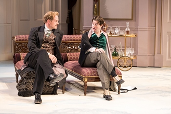 It helps that the director of the current production is David Ivers, who has shown his skill with classic comedic fare at the Guthrie in hilarious productions of The Coconuts in 2015 and Blithe Spirit in 2017. As in both of those plays, Earnest combines a masterfully acerbic dialogue that grins as it skewers, with physical comedy that balances the sophisticated wit of its characters with blissfully outrageous physical hijinks. Ivers directs his players to mine the prospects for humor, both verbal and physical, laying out a treasure trove of both as the play makes its merry way over three acts. Two boon companions, Jack Worthing and Algernon Moncrieff, are meeting at Algernon's well-appointed flat in London, where Jack plans to propose marriage to Algernon's niece, Gwendolyn. In order to pursue his courtship of Gwendolyn, Jack needed a ploy break away from his manor home in Hertfordshire, where he resides with his seventeen-year-old ward Cecily and her tutor Miss Prism. He invented a reprobate brother Ernest living in London, whose carousing and unhealthy habits require Jack to frequently travel to the city to exert damage control. Therefore, Jack from the countryside goes by the name Ernest in the city. When Algernon discovers Jack's deceit, he admits to having one of his own. To escape unpleasant social engagements, particularly those foisted on him by his aunt, the imperious Lady Bracknell (who is Gwendolyn's mother), he has invented a friend who lives in the country, a Mr. Bunbury, whose frequent bouts of poor health require Algy's attention. Gwendolyn arrives with her mother, and Lady Bracknell takes full charge of matters. While she considers the suitability of Jack/Ernest's proposed marriage to her daughter, Algernon becomes intrigued by his friend's description of his ward as both beautiful and wealthy. Despite Jack's objections, Algy devises a way to appear at the manor in order to make Cecily's acquaintance. Toss in a tutor with a secret ambition to be a novelist and a Reverend with ambitions regarding the tutor, and we have a delightful stew of intentional deceptions, misunderstandings, poorly suppressed desires, and creaky societal strictures. One choice this production makes is to move the year it takes place from 1895, to 1905. With the death of Queen Victoria in 1901, that difference of ten years marks a transition from the Victorian to the Edwardian Era. I am no expert on the eras of British culture and history, but I understand that the Edwardian era saw a loosening of the Victorian era's rigid societal strictures. This may be detected in the unexpectedly independent streaks exhibited by Gwendolyn and Cecily, scratching against the old protocols of marriages arranged for them in a businesslike manner. While their temperaments were written into the script by Wilde, the production perhaps expands upon them. Every member of this cast is doing wonderful work. Corey Brill, as Jack, and Michael Doherty, as Algernon, are making their Minnesota stage debuts, but both come with long resumes, including New York stage work. Brill captures Jack's nervous energy, stressed by having to work through his deception of being Ernest in order to clear the way to marry Gwendolyn, and doubly stressed when Algernon turns the tables on his plan. Doherty shows Algernon to be a rampant clown, in perpetual motion, except when striking a pose to make a point, and going through life with a lighthearted air. Both are convincingly romantic, though each in their own way, and the two actors, Brill and Doherty, have wonderful stage chemistry, whether in trenchant argument or celebrating their bond. Adelin Phelps brings effervescent energy and mischief to her depiction of Cecily, resisting her tutor's restraint and ready to leap at the chance to be romanced by a "bad man." Helen Cespedes (another Minnesota debut) imbues Gwendolyn with poise and grace, but also a strong determination to have her way, as when she deftly takes charge of providing a stammering Jack with an explanation of why he created the charade of being called Ernest so that she can forgive him. Both Phelps and Cespedes deliver the wit so vital to the play. Sally Wingert is perfection as Lady Bracknell, wearing her imperious nature as if she would expect the earth to cease rotating were she to demand it. No one can deliver a barbed remark in such an off-the-cuff manner as Wingert. Michelle O'Neil as Miss Prism and Bob Davis as Reverend Chasuble marvelously convey the awkwardness the two feel around one another, more cartoon types than flesh and blood characters, but serving the play well with great humor. Davis also plays Algernon's manservant, Lane, while Daniel Petzold is Merriman, the butler at Jack's estate, both spot on. This Earnest has been given a sumptuous physical production. Susan Tsu designed beautiful, detailed costumes that embrace the Edwardian styles while also being true to character. For example, while all the dresses are stunning, Cecily, who resides in the country, wears a loose-knit outer-dress that seems at home in a bucolic setting, while Gwendolyn's dresses seem the height of fashion a girl making her mark in society would choose, and Lady Bracknell's dresses create a sense of amassing power through sheer volume of fabric–and beautifully selected fabrics, I might add, with no detail spared. And let's not forget her commanding wide-brimmed hats (wide brimmed hats being an Edwardian style). Algernon, the more flamboyant of the play's two young suitors, has a wardrobe to match his playful, attention-seeking personality, and Doherty makes them work. Miko Suzuki MacAdams has created gorgeous sets, including a flower and vine festooned garden setting for the second act and a vast library created for the third act drawing room set. Philip Rosenberg's lighting design and Scott W. Edwards' sound design, with jaunty piano music welcoming us to the playhouse, contribute to production that looks and sounds fantastic. Wilde gav