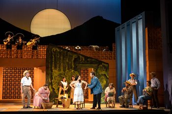 Cruzar la Cara de la Lune begins in 2010, with Laurentino as a seventy-five-year-old man who is dying. Laurentino came to the United States from Mexico as a young man to earn money for his wife Renata and son Rafael back home. He had never meant to stay, but life had other plans for him. Renata died while attempting to join her husband in America and Rafael has since bitterly spurned his father, whom he blames for his mother's death. Laurentino began a new life in Texas, where he is being lovingly cared for by his son Mark and granddaughter Diana. Mark picks up a guitar and soothes his father by playing a traditional song his father sang to him as a child. Diana notes that her father had never played the song for her, a signifier of the erosion of cultural heritage from one generation to the next. Diana is trying to track down Rafael to let him know that his father is dying and has been calling out for him. Perhaps it is not too late for them to reconcile. Mark, however, is ambivalent about connecting with his half-brother, whom he only recently had learned about. In flashbacks we see: Laurentino begin his life with Renata; his choice to go north in order to earn more money; Renata's misery with Laurentino gone most of the time, followed by her decision to make the dangerous journey to join him in "el norte"; Laurentino's grief upon losing Renata and being spurned by Rafael; and Laurentino's later attempt to bridge his estrangement with his now adult first-born son. In a particularly heartrending scene, Renata appears to Rafael as a vision, urging him to set aside his bitterness and turn to forgiveness. The opera–which packs all of this narrative into just one act, ends with Laurentino being granted his wish to be brought home to Mexico and buried in the land he still calls home, with his splintered family at last united. There are brief spoken scenes between most arias, duets, and choral pieces, rather than a sung recitative, so the production gives credits for its lyricists and bookwriter, rather than for a librettist. While that may imply that Cruzar la Cara de la Lune is closer to musical theatre than opera (and there is truth in the notion that lines between the two can blur), Cruzar la Cara de la Lune is rightly identified as an opera owing to the weight the sung elements carry in propelling the narrative and in revealing the swell of feelings within each character's heart. Indeed, the lyrics and musical composition of Cruzar la Cara de la Luna goes further to advance the opera's compelling story and reveal characters than do many acclaimed operas that are completely sung but devote a large percentage of the vocalizing on variations of a single line or phrase, displaying the composer's and the singer's gifts, but doing nothing to shed more light on the character or the conflict at hand. The Minnesota Opera Orchestra plays the mariachi score with attention to the emotional nuance of each scene, from festive to despairing. Conductor David Hanlon was commissioned to create a full orchestration for the Minnesota Opera Orchestra, so every instrument in the orchestra is at the service of the mariachi sound. Three musicians playing traditional mariachi instruments, and costumed accordingly, are on stage throughout the production, usually on a balcony level that overlooks the main action, occasionally mingling with the rest of the cast, as at the wedding celebration. It all sounds wonderful, casting out tremendous vitality. Octavio Moreno brings a beautiful baritone voice to the central role of Laurentino, able to convey the gusto and enthusiasm of a young man starting out on what he expects to be a bountiful life, to the anguish of loss of his loved ones, to the calming resolution of seeing his life become whole at last. Cecilia Duarte is stunning as Renata, her mezzo-soprano fully expressing the character's blend of determination and tenderness. Moreno and Duarte both originated their roles when Cruzar la Cara de la Luna premiered in 2010, so their insights into these characters and delivery of authoritative performances are well earned. As Mark, Efraín Solis' tenor conveys a brooding attitude, as he worries over his father's failing health while resisting a reunion between his father and the Mexican half-brother he has never known. Zulimar López-Hernández brings a brightness to her portrayal of Diana, beautifully singing the soprano part, expressing pure love for her grandfather and a desire to help him find peace as his life comes to its end. Efraín Corralejo, currently a Minnesota Opera Resident Artist, uses his smooth tenor to depict the torn emotions Rafael feels toward his father, whom he identifies as the cause of his mother's death. Vanessa Alonzo, as Renata's friend Lupita, also repeats a role she created for the premiere of Cruzar la Cara de la Luna. Alonzo has a strong presence and is especially moving in a poignant duet with Duarte's Renata. Mateo Huber, playing Rafael as a child, conveys the boy's innocence and vulnerability. Daniel Montenegro as Laurentino's friend and Lupita's husband Chucho and Isaac Quiroga as Victor, the coyote who leads Renata and young Rafael into the desert, complete the outstanding principal cast. The Minnesota Opera Chorus, directed by Celeste Marie Johnson, provide vocal power and the abundant humanity in the Mexican community lost to Laurentino. Stage director David Radamés Toro moves the action back and forth in time and place with clarity, making for seamless transitions. The physical production is a delight, boosted by Arnulfo Maldonado's scene and costume designs, Carolina Ortiz Herrera's lighting design, C. Andrew Mayer's sound design, and co-designers Wendy Zarate Frank and Emma Gustafson's work on wigs, hair and make-up. A large bright moon casts its light on the action; it is the same moon over the span of decades, over Mexico and Texas, providing a point of stability and commonality that unifies the narrative and characters. Becau