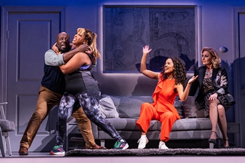 Despite being something quite new, Company was a success. Critics endorsed the show, though not with all-out raves. In a weak year for musicals–its main competition for best musical awards was the mostly forgotten The Rothschilds–it scored a mantel full of trophies and ran for about twenty months. Its success led to a succession of other brilliant musicals by Stephen Sondheim (Follies the next year, A Little Night Music the year after that, for starters), and over the decades, Company has gathered much-deserved recognition as a brilliant and ground-breaking work of musical theatre. Which leads to the most recent Broadway revival (its third) that played in the 2021-2022 season, winning Best Musical Revival, Best Direction of a Musical, and Best Set Design in a Musical Tony Awards and launched the national tour that is running with all cylinders in high gear at the Orpheum Theatre in Minneapolis. Company revolves around a person stepping into the murky waters of middle-age–that is to say, a 35th birthday–without having formed a significant romantic attachment to another person, and moreover, not at all sure if such an attachment is a good idea. George Furth's extremely smart and funny book fashioned this central character as Bobby, a charismatic bachelor who has no trouble drawing women to his side, nor to his bed, but has never gotten to the point of making things permanent. Bobby's friends are five married couples who have gathered to throw him a surprise 35th birthday party, and also to needle him with remarks along the lines of "Isn't it time to settle down?" and "You don't know what you're missing" and "What are you afraid of, Bobby?" The rest of the show freezes that moment as, in his mind, Bobby reconstructs incidents with each of these couples, as well as with three of the comely women he has recently dated, all of which serve to only confuse him more about what he wants. Over the course of his ruminations he does, finally, make a decision, which he expresses in the exquisite final song, "Being Alive." Director Marianne Elliott's brilliant conceit was to turn the male Bobby into the female Bobbie. Instead of three comely women, she is dating three well-chiseled men. She also changed one of the original couples, Paul and Amy, who are engaged and on the brink of their wedding, to Paul and Jamie, a same-sex couple. This change makes surprisingly little difference in the episode in which Amy/Jamie gets cold feet about the wedding ("Getting Married Today"), though some of the joke lines take on different meanings. In fact, the entire gambit of changing Bobby to Bobbie makes surprisingly little difference. It certainly would have made a stir in 1970, when the women's movement was in its early days. The norm then in mainstream culture was for a woman to want to get married–or at least, to act as if she did. Sure, there were exceptions: strong-headed women who shunned convention and charted out an independent course. But Bobby wasn't meant to be an exception; he was meant to be an every-guy kind of guy with a legitimate choice to make. Today it is far easier for Bobbie to also have the opportunity to make that choice. Yes, there still is more cultural pressure on women than on men to marry, but a thirty-five-year-old woman bucking that pressure would not stand out as a rare exception. The touring company is, every one of them, wonderful. Britney Coleman, who understudied the role on Broadway, is fabulous as Bobbie. She presents a bubble of exuberance about her life in front of her friends, and we wonder, is this how she really feels when she is with them or is she playing up the part of happy single gal to counter their nudges toward matrimony? For in a scene where she begins to believe that one of the men she has been dating could actually be the one, only to have that opportunity slip away, Coleman reveals the vulnerability nested within Bobbie's heart. On top of great acting, Coleman has a lovely, strong voice, bringing heart to "Someone Is Waiting," "Marry Me a Little," and that closer, "Being Alive"–all three among Sondheim's most emotionally rich songs. Then we have Bobbie's married friends. Kathryn Allison as Sarah (a part she too understudied on Broadway) and James Earl Jones II as her husband Harry are riotous as she engages in constant physical exercise to suppress the urge to break her diet, while he stifles his desire for a drink since he has been "on the wagon" and poor Bobbie, not knowing about either, has brought a bottle of liquor and a dish of brownies as gifts. The contest of wills leads Sarah and Harry into a jiu-jitsu match, which Allison and Jones play to hilarious full hilt–and let's give credit to fight director Thomas Schall. Matt Rodin gives an incredibly nimble rendition of "Getting Married Today," a song that all by itself proves Sondheim's genius as a lyricist, and plays the panic-stricken groom Jamie to a tee. His Jamie is endearing, if a bit of a drama queen, and well matched to Ali Lois Bourzgui, calm and gentle as his husband-to-be Paul. Emma Stratton plays Jenny to Will Blum's David, each with different but completely authentic and hilarious reactions to getting stoned on marijuana–supplied by Bobbie–for the first time. Marina Kondo is Susan and Javier Ignacio (another veteran of the Broadway run) is Peter, giddily portraying a couple who find they are happier divorced than they were married. Then there is Larry, an upright kind of guy, well played by Derrick Davis, and his hard-drinking wife Joanne, who is alienated from her life as a wealthy, middle-aged woman called on to spend Larry's money and engage in meaningless activities with "The Ladies Who Lunch." That is probably the best-known song from Company, given famously acerbic performances by Elaine Stritch, the original Joanne, and Patti LuPone in the recent Broadway run. Here, Judy McLane is Joanne. McLane is strong in the role throughout the show, and brings dry wit to an early num