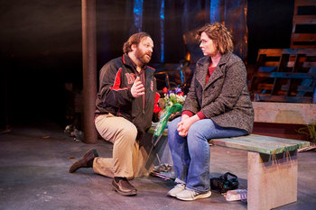 But first, we have Ironbound, which I highly recommend to theatregoers who welcome a play with intellectual and emotional meat on its bones, as well as those who appreciate a bravura performance. That performance is from Brittany D. Parker, who is by turns heartbreaking, infuriating, and inspiring as the central character, Darya. Director Wendy Knox actually has assembled a quartet of four outstanding actors for Ironbound and allows all of them to make their characters indelibly real, not only through the playwright's lines but through small gestures, glances, moves and silences. Darya is a Polish immigrant whom we meet as a 42-year-old woman sitting at a bus stop in an industrial wasteland near Elizabeth, New Jersey. The year is 2014. Tommy (Carl Schoenborn), her on and off boyfriend, is pleading for her to take him back after she learns about his infidelities. Darya needs him–he has steady work for the post office, while she scrapes by with work she detests as a cleaning woman. He has a car while she depends on the erratic local bus service. Still, Darya drives a hard bargain, for it appears that Tommy needs her as well. A big bone of contention is how to deal with Darya's 22-year-old son, who is prone to violence and has recently taken off with Darya's car. In the course of 90 minutes without intermission we see Darya and first husband, Maks (Benjamin Dutcher), in 1990. Darya and Maks immigrated to America together and found work in a factory near the bus stop where the play begins. However, they have different notions of the American Dream, causing a rift between them. Once on her own, Darya remarries, this time to her boss at the factory where she continues to hold down her cherished steady job. This marriage becomes a nightmare and when the factory shuts down in 2006, Darya flees, finding shelter at that same bus stop. We learn this through an encounter with Vic (Jack Bonko), a young hustler. Vic, who is alone in life in quite different ways than Darya, offers her a helping hand, but she is unable to understand his good-hearted impulse. We return from each of those flashbacks to Darya and Tommy. The possibility of Darya finding a port in her stormy life and Tommy finding constancy in his need for companionship, dangles before them, tempting each of them to make compromises that would leave them with less than they may have hoped for, but at least a base to stop their downward freefall and, as Tommy poignantly says, "That's not nothing." Darya responds to a lot of the dialogue with silence and stony expressions, but actor Parker loads those silences, shapes her face and directs her eyes with an eloquence that conveys meaning beyond words. Darya has been put through the wringer by whatever hardships she faced in Poland, followed by disappointment in her life in America, as well as a knack for making bad decisions, certainly with her first two husbands, making her all the more afraid to make another decision, lest it lead her life to descend to even greater depths. Parker makes us feel the conflict between Darya's longings and her fears, leaving her painfully immobile. The only emotion she dares reveal is her anger. Schoenborn is remarkably poignant as Tommy. He does not hold back from letting us see all the ways in which the guy is a loser, and yet, Schoenborn also lets us see a certain naivete in Tommy, a cluelessness about how to negotiate the landscape of the heart, which has left him sad and alone and draws our sympathy. Dutcher gives a strong performance as Maks, Darya's first husband, and his blues musician dreams that are incompatible with Darya's need for security. The two actors present a strong current of sexual attraction between Darya and Maks, but that is not enough to bridge the gap between them. Bonko, who plays Vic, initially seemed older than the high school student he is meant to be, which made his juvenile behavior at first seem out of place. Once it is understood how young Vic is, his performance seems more authentic, allowing Bonko to make Vic's forced gaiety, thinly masking his loneliness, and his intuitive connection with Darya, deeply moving. Amelia Cheever's costumes perfectly match the untethered nature of each character's life, seeming to be patched together from different outfits. Joe Stanley designed a wonderful set that depicts the debris left behind by the shuttered factory, spreading out as litter at the forsaken bus stop where every scene plays out. Sound designer Dan Dukich provides the intrusive noise of cars, trucks and buses, along with apt musical transitions between scenes, and light designer Tone Stoeri casts a sense of twilight over Darya's twenty-four-year saga. Though it is not mentioned in the play, I learned that Ironbound is a neighborhood in Newark, New Jersey, which has historically housed immigrants, including a large number from Poland, and where employment was typically found in the neighborhood's many factories. This makes total sense as the setting for this story of a Polish immigrant woman, even though the published play states it takes please near Elizabeth, an even more industrialized city adjacent to Newark. Prior to knowing it as a geographical reference, I was conceiving of "ironbound" as the constrictions on a life surrounded by hulking factories, heat, noise and grit, placed on the Darya's ability to even articulate her dreams, let alone realize them. I still stand by that understanding of the play's title. While Ironbound is a serious work, it contains humor, albeit of a dark nature, for no one could survive a life such as Darya's without cultivating a sense of humor. I give Ironbound my highest recommendation, along with my gratitude for the return of Frank Theatre in full force. Their production of Fetal will have a return engagement later this winter, and while you are getting your tickets for Ironbound, you may consider, if you missed its premiere run, to catch it as well. Ironbound runs through February 11, 2024, at