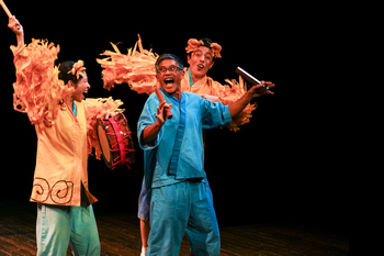 Over the course of fifty minutes, the company shares six stories, along with an interlude halfway that calls for active audience participation, giving the small fry a chance to abate any restlessness, the better to sit through the remainder of the show. The first story is that of the titular carp who, indeed, does not give up. He is infused with determination to swim up a waterfall, even as his four siblings give up along the way. The carp are depicted by means of elegant hand puppets designed by Eric West, gracefully manipulated by the company members. There follows a story about a crane who repays the kindness of an old man by returning in the form of a young woman who becomes the daughter the old man and his wife had always wanted. The crane appears as a puppet as well, a particularly beautiful creation. The other stories include two with mice as their main characters, one with rabbits, and one with lion-dogs. The actors don headbands with the appropriate ears to transform into mice and rabbits, while the lion-dogs are created by means of golden-ribboned jackets that surround the actors. There is also a marvelous sea serpent, a puppet that appears to do battle with the lion-dogs. All of the stories are simple tales, easy to follow but with dramatic turns that delight the audience. Each delivers a moral lesson, such as the value of courage and determination, that it never pays to be greedy, and to believe in yourself to accomplish your dreams. They are accompanied by music performed on three traditional instruments: the stringed koto, considered the "national instrument" of Japan; the shakuhachi, a bamboo flute; and taiko, which actually is a set of Japanese drums, once used to set pace for the military. The instruments, the puppetry, the narration, and the taking on of characters is done by three performers whose love for their work and for their audience radiates forth. They are Mattea Mazzella, who is also the composer of the original music for the show; Serina Dunham; and Hermenigildo Tesoro, Jr., a veteran of Honolulu Theatre for Youth, in is 28th year with the company. All three perform with embellished expression and movement, delivering their meaning with clarity, efficiency, grace and humor. Playwright and director Reiko Ho maintains fluidity both in the arc of each story and in the performance by her cast. Iris Kim has designed costumes based on traditional motifs that allow each performer to don a jacket or coat and transform into a different being and a simple set that features a lantern-lit sky and a stylized mountain landscape. Chesley Cannon's lighting enhances the atmosphere while drawing focus to the action underway in each story. One winning element of the production for me is provided by the audience and not by the talented artists of the Honolulu Theatre for Youth. That is the giggling and calling out by young, unspoiled voices, enthralled by what they see and hear, who allow their honest response to float above the audience toward the stage. Ordinarily in a theater, I do not relish audible commentary by my fellow audience members, but in this case, that commentary is an affirmation that the business on stage is working exactly as intended. This sensitively conceived, imaginatively realized show could serve as a wonderful introduction to live theater for very young children, while older children will continue to be delighted by its storytelling. Adults, meanwhile, will be in thrall of the elegance and authenticity of the presentation. It is a welcome addition to this year's Children's Theatre Company's season. The Carp Who Would Not Quit and Other Animal Stories runs through February 18, 2024, at the Children's Theatre Company, 2400 Third Avenue South, Minneapolis MN. For tickets, please call 612-874-0400 or visit childrenstheatre.org. Bina's Six Apples can be enjoyed by all ages but is especially accessible to very young audiences. By: Reiko Ho and the Honolulu Theatre for Youth Ensemble; Director: Reiko Ho; Original Music: Mattea Mazzella; Set and Costume Design: Iris Kim; Lighting Design: Chesley Cannon; Puppet and Prop Design: Eric West; Additional Props: Sarah Danvers and Hermenigildo Tesoro, Jr.; Technical Director: Eric West; Production Stage Manager: Jenny R. Friend. Cast: Serina Dunham, Mattea Mazzella, Hermenigildo Tesoro, Jr. |