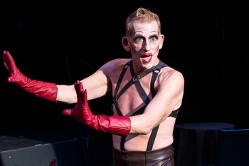 I recently saw that Theatre 55 was to stage Cabaret and decided it was time for me to revisit one of my all-time favorite shows while also making the acquaintance of this company. Theatre 55 has been around for several years, staging productions in which all cast members are age fifty-five and older, no matter the age of the character they play. I had heard good things about their work. Prior to Cabaret, shows Theatre 55 has mounted include Hair, Rent, A Chorus Line, Jesus Christ Superstar, and The Rocky Horror Show–all shows with a youthful vibe and predominantly young characters. Perhaps that was part of why I'd shied clear of their work. I pictured a group of old-timers (knowing full well that I am one of them) trying to relive their young years by way of youth-driven shows. Nothing wrong with that, but I didn't feel drawn to sit in an audience watching it. Cabaret seemed different. One aspect of Cabaret is the parallel tale of two couples at the crux of its narrative: one, a young American writer and a British nightclub singer living a life of gaiety in 1929 Berlin oblivious to the gathering storm of Nazism; the other a much older couple, a German matron who runs a shoddy rooming house and one of her borders, a Jewish widower (the above mentioned fruit-seller), both clinging to a chance at late-in-life love. The juxtaposition between the youth of one couple and the age of the other, and the way they deal with changes in the world around them had always seemed to me to be significant element of Cabaret. I was interested to see how that would be portrayed in a staging where none of the actors could appear visibly youthful. So I went to Theatre 55's production and learned several things. One is that, at least based on this sample, they draw highly talented performers–both as actors and musicians–and director Richard Hitchler is an adroit storyteller, who is skillful at shifting between the two above narratives and the Kit Kat Klub where a lascivious ambisexual emcee presides over bawdy numbers that speak to the values of the era. Second, the Kit Kat Klub girls and boys, whose flagrant sexuality is typically embodied by young men and women, can still be sexually provocative when those bodies are 55 and up. As far as the distinction between the older and younger couples, what happened watching Theatre 55's Cabaret was that age seemed to vanish as a factor. Yes, Cliff Bradshaw, the American writer, and Sally Bowles, the British songstress and impetuous lover, are still meant to be young in years, but it becomes easier to see that Sally's numerous affairs that always ended badly, and her struggle to maintain the fiction that she had something she could reasonably call a "career," are cloaked in a cynicism that made her old beyond her years. As for the older couple, Herr Schulz certainly is up in his years, but he maintains a naivete about the risk posed by Nazism hardwired into him. By necessity, he maintains belief that no one will distinguish him from any other German simply because he was Jewish. His is not the perspective of old men, but the perspective of innocents. The most dynamic feature of Theatre 55's production is Rik Kutcher's mesmerizing performance as the Emcee. He is in control of every moment on stage, delivering the opening "Willkommen" with dazzling confidence, and continuing on with all the Kit Kat Club numbers–"Two Ladies," "Money," "Tomorrow Belongs to Me," and then a louche rendition of "I Don't Care Much," sung as Sally Bowles contemplates her choices. Kutcher takes the song, an exquisitely moody composition, and uses it to corrode any optimism remaining in Sally's life. This is in contrast to Sally's earlier rendition of "Maybe This Time" in which she allows herself to consider that perhaps her string of bad luck will end and she might actually come out a winner. Sally is played by Prudence Johnson, well known for her numerous performances in regional concert halls and clubs, her frequent appearances on Prairie Home Companion, her recorded work, the stage musical Ten November, and other work spanning the past fifty years. She succeeds completely in conveying Sally Bowles' invented allure, her mock sophistication, and her willingness to use whomever she must in order to get to tomorrow. In addition to "Maybe This Time," Johnson nails "Don't Tell Mama," "Perfectly Marvelous," and especially the title song, which she begins with an angry growl, climbing up from the ashes of her latest disappointment, then, in the course of the song, convinces herself, if no one else, that the best possible life is the one that song describes. Jeff Goodson, as Cliff, sings well enough, but has his work cut out for him against Johnson's Sally. He is tentative at the start but comes through with backbone in the second act, enabling him to finally rise against Sally's escapism. Brenda Starr is Fräulein Schneider, who epitomizes the will to survive even at the expense of her happiness. For her, survival is not based on stringing together illusion after illusion like Sally but in facing reality with all its ugliness. Schneider has two brilliant and powerful songs, "So What?" and "What Would You Do?" Starr struggles to convey the wistfulness inherent in the first of those but gives a fiercely raw delivery of the second. She is persuasive in allowing herself to be taken up with the possibility of romance, even a marriage, so late in life. Lawrence Hutera is terrific as her admirer, Herr Schultz, the Jewish fruit-seller, bringing the character vividly to life. He and Starr are delightful sharing the spotlight in "It Couldn't Please Me More," also known as "The Pineapple Song." Lisa Ramos makes a strong impression as Fräulein Kost, another of Fräulein Schneider's borders, who makes her living entertaining sailors. She offers a lovely rendition of "Married" that creates a rare moment of tenderness. As Ernst, a man who befriends Cliff then draws him into treacherous work, Jeff Bieganek i
