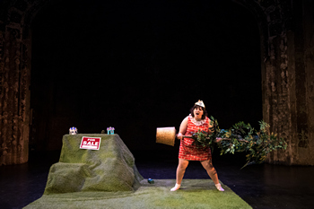 We take our seats in the cozy Open Eye Theatre and look upon a stage blanketed in green AstroTurf. On one side of the stage is a rolling hill, and atop the hill sits a comfortable, traditional-looking house. Without fanfare, Rowe steps on stage wearing a notably short shift-style dress made of a red-brick prin (where does one find such fabric, I wonder?) and informs us that the story they are about to tell is extremely personal, historically accurate, and perfect. As the model house is hoisted away, Rowe proceeds to transform themself from actor to house, implying that this is the story of their house, and dons a cap shaped like a gabled roof to make the look complete. The house itself gives us a tour of its interior, showing off its assets and trying its best to conceal its flaws. Oh, but this house is a woeful structure, what with resident mice, a plumbing problem, a gas leak–which periodically punctuates the play–and a ghost with a mysterious French accent. That no doubt accounts for the house having been on the market, unsold, for 87 months. The house desperately scans the classified ads in the newspaper–after giving us an account of the former newsboy, who won the house's heart before meeting a tragic demise that Rowe manages to make into a funny story–and reads all the other houses listings, marked sold, sold, sold ... but the house does not find itself on that list. It is the day for an open house, stoking the house with great hope that today everything will change and it will once again be occupied. House also hopes that realtor Dan will come through, and finds an audience volunteer to pitch in as Realtor Dan, improvising responses to questions the house tosses at him. Audience volunteers also furnish the sounds of the neighborhood–birds twittering, children laughing, horns screeching–and, in an extremely unexpected moment, one becomes a midwife helping the house, who turns out to be pregnant, to deliver its offspring. Yes, it is farfetched but yields some of the best laughs in a show that is packed with laughs. There is a water problem in the basement. The house calls in a plumber and takes on the part of a demure, helpless housewife putting all her faith in the big, strong plumber, but the problem exceeds the plumber's abilities and the house has to fend–and plunge–for itself, another chance for wacky and ribald physical comedy. When the house decides that what it needs in order to be purchased is a renovation, it goes full bore into a series of aerobic exercises, backed by an energizing soundtrack, with Rowe offering a great parody of humans working out to renovate their bodies. We finally meet the ghost, which occasions a costume change and switch to a French accent for Rowe, some very funny, low-tech tricks with stage lighting, and my first ever experience in audience participation exorcism, which turns out to be a lot of fun. That's the kind of funny business only a mind like Rowe's could dish up. None of this amounts to much of a story, beyond a compilation of the ways in which our houses can burden us, and imagining how ae house would feel (if a house could feel) about the situation. If we are despondent that ours is the one house on the market that can't find a buyer, think how the house feels. It is a funny conceit. Cast with a sense of humor that is equal parts silly and deliciously wicked, and a willingness to throw themselves full throttle into the project, Rowe pulls it off. They even manage to land on a tender resolution which I won't reveal, other than to say that a house–like human beings–does well to find love where it can. The lights dim on the house, happy at last, to the tune of what is probably the sweetest song ever written about a house. Dan Dukich's sound, including very apt musical choices, and Ariel Pinkerton's lighting, which can cast a veil of danger over the humble house, both add heft to this lightweight piece. Rowe and their co-director Michael Torsch have done well to not make Honey, I'm Home into anything more than a lovable, laugh-inducing entertainment, as light and tasty as merengue. Like merengue, it may not offer nourishment, but I have never been one to turn down dessert. Honey, I'm Home runs through February 24, 2024, at Open Eye Theatre, 506 East 24th Street, Minneapolis, MN. For tickets and information, please visit openeyetheatre.org or call 612-874-6368. Created and Performed by Madeline Rowe; Co-Directed and Adapted with Michael Torsch; Originally production made in collaboration with Sophina Saggau, Kevin Fanshaw and Emma Gustafson; Set Design: I'm Staying Home, with Madeline Rowe and Michael Torsch; Costume Design: Madeline Rowe and Emma Gustafson; Lighting Design: Ariel Pinkerton; Sound Design: Dan Dukich; House Built by: Fletcher Wolf; Technical Director: Brandon Sisneroz; Stage Manager: Michael Torsch. |