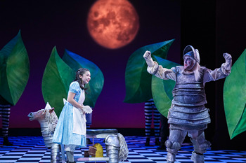 In 1982, Children's Theatre Company presented the premiere of Sharon Holland's stage adaptation, Alice in Wonderland, and has revived it several times in the forty-plus years since. I had not seen any of those earlier productions, so I was especially looking forward to the current revival playing on the theatre company's UnitedHealth Group Stage. In manifesting the joy of imagination celebrated by Carroll, Children's Theatre Company does not disappoint. The show is a cornucopia of fantastic costumes, lighting, sets, and out-sized performances that bring Wonderland brilliantly to life, marvelously performed by as high-octane and highly committed a cast as ever fell down a rabbit hole. If anything, the production may have an overabundance of zeal and horsepower. The rapid-paced staging, directed by CTC Artistic Director Peter Brosius, never fails to hold attention, and the frequent use of the ensemble to shout out squeals of whatever emotion the scene is meant to convey–delight, anger, fear or what have you–should keep even the youngest audience members (the show is billed as appropriate for all ages) tuned in. However, so much commotion and noise sometime overwhelms the story, even as it conveys the disorientation Alice experiences. To be sure, the audience, for the most part, was loving it all, and who can blame them? Such showmanship! Such inspired lunacy! But I kept wondering, how are we to give any thought to the meaning of one of Alice's encounters when the next one comes galloping on its heels? It turns out my companions attending the performance with me, two boys ages thirteen and twelve, expressed the same feeling as we left the theater, both saying it was good–and easily recounting individual parts that were particularly funny or brilliantly staged–but that it felt, as one of them put it, "over the top"–too much to take it all in and make any sense of it. On the other hand, this two-hour (with an intermission) presentation of all that befalls Alice when she becomes distracted listening to her older sister reading a dreary book and follows a white rabbit carrying a pocket watch and exclaiming "I'm late! I'm late!" before diving down a rabbit hole, is a mesmerizing trip. . After a long descent–artfully staged as pantomime in shadow–Alice faces one challenge after another, such as doors she cannot unlock or that she is too large to pass through until she discovers ways to alter her size, becoming smaller or bigger as every circumstance continues to change. She meets a philosophizing caterpillar, a cheshire cat who reveals only his smile, the Mad Hatter and March Hare having a nonsensical tea party, the heavily inflated twins Tweedledum and Tweedle Dee, a melancholy White Knight, a Duchess with a baby that turns into a pig (though, a very cute pig), and Humpty Dumpty determined that he will not suffer any fall, let alone a great fall, all the while in pursuit of the white rabbit. Alice finally catches up with it at the Queen of Hearts' croquet tournament, with flamingos for mallets and hedgehogs for balls. The Queen plays a cutthroat game–literally, as she is wont to order "off with their heads" when anyone displeases her, as it seems practically everyone does. When the Knave of Hearts steals the Queen's tarts, Alice is accused and put on a travesty of a trial. Each of these episodes is delightfully staged and on their own are marvelous entertainments. I was particularly enamored by Humpty Dumpty's fall-defying performance, played to the hilt of merriment by the rubber-limbed Dean Holt; by Tweedledee (Keegan Robinson) and Tweedledum (Antonisia Collins) bouncing about the stage, with Alice getting squeezed between them; and two characters brought to life by Nathan Keepers: first, the Caterpillar, with Keepers as its head, and other cast members following behind as its segmented body, comically bunching up and spreading out as the creature inches along; and then, the White Knight, who is the only character who treats Alice with any real regard, and who delivers an empathic reading of "'Twas Brillig," a nonsense poem that manages to sound wrought with meaning. Keepers is also the March Hare, an apt match to Holt's manically charged Mad Hatter. Two actors rotate as Alice. At the press opening I attended, Audrey Mojica played the part. Mojica, an eleventh-grade student, is already quite a theatre veteran, having appeared in numerous Children's Theatre Company productions over the years as well as productions at Minnesota Opera, the Ordway, and Theatre Latté Da. She shows herself to be maturing into a terrific actor. Her Alice very much comes across as a child, but Mojica never presents her as cloying or wrought with childish fears or tempers. Rather, her Alice is very capable of engaging fully with the peculiar characters and circumstances of Wonderland while maintaining her own distinct presence. She also handles the physical demands of the role, with pratfalls, rolling over backwards, and other stunts routinely required. Aside from Mojica and the other actors I mentioned above, standouts in the talented cast include China Brickey as the imperious Queen of Hearts, Janely Rodriguez as the rather muddle-headed Duchess, and Taj Ruler as the smirking head and front legs of the Cheshire Cat (with ensemble members as its two rear legs and twisty tail, the parts spread apart to accentuate Cheshire's disembodied state–one of the many ingenious presentational devices in this production. The late G.W. "Skip" Mercier, who designed the sets and costumes for this production, passed away in 2021. Mercier's designs have been seen in many past productions at CTC and around the country–he was a resident designer for the National Playwright's Conference at the Eugene O'Neill Center in Waterford, Connecticut. His work earned a Tony nomination and several Drama Desk nominations. The costumes for this production–realized through the efforts of associate costume designer Sarah Bahr–ar