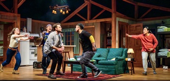 One other key fact is that in 1887, Hells Canyon was the site of a gruesome event, known alternately as the Snake River or the Hells Canyon Massacre. Thirty-four Chinese gold miners were ambushed and killed–hacked to death, based on the evidence gathered–by a gang of robbers. Some of the perpetrators were put to trial, but none of them were convicted. Whether the ferocity of these slayings was triggered only by a desire for the miners' gold, or fueled by anti-Chinese hatred that was rampant in the American West was never proven, but it doesn't seem too hard to hazard a guess. This brings us to Hells Canyon, the new play by Keiko Green being given a lavish world premiere by Theater Mu on the stage of the Jungle Theater. Green has imagined a group of five millennial-looking adults who have arrived at a rustic (though nicely updated) cabin deep in the Hells Canyon wilderness. Four of these characters are in a low-wattage rock band waiting for the big time. Their intent right now is to enjoy being away from the thrum of the city, to re-connect now that two of the band members–married couple Ben and Claire–have returned from a low-profile East Coast tour playing coffee houses and other small venues, and to have a last wild time together before Ben and Claire assume the responsibilities of parenthood. The couple are expecting twin boys, being carried for them by the fifth member of cabin group, Ariel, their surrogate. Though not in the band, Ariel has close connections to it: bandmember Tommy is her brother and bandmember Doug is her ex-boyfriend. Ariel and Doug broke up a year before, and there remains a feeling of discomfort between them. It is of consequence that Ariel and Tommy are Chinese, and that the cabin the group is renting sits on the site of the massacre. Ariel knows this; in fact, she was the only one who knew anything about the massacre, which is certainly plausible as numerous atrocities committed against immigrants, people of color, and indigenous peoples have been left out of history books. She tells her friends about the massacre as well as a rumor that the ghost of one of the miners resides on the property–but only after they have made their way up and down treacherous roads to reach it, and are settled in. But what can they do? There they are, stocked with massive amounts of alcohol, and not really the types to believe old wives' tales about ghosts. Well, if we have learned anything from Chekov, we know that, as with a gun, if a ghost appears in Act I, there will be some spooky action ahead. The play, however, is in no hurry to get there. In fact, the first third or so of it feels more like a sitcom, making sport of it's set up: a rock and roll couple, their surrogate, the surrogates ex, and–as the odd-man-out–the surrogate's brother. For example, there is the matter of sleeping arrangements on the available beds. We laugh as Ben and Claire, who are white, try–pathetically–to present themselves as totally woke to their white privilege, that otherwise would give them the upper hand over Tommy and Ariel–and Doug, who is biracial, Black and white. It's having fun with the current zeitgeist. About a third of the way in, the tone shifts away from light humor, but not yet to the truly dark side. It becomes a power play, triggered by a revealed secret that negates the humor in Ben and Claire's protestations of wokeness. The affluent, white couple is positioned against the striving Asian siblings, with Doug caught uncomfortably between them. This runs through about another third of the play until, Yes! The haunting begins. When it arrives, it is spectacularly staged, using every facet of the artistic team's talents, wondrously webbed together by director Katie Bradley. Hells Canyon looks great. Erik Paulson's set offers a marvelously complete cutaway of a vacation cabin, with a central common area, open-space living room, and kitchen flanked by a bedroom on each side. We also see tall tree trunks through the windows, creating a sense of their humans' space being encircled by nature, perhaps a source of spiritual renewal or, just as likely, a deadly threat. The work of lighting designer Karin Olson, sound designer and composer Katherine Horowitz, projection designers Peter Morrow and Ryan Stopera, and prop designer Kenji Shoemaker collectively creates an atmosphere that brilliantly pits the protective shell of the modernized cabin against the unknown, terrifying (eventually) elements beyond its walls. Fight choreographer Annie Enneking puts her well-known talent to work, managing fight scenes that escalate, like the tone of the play, from playful tussling among guys, to seething tempers triggered for a brawl, to horrendous violence. All five actors in Hells Canyon give committed performances, bringing their characters vividly to life, while Bradley draws effective interplay among them that underscores what connects and what divides these five individuals. Kaitlyn Cheng, as Ariel, gives a stunning performance, starting out reticent and shy–well for one thing, she alone refrains from alcohol in deference to the children she is carrying while the others become increasingly garrulous the more they drink–but as the wheels of the story turn and Ariel begins to reveal secrets, we see her using her reserve as a means of manipulating things to her advantage. Eventually, she becomes a rabid force field, capable of both bearing and delivering terrific pain. Matt Lytle's performance as Ben conveys a nonchalant attitude, a righteous "bro" who enjoys his party time, but whose status as a white, straight, well-off male unwittingly (perhaps) allows him to assume that if someone has to be in charge, it's him. As Claire, Becca Claire Hart depicts a degree of dependency on Ben, as well as a propensity for anxiety attacks, especially regarding the wellbeing of her two unborn sons. Gregory Yang imbues Tommy with a bottle rocket full of energy, whether early on when the energy is 