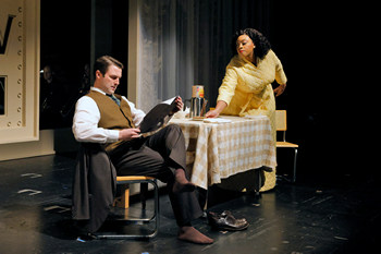 I need not have been concerned. From the time the first note sounded in Trouble in Tahiti until the last round of rousing applause for the outstanding cast and orchestra at the conclusion of Service Provider, I was rapt in the substance, sound and style of both pieces, and engrossed in conversation about the first, Trouble in Tahiti for the entirety of the intermission. I left Luminary Arts not only nourished but elated. Trouble in Tahiti premiered in 1952, and a portion of its score draws on the be-bop jazz of the late 1940s for a Jazz Trio who function as a Greek chorus at the opera's opening and between scenes. Their opening vocalese establishes the setting, by which I mean not only the place–in fact, no specific place is named–but the tone of post-war suburbia with its promise of full gratification provided by material goods in charmed little white houses. The names of affluent suburbs such as Scarsdale, Shaker Heights, Beverly Hills, and Brookline are imbedded in those choruses. We could be in any one of those or a hundred other like towns. Bernstein himself came of age in the upscale Boston suburb of Newton, and clearly found such communities an easy target for satiric criticism. The scenes bracketed by the chorus are the real story of Trouble in Tahiti, depicting a day in the marriage of Sam (Charles H. Eaton) and Dinah (Zoie Reams). Sam commutes by train to his job as an executive at some level, while Dinah stays behind in search of ways to find fulfillment. The two speak little to one another, and when they do it is mostly to express discontents. Theirs is not a happy marriage, but they seem tracked in routines and prescribed roles that they don't know how to change. Their musical themes are more fluid, with a feel akin to Bernstein's ballets for On the Town. In one fabulous scene, Dinah describes the movie she has just seen, called Trouble in Tahiti. Here the music takes a South Seas aura deliberately adapted to please Western ears, such as could be heard on stage in the original run of South Pacific, playing at the very time Trouble in Tahiti premiered. In this case, Bernstein seems to be poking fun at the penchant for Americans to homogenize exotica in order to make it palatable to main street tastes. Stage director Kyle Weiler creatively has devised a fantasia around this scene with the Jazz Trio singers improvising a tropical setting, as Dinah forgets her place and allows herself to dance to sensual island rhythms. In the course of their day, Dinah also sees her therapist, to whom she relates her most recent dream, while Sam makes self-satisfying deals at work, meets with his secretary to allay any trace of a past indiscretion, and prevails in a handball tournament at his gym. In a painful scene, Dinah and Sam unexpectedly cross paths midday. Each invents a lunch appointment they must hurry off to, rather than spend an hour staring over their plates at each other. None of the other characters (Tom's secretary, his clients, Dinah's therapist, and others) speak, underscoring the sense that Sam and Dinah are in control of their narratives–if only they could recognize and seize that control, rather than caving in to the roles and fears that society has drummed into them.