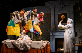 The play is a dead serious piece of work and also uproariously funny. The Martha Washington of the title is just who you think she is: the founding "mother of our country." George Washington died the year before and now, on Christmas Eve 1800, his widow is in ill health and being cared for by a few of the hundreds of slaves she owns, those designated as "house slaves." Because George Washington's will stipulated that upon Martha's death, all of the slaves that had been part of their estate were to be freed, there are concerns that among their large numbers, there could be slaves who would conspire to hasten their mistress's demise. Martha Washington inherited the customary "widow's share," or one-third of a husband's large estate, from her first husband Daniel Custis, who was twenty years her senior and died when Martha was only 26. Included in the estate were thousands of acres, mostly planted in tobacco, and hundreds of slaves to work those fields. Two years later she married George Washington, making the future father of our country a far wealthier man than he had been. Based on historical records, Martha did take heed of the worry that malcontent slaves would plot to do her harm, and she freed those she had inherited from her husband. However, her dower slaves (those she had brought with her as part of her dowry when she married George) could not be freed. Under Virginia law they were to be held in trust for Martha's heirs, being that those heirs were descendants of her first marriage and entitled to the share of their father's fortune that had passed through Martha's hands. Complicated, eh? And vicious when the estate in question is human lives. The enslaved characters in Miz Martha are either uninformed or heedless to any law regarding dower slaves. They want Martha to set them all free right now. All but Ann Dandridge, who is Martha's personal caregiver, and who shares a dark personal history with her. It is notable that she alone among the slaves in the play, has a surname–she and her son William. In spite of always being relegated to the lowest class, Ann has remained loyal to her mistress. She chides her fellow slaves–Priscilla, Doll, Davy and Sucky Boy–for hoping that Martha will die today, even though her own experience enables her to understand their feelings. The women seem even more eager for Martha's demise than the men. When Sucky Boy opines "She weren't hateful," Doll immediately retorts, "She weren't righteous neither." Ann is gratified when Davy suggests they pray for the mistress, though their prayer morphs into an incantation that bodes danger. Martha awakens from a deep sleep to find herself beset by a cavalcade of visitors and anachronous flights of fancy reflecting on her life and times. These include a noisy game show, "Name that Revolutionary"; a song and dance performed by Davy and Sucky Boy, wearing straw boaters and wielding canes; and visitors that include Thomas Jefferson in lounge lizard mode and luxuriously long blond hair; Abigail Adams and Betsy Ross sounding like a pair of valley girls telling Martha how, like, it isn't nice to own people; and Martha's son from her first marriage, Jack (John), though he'd died of cholera at Yorktown during the War. In a particularly gripping sequence–one of the few that are devoid of laughs–Ann's son William gives in to Martha's wish to know what it's like to be him by placing her on a slave auction block, the other house slaves acting the part of buyers inspecting and manhandling her as if squeezing melons at the grocers before they enter into raucous bidding. Finally, Martha is put on trial, as the play's title promises. Doll becomes her non-too-committed defense lawyer, with witnesses including George, Ann, and Martha herself. The play is extraordinarily well written. Ijames' smart dialogue blends insights into the misery suffered by those enslaved and the sense of privilege and entitlement held by even the gentlest of the slave-holding class, while drumming out the humor, albeit gallows humor, that is an essential salve in surviving adversity. While the play's premise is ficticious, the issues it addresses and injustices it exposes are deadly serious, and even today are far from resolved. Director Pirronne Yousefzadeh maintains a matter-of-fact sense about the fanciful business contained in the play, as if to point out that none of it is any more bizarre than the actual history that inspires it. The abrupt changes throughout Martha's ordeal are seamlessly played, without ever a moment's lag. Karen Weiss-Thompson is perfectly cast in the key role of Martha Washington, using her raspy voice and blustery manner to strive for maintaining authority over her enslaved household even as she loses her grip on life, both physically and mentally. It is a tour de force on par with her glorious performance as Dolly Levi in Gal Friday's The Matchmaker some years back. Monica E. Scott makes a strong impression as Ann, credibly balancing her sense of loyalty toward Martha with the grief her enslavement has brought her over the years, and her affinity with the other enslaved people at Mount Vernon. At a crucial point she must make a choice as to where her loyalties will rest, and Scott enacts that scene with chilling certitude. The remaining cast members function beautifully as an ensemble, all outstanding in their individual bits and as a team. Domino D'Lorion, Darius Dotch, Tolu Ekisola, Valencia Proctor and Mikell Sapp all are worthy of praise. D'Lorion, as William, wins us over in particular when showing us the innocence of his childhood, born into slavery yet with tethers to his master's family, and then acknowledges how those tethers dissolve. Matt Lefebvre has designed a wonderful set that clearly establishes the mistress of the house's bedroom above, the kitchen working quarters below, and all manner of hidden and rolled-in places for Martha's fantasia to unspool. Zamora Simmons' has designed costumes and wigs wi