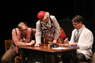 Then there is The Language Archive, Julia Cho's play centered around George (Joe Swanson), a linguist who works at a language archive in an unnamed American city, who is obsessed with the looming extinction of many languages around the world. Theatre Pro Rata has mounted the quirky and thought-provoking play in a polished and wholly satisfying production. George rattles off the numbers and is deeply troubled by them, as he informs us early on: "It's estimated that every two weeks a language dies. I don't know about you, but this statistic moves me far more than any statistics on how many animals die or people die in a given time, in a given place." It's not that George is so cold a fish when it comes to animals or people, but that he sees each language as the chassis of a culture, a way of life, a world. He believes that when a language dies, the world it animates will follow. Actually, George is rather a cold fish in regard to people, though not on purpose. In spite of his passion for languages, he has lost the language–if he ever had it–to communicate with his wife Mary (Megan Kim) so much that he is blindsided by her dispassionate announcement that she is leaving him. To be fair, Mary is not so much better a communicator with George than he is with her. Her attempts are in the form of cryptic notes scrawled on scraps of paper left for him to find in random spots. Sample: "Husband or throw pillow? Wife or hot-water bottle? Marriage or an old cardigan? Love or explaining how to use the remote control?" Her messages, albeit indirect, are obvious (actually, somewhat brilliant) assessments of their marriage, but George has no words to respond. His heart experiences a desperate desire for her to stay, conjuring "If you leave, my heart will be a city in ruins," but he has no access to these words. His language is lodged in another part of his being, which instead tells Mary that these notes (which she denies writing) are a sign she is having a mental crisis and needs help. He makes no effort to grasp the nature of that crisis, let alone the part he plays in it. Likewise, at the Language Archive, George is unable to decode clear signals–nonverbal though they be–from his assistant Emma (Eva Gemlo) that she harbors strong feelings of tenderness for him. Emma herself doesn't recognize these feelings until unleashing them during a lesson with her Esperanto teacher. Esperanto is a language invented by a Polish doctor named L.L. Zamenhof in 1887 in an attempt to create one language for all mankind, thereby ending misunderstandings and fostering a world without war. It is ironic, for Emma is learning Esperanto in order to impress George, yet neither can really communicate with the other any language. By this time, Alta (Wini Froelich) and Resten (Nick Menzhuber) have arrived. They are an aging couple dressed in a sort of Alpine-Balkan-mix of attire (in clever costume designs by Mandi Johnson) who are the last two surviving speakers of Elloway, a fictional language. George has flown Alta and Resten to the U.S. to record them conversing in Elloway before the language perishes along with them. No sooner are they seated in George's lab than they start squabbling with considerable vitriol–and in English. George is aghast at their demeanor, even more so because they are not speaking in Elloway. They explain that Elloway has no vocabulary for anger, so when they are angry they revert to English. For them to converse in Elloway, they must put aside their anger, which seems unlikely to happen anytime soon. Their arguments are actually quite funny, showing Cho to have sharp comedic chops, but for George their speaking in English is a blow upon a bruise, as it falls atop Mary's leaving him. Meanwhile, Mary, having taken off without a plan, meets a mysterious baker who helps her find her way. Emma, with the help of her Esperanto teacher and an encounter with the long dead L.L. Zamenhof himself, begins to acquire the ability to use language as a means of becoming fully realized. Eventually even Alta and Resten find their way back to their authentic native tongue. George, though, continues to struggle making sense of it all, as he glorifies language while knowing nothing about communication. Director Nicole Marie Wilder clearly understands communication. She has staged The Language Archive through the ears and eyes of a storyteller, as if we are gathered around a fire while she unspools this yarn, to our delight. The weird thing about it is, the more far-fetched The Language Archive becomes, the more it makes sense. Preposterous coincidences and flights of fancy seem to wear away the barriers that have kept Mary, Emma, and eventually even George from grasping that language is just words unless understanding is attached to them. Five aces appear on the stage, bringing The Language Archive to vivid life. Swanson is perfect as the perplexed George, his capacity for engaging life locked out of the intellectual tower in which he resides. Swanson's physical response, with shoulders and eyebrows, to the baffling behaviors that surround him, gives the character the air of a tragic clown. Gemlo silently radiates beams of Emma's love for George, even before she begins to examine her feelings. She then persuasively moves Emma through a transition from self-denial to self-actualization. Kim portrays Mary's vacuous persona, worn away by years of scraping against George's unyielding surface, then reveals Mary blossoming, not as a giant bouquet, but as a simple bud, finding its singular, satisfying place in the world. Froelich and Menzhuber are perfectly matched as the bickering Ellowayans, Alta and Resten. They have great timing and make superb use of their accented English (credit to dialect coach Gillian Constable) to embellish their hilarious sparring. When the tables turn on them and they recover their capacity for tenderness, they convey a folksy warmth that lifts the audience's hearts. Froelich is also winning 