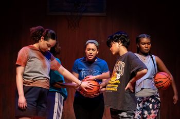 Flex is a well-crafted new play by Candrice Jones, now in a production directed by Tiffany Nichole Greene at Penumbra Theatre. Like The Wolves, it is a top-tier example of the "student sports as a launch pad for adult life" genre. Jones is herself from small-town Arkansas, and her deep knowledge of the turf shows in the specificity of her writing. Flex premiered at Theatre Squared in Fayetteville, Arkansas, in 2022 and was swooped up by Lincoln Center Theatre for a June 2023 production in their Newhouse Theatre, where it was warmly received. This makes Flex a hot commodity, and Penumbra scored big in bringing the play so rapidly to its stage. The Lady Trains are having a hot season, on their way to regionals with their eyes set beyond to the state tournament, which would be a first for the team. If the girls are eager for this chance (and they are), so is Coach Pace, who came near, but not near enough, when she herself was a player and team captain. Starra, who is now the captain, sees the upcoming games and the college recruitment scouts who will be attending as her ticket to the WNBA, her endgame. Back in the day, Starra's mother played on the Lady Trains team with Coach Pace, but she never played in college, joining the army instead. She has died–it is never made clear how she died, or how long ago–and Starra often finds herself talking to her absent mother, seeking advice and laying out her plans. This device lets the audience inside the complex workings of Starra's mind. When the season began, the five A-list players–Starra, Sidney, Cherise, April, and Donna–made a pact to forswear drinking, drugs and sex. Last year, two of the seniors on the team got pregnant and Coach Pace had to enforce her ironclad rule that a girl who is pregnant could not play: the risk of harming themselves or their baby is too great. This is something Coach Pace learned when she herself was a young player, and it made an indelible impression. Before we are far into the play we learn that April, despite the pact, is pregnant. The others, led by Starra, lobby Coach Pace to make an exception to her rule, but the coach is implacable. Starra's biggest concern, though, is Sidney, who moved this year from California to Arkansas with a waft of glamour–her sophisticated haircut, in contrast to the other girls, serves as a marker. Sidney is a star quality player, an asset to the team, but a threat to Starra's fervent intent to stand out to the scouts. Also on the team is Cherise, Starra's cousin and a devout Christian. She serves in a youth ministry and seizes every opportunity to urge the other girls to be baptized. Donna rounds out group. She appears to be the least complicated among them and is the group's peacemaker, forever aiming to smooth over the inevitable spats. Donna is not aiming for an athletic scholarship, and already has plans to attend college in New Orleans. When Cherise accuses Donna of running away to New Orleans, Donna responds that it's not running away, but opening a new door. Still, we are left to wonder what (in Cherise's eyes) Donna might be running away from. Flex covers a lot of plot–perhaps too much, in trying to squeeze in a list of the top issues, rather than sticking to one focal point–but it provides a wide canvass view of the challenges young woman face as they come of age. The sharply written dialogue and excellent performances of all five players make each a real and distinct person, and when bad choices put a freeze on the Lady Trains' comradery, it feels completely authentic. Eboni Edwards is a standout as Starra. The role has the most depth and stage time to reveal her inner life to us, and Edwards delivers full court. One of her gifts is a sly smile that hints at a shield of confidence lain over a pool of doubt. Kalala Kiwanuka-Woernle is excellent as Sidney, conveying a smoother veneer than the other girls, perhaps a nod to her upbringing in the California sun, but with a sharp mind and strong independence that suffers no fools. Tyra Lee Ramsey is terrific as Cherise, persuasive in raising the sanctuary of her Christianity as a remedy for the tribulations of others, but not seeing the contradictions as it applies to her own life. Ramsey keenly expresses Cherise's feelings toward her cousin–disapproving of Starra's transgressions, but protective when Starra faces consequences for her actions. Aubree Chanel Dixon is greatly affecting as April. She conveys a great decency as a human being and is deeply conflicted about her unplanned pregnancy, her desire to play ball, and her awareness that she is in no way ready to be a parent. Charlotte McDaniel is warmly winning as Bonnie, fulfilling the role of peacemaker and sense-seeker that the playwright assigns to her, even as we learn that she has a more complicated inner life. The sixth wheel on the Lady Train is Coach Pace, played with panache by Regina Marie Williams. As an actor who has excelled playing everyone from Dinah Washington to Dolly Levi, Williams breathes a depth of passion into her role, coaching her players not only toward victory on the court but toward integrity in life, while she still carries the burden of a long-past lapse in judgement. Williams fully conveys the hunger this coach has to take the state championship that slipped away from her as a student athlete. Director Tiffany Nichole Greene draws out a naturalistic repartee among the five team-mates, whose demeanor fluctuates between girlish singalongs with the radio, effusive shows of support for one another, and bitchy criticisms and put-downs–all totally true to life. She stages the basketball scenes with vitality, and the "big game" that comes at the play's climax delivers the desired high-stakes tension. Kudos must also go to basketball consultants Tommy Franklin and Faith Johnson Patterson, who had the five Lady Trains on stage shooting, dribbling, and talking like bona fide players. Ruben Arana-Downs' set provides a great facsimile of a b