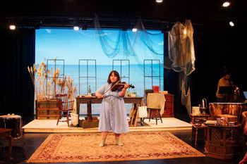 Prior to Elision's 2019 staging of Sea Cabinet, its songs by Gwyneth Herbert and Fiona Bevan and book by Heidi James had only been presented in concert form, and only twice: its premiere in 2010 in Suffolk, England, and a 2013 concert performance in London. The piece was recorded, sung solely by Herbert. Christine and Harrison Wade, co-artistic directors of Theatre Elision, got their hands on the work, but "the work" consisted only of the text and Herbert's solo recording. There was neither sheet music nor orchestrations to be had. The Wades adapted Sea Cabinet as a chamber piece for four voices and created orchestrations using such familiar instruments as piano, stand-up bass, guitar, violin, woodwinds, drums, accordion and xylophone. Then they added both known and found instruments of all kinds, things that could be struck, blown, shifted, dropped, or in some other manner create a sound. Examples include hand bells, a toy piano, the sound of repeatedly drawing out a fistful of small stones from a bowl, blowing on the open necks of beer bottles each with different levels of water, rubbing a wooden spoon back and forth across a wicker grain sifter, and striking an upright suitcase with a drum. This undertaking has paid off with glorious results. Sea Cabinet is set along a stretch of rough English seacoast. The setting is life-affirming, as water is essential for life. It is also rife with danger, as the flooding sea can remove entire villages, and those who seek sustenance from it face the risk of being swallowed up. We hear about a woman longing the absence of a man, probably her lover, who went to sea and never returned. Every day, the woman combs the beach for objects washed ashore by the ebb and flow of the surf–common things, such as shells and broken glass, and uncommon things such as a violin, an infant's shoe, human bones, and a German artillery shell left behind from the war. The woman collects and catalogs every one of these objects. These are the objects in her sea cabinet. They form the basis of some of the songs, along with references to seaside lore and habits, such as: "The King's Schilling," a paean to the lure of the pub; "Alderney," a tribute to the World War II evacuation of one of the Channel Islands; and "I Still Hear the Bells," the legend of the drowned village of Dunwich in the 13th century. Four performers alternate as lead singers of Sea Cabinet's twelve songs–with a reprise of the opening "Sea Theme"–and also play the above-mentioned instruments, along with a trio of musicians set just off stage. Happily, the singers in this return production are the same four who won my heart and made me a devotee of Theatre Elision in 2019: Emily Dussault, Vanessa Gamble, Bex Gaunt, and Christine Wade (who also is the production's vocal director). Each of the four have distinct and beautiful voices, and their harmonies are stunning. I hasten to add that, along with the invented instruments, these four also play some that are standard, including violin, piano, guitar and oboe, so their contributions reflect a host of talents. Dussault and Wade make breathtaking music on a double xylophone, and Gamble even embroiders the score with evocative whistling. The musicians are bass player Chet Goldsberry-Hill and percussionist Miles Whealy, both new to Sea Cabinet, and Harrison Wade, returning to play keyboards, clarinet and accordion, as well as serving as music director. They provide the foundation of the score, giving each song a layer of beach-front on which the singers can plant their instrumental embellishments, like found objects on the beach, all buoyed by the breeze of heart-felt vocalizing. Director Lindsey Fitzgerald maintains a consistent atmosphere of hope fighting to overcome a cast of melancholy–you can judge for yourself whether or not hope wins the fight. Fitzgerald is also the show's designer, using fish nets, well-weathered furnishings, and trinkets to be found in a maritime setting. Andrea Johnson's sound design and Laina Grendle's lighting work in harmony with the production. Those looking for a standard musical, with a straightforward plot, production dance numbers, lavish costumes and sets, and a brassy sound may not find that Sea Cabinet fits the bill. Those looking for something different, something that slows down rather than speeds up the pulse, and presents a meditative experience that draws out the beauty in the human voice, and the depth of the human heart, should definitely find their way to Sea Cabinet while it remains harbored at Theatre Elision. As a bonus, Theatre Elision has launched the "Theatre Elision Forest." Through Tree-Nation, they will support the planting of a tree every time someone donates to Theatre Elision, buys a ticket or punch-card to their productions, or joins their Patreon. Tree-Nation is a non-profit that plants trees to counteract the problem of deforestation, which is judged to be responsible for about 17% of all climate change emissions. As of this writing, 1,703 trees have been planted thanks to Theatre Elision donors and patrons. One could say that with Theatre Elision's production of Sea Cabinet, they are cultivating a meeting of the forest and the sea. Sea Cabinet, runs through May 18, 2024, at the Elision Playhouse, 6105 42nd Avenue North, Crystal MN. For tickets and information, please visit www.elisionproductions.com. Music: Gwyneth Herbert and Fiona Bevan; Book: Heidi James; Photography: Jessica Holleque; Director, Designer: Lindsay Fitzgerald; Music Director: Harrison Wade; Vocal Director: Christine Wade; Sound Design: Andrea Johnson; Lighting Design and Stage Manager: Laina Grendle; Production Associate: Willo Abel Burglechner. Cast: Emily Dussault; Vanessa Gamble; Bex Gaunt; Christine. Musicians: Bass: Chet Goldsberry-Hill; Percussion: Miles Wheatley; Piano, Clarinet, Accordion: Harrison Wade. |