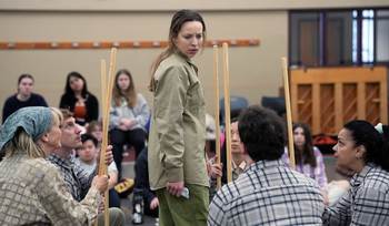 The Spitfire Grill deals with redemption for Percy as well as several other characters. There is Hannah (Michelle Barber), the proprietor of the titular café, the only place to get a meal in Gilead. Hannah has become a crusty, bitter old woman since her golden boy son Eli enlisted in the army to fight in Vietnam and never returned. The pain of losing Eli took a toll on Hannah's husband and stopped his already weakened heart, leaving her a widow. There is also Caleb (Tom Reed), Hannah's nephew who has lost his confidence in the future since the quarry, where he and most of Gilead had been employed, shut down and who struggles to fill the gap left by his adored cousin Eli. Caleb exercises strict control over his wife Shelby (Katie Bradley), but when Hannah agrees to hire Percy to work at the Spitfire Grill, then leaves Percy on her own while she recovers from a nasty fall, Shelby sees an opportunity to be of value by helping Percy, and the two women form a fast friendship. There are a few intertwined strands to the plot, with one of the most intriguing being a raffle to dispose of the Spitfire Grill. Hannah has long been trying to sell the restaurant with no takers. Percy dreams up the idea of holding a raffle and charging $100 per entry. Entrants must send their money, but also an essay about what owning the Spitfire Grill would mean to them. Word of the contest spreads, and Percy and Shelby read some of the submitted essays aloud, bearing testimony to an array of human needs and the endurance of human hope. The Spitfire Grill, as a stage musical, has the same characters and set-up as Lee David Zlotoff's 1996 film on which it is based, but its book, by James Valcq (who also composed the music) and Fred Alley (who wrote the lyrics), makes some significant changes as the plot unfurls, especially in the second act. As a result, whereas the movie ended on a bittersweet note, the musical ends on a note of optimism, celebrating the return of light to a darkened community. Ten Thousand Things' spare presentation style adheres to their standard of scant scenery and leaving all the house lights on so the show paying audiences see is the same one that is presented for free at such locations as homeless shelters, adult learning centers, halfway houses, inner city high schools, and prisons. Co-directors Marcela Lorca and Michelle O'Neil guide the cast to create a fluid delivery of the story, with Valcq and Alley's songs thoroughly integrated into the narrative flow to embellish a moment or express a feeling. There are no break-out dance numbers, but there are occasions when movement, conceived by Jim Lichtscheidl, expands upon a moment in the narrative. Music director Peter Vitale, accompanied for much of the show by actor Tyson Forbes on guitar, beautifully delivers Valcq's score. The songs are largely in a folk music vein. Its melodies and lyrics that reveal the feelings imbedded in the characters so that we come to know them better, to share in their burdens and joys. Going in, I was unfamiliar with the songs, but intend to get my hands on the 2001 Off-Broadway cast recording, as I know I will enjoy hearing these songs often enough for them to become etched in my musical memory. Fried is phenomenal as Percy, being able to call up her fierce defenses when she feels threatened, her resigned defeatism when she considers the odds against her, her guarded optimism when given the chance to help others, and a hint of affection when the possibility of love–which she believes herself unworthy of–crosses her path. Fried sings beautifully, with an emotive, throaty voice reminiscent of Sara Bareilles. Barber fully inhabits Hannah's crankiness and impatience with a world that has let her down, while still indicating an inner spark of kindness that has never been fully extinguished. Bradley's Shelby wondrously blossoms into a woman able to offer whole-hearted friendship and to stand up against a controlling, even threatening, husband, played by Reed. She also sings beautifully and in a duet with Fried, the music coming from their two voices is rapturous. I am accustomed to seeing Reed play characters that are likeable, or loopy, or both, so I was startled to see him as the embittered, controlling, close-minded Caleb, but his persuasive performance had me believing him as the "bad guy" in short order. Dominic Schiro is totally winning as Joe, a sweetheart of a local sheriff, who aims to leave the stifling smallness of Gilead behind as soon as he rakes in the proceeds of an anticipated property inheritance. George Keller expertly delivers a string of comic relief moments as busybody postmistress Elly Krayneck, and Tyson Forbes, in addition to exquisite guitar playing, is a striking presence as a hermit living in the woods outside Gilead. The Spitfire Grill is a feel-good musical, with heart galore, and a winning message about the possibility of climbing out from behind the darkest shadows and finding a life in the sun. Ten Thousand Things' spare production wisely places the focus on the story, the songs, and the characters, with one hundred percent success. It is a show that most anyone would be grateful to have seen; it is especially wonderful that its message, delivered with this degree of artistry, is reaching communities that have scant access to the arts and a great need for their redemptive power. The Spitfire Grill, produced by Ten Thousand Things Theater Company, runs through May 19, 2024, at Hennepin Avenue United Methodist Church; and May 23, 2024 - June 2, 2024, at Jungle Theater, 2951 Lyndale Ave. South, Minneapolis MN. There is a June 9, 2024, performance at the Everwood Farmstead Foundation, E580 County Road X, Glenwood City WI. Remaining free community-based performances are sold out. For tickets and information, please call 612-203-9502 or visit www.tenthousandthings.org. Music: James Valcq; Lyrics: Fred Alley; Book: James Valcq and Fred Alley, based on the film by Lee David Zlotoff; Co-Direc