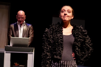 Nimbus is an exciting company because you never know what to expect next in the original plays they produce. Each of their past two seasons they have also mounted original holiday comedies, conceived as spoofs of the flock of Hallmark Channel movies that appear like clockwork at the Christmas season. They have just hit us with another brand-new work, The Brontide, this one in a totally different vein. It was written by Josh Cragun, but developed collaboratively by Cragun and co-directors Ernest Briggs and Mitchell Frazier. The Brontide crosshatches myths related to the origins of stories with a science-fictionalized plot to subvert the universe of stories and place it under monetized, totalitarian control. The play has a comic book sensibility, which I mean as a compliment, for the way it makes quick jumps between scenes, draws its characters in broad swaths, mixing realism with fantasy, and treats its audience as if we share an insider's perspective on the narrative. I was initially flummoxed by the title, figuring that "Brontide" was an invented place or character's name. Turns out it is an actual word used by seismologists and meteorologists, meaning "a low muffled sound like distant thunder heard in certain seismic regions, especially along seacoasts and over lakes, and thought to be caused by feeble earth tremors." In the play, the brontide is the realm where stories originate, presided over by a mysterious personage named Briar, whose appearance can change just as stories do. But wait, I am getting ahead of myself here. The play opens with baby boomer Joe Muckberg, a virtual reality designer working on his latest concept: acquire the property rights to all stories, thereby controlling (through his company, Alpha) humanity's means of creating and passing down its legacy. His next step is to use artificial intelligence to customize stories to each individuals' experience and desires, giving everyone exactly what they want–or what they think they want. To do this, Joe needs a device that allows him to enter the story-verse. Enter two nefarious agents from a sinister-sounding entity called The Firm. They will give Muckberg (they refuse to call him Joe, that's how sinister they are) a device called pandora that offers access to the story-verse, in exchange for control of his creation. Quick cut to Sylvia, a scientist (never clear what branch of science she works on, but in stories like this a scientist is a scientist) who is hiring an over-eager fresh college grad named Raveena as her new assistant. Another quick cut brings us to an indie film company where studio chief Beatrice and her head of production, Eloise, are facing a crisis: they are being sued for theft of intellectual property in every one of their films in production, and their talent is being signed away, all by the same company. The quick cuts continue back and forth, but when the narrative finds its way to the Brontide and characters–first Sylvia, then Eloise–encounter Briar, we linger a while, for Briar has lessons to convey to their visitors, and the lessons are relayed through stories, which are enacted for their edification and our delight. Shadow puppets and full-head animal masks are among the devices used to deliver these archetypal tales with finesse. As in comic books, sometimes the pictures–whether formed by ink on paper or actors on stage–don't clearly let us know what their creator has in mind, but if we have been following along we will get the gist of the moment. By hanging on, soon enough we are back astride the narrative saddle, our sense of direction recovered as we journey through The Brontide's two acts. The tone bounces around a bit too, sometimes mysterious, sometimes introspective, but mostly conveying a tongue-in-cheek attitude. The scenes in which Briar tells a story are fanciful but carry a sense of underlying meaning. As we attend to the ancient fables, we lean in to absorb their import. All of it is a pleasure to sit through. Though the eventual peril of human imagination is at stake, there is no depiction of anything horrific to disturb a young or delicately disposed audience member. Co-directors Briggs and Frazier take their original concept, which Cragun developed into The Brontide, and animate the story, clipping together its episodes at a brisk pace, and maintaining a spirit I would describe as "let's have fun with this first, and think about its ramifications later." They have assembled a strong design team, with Erin Gustafson's set design, Rubble and Ash's costumes, and Nina Gourley's prop designs providing simple but effective visuals to complement the characters and story. Rubble and Ash's playful costumes for Briar are especially delightful. But the heavy lifting is done by Alice Endo's lighting and Dameun Strange's sound, altering the tones from scene to scene to in sync with degrees of plotting, analyzing, mystery, danger and discovery. Strange's sonic creation of the low rumble that is a brontide establishes those scenes as a dimension typically unvisited by mere humans. The cast all gamely put their hearts into the parts they play. Kirby Hoberg, as scientist Sylvia, conveys unflappable stability and rationality, taking each development in stride and open to learning by experiences. Wasima Farah aptly exhibits Raveena's jitteriness as a new entrant in the work force, though her shaky bearing and fast line-reading make it difficult to make out much of what she says. Still, we are able to discern the gist. Peyton McCandless and Starla Larson, as film execs Beatrice and Eloise, deliver the sharp-elbowed dialogue and deal-making brio expected of behind-the-scenes movie hot shots, with Larson's Eloise exhibiting an openness to rethinking reality when she enters the Brontide. Jon Stentz's take on Joe effectively portrays a man whose intellect is infested with an excess ambition, devoting himself to increased wealth and power. Even more sinister are Aleya Berry and David P. Sch