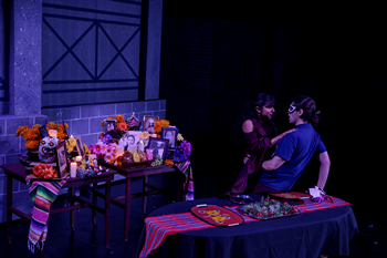 The title Love in a Time of Hate conjures up the ancestral hatred between Shakespeare's two medieval houses, the Capulets and the Montagues, and the turf war between working class white and Hispanic gangs conjured by Leonard Bernstein, Jerome Robbins, Arthur Laurents all Stephen Sondheim (none of whom were working class, nor Hispanic) for West Side Story. Those too were times of hate. Come to think of it, when have we not lived in a "time of hate?" If we honestly look back at any time or place in history, have we not always had factions drawn against one another by differences in skin color, religion or sect, national origin, language, tribal or family loyalties, livelihoods (even Rogers and Hammerstein knew, the farmers and the cowboys were not friends), or social class? Perhaps the color crayon pundits use to fill in our counties and states on an election year map will be added to the list. Love in a Time of Hate zeroes in on urban Latinx life, with both of its antagonistic parties part of that same broad culture–there are no references to national origins, be they Puerto Rican, Mexican, Dominicans, Ecuadorans or any other homeland. What sets these two clans apart is their economic status. The Montagues are steeped in the working class, downtrodden and disenfranchised as they call out creeping fascism and spray-paint anti-capitalist slogans. The well-heeled Capulets are aligned with the elites who control the economy and an government. Indeed, the occasion at which Romeo and Juliet meet–Shakespeare's ball and Broadway's "Dance at the Gym"–is now a political fundraiser, hosted by the Capulets to raise money for a candidate who is a mocking stand-in for the current Republican presumptive presidential candidate. Within this politicized take on the centuries old tale of love and hate, the narrative of Love in a Time of Hate follows Shakespeare's Romeo and Juliet fairly closely. In fact, it makes use of much of Shakespeare's exact language, all of the well-known speeches and dialogues from the play making an appearance. Where there is new text, it uses the colloquial language of today's urban Latinx streets. This new hybrid piece was the creation of director Marco Real-D'Arbelles in concert with the Teatro del Pueblo development team, and the result is wholly successful. This production is not a musical, per se, though there is an opening song sung by Juliet and reprised at the conclusion, and there is music for the dances (with stylish choreography by Lelis Brito) at the benefit party. However, there is almost continuous underscoring performed live by five members of the Bach Society of Minnesota led by Marco Real-d'Arbelles, a brilliant pairing of their artistry with Teatro del Pueblo. There are strains of Bach and his contemporaries, but also the sounds of various branches of Latinx music, as well as the yearning tones of Andean flutes, used to especially evocative effect. Within the context of disdain between the bourgeoise and the working class, made further specific by their Latinx identities, the ill-fated love story is not much changed from Shakespeare's telling of it. One significant change here is in the characterization of Juliet not as an innocent, but an insolent, youth, reacting to her controlling mother's directives not with desperate appeals but with confident diffidence. This Juliet may not yet be experienced, but she knows what she wants in her first and true love, from a physical as well as a romantic standpoint. We can believe this spunky, pouty Juliet is for real. Other changes are that Friar Laurence, who aides the original lovers in sealing their union in the face of their families' opposition, is now Larry the Lawyer, operating out of a storefront that seems to be a combination of tavern and legal aide shop, but still sympathetic to the impetuous couple. The Prince of Verona is now a Marshall, a small accommodation to the time frame. More notable is the addition of a narrator, Santi, who takes the place of the chorus who narrate the opening of Shakespeare's first two acts. Santi is an everyman who lives by his wiles but understands the workings of a multitude of hearts. His presence has a comedic tone, and there are occasions where he slows rather than facilitates the play's progress, but overall, his is a favorable addition to this variation of Romeo and Juliet. Outstanding performances abound. Most central are the altogether winning portrayals of the two lovers, Paulina Aparicio-Rosales as Juliet and Samuel Osborne-Huerta as Romeo. Both actors convey a yearning for true, reciprocated passion, and an eagerness to find that in one another. Both are of short stature which has the effect of making their freshness and youth, relative to those encircling them, stand out, and there is a genuine chemistry between them that makes it easy to understand the impetuous and dangerous choices they make. Julia Diaz is remarkable as the cunning Lady Capulet, compelled to support her class and position even over her maternal bonds, fiercely uttering, "Talk not to me, for I'll not speak a word; do as thou wilt, for I am done with thee" as she rejects Juliet for rejecting the up-and-coming politician Paris' marriage proposal. Abigail Chagolla wins us over as the nurse who has been Juliet's emotional support her entire life. Chagolla brings out the wit, affection, and an ever so slight quality of buffoonery that make the Nurse a winning character. Other strong performances come from Isaac Quiroga a truth-teller in every situation as Santi; Tyler Stamm as the accommodating Larry the Lawyer; Antonié Rios-Luna as Juliet's hot-headed cousin, Tybalt; Alex Barreto Hathaway as Romeo's faithful cousin Benvolio who aims to avoid conflict; and Ben Bailey as Romeo's dearest friend, Mercutio, whose commitment to his friend's honor is his undoing–but not before he winningly delivers the fanciful tale of Mab the Fairy Queen. Kurt Jung's lighting design makes extraordinary use of the brick a