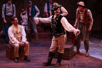 Peter and the Starcatcher's pleasures start with Elice's vastly funny and ridiculous (in the spirit of, say, Monty Python) script, taken from the novel "Peter and the Starcatchers" by Dave Barry and Ridley Pearson. Elice juggles a large number of characters and manages to give each a distinct voice, which helps sort out the intricacies of the plot. Scott Ford's direction maintains a balance between taking seriously the job of telling a cracking good story, and spotlighting a broad wink that excuses all the wordplay, anachronisms, slapstick business, and other elements that toss that story about like a volleyball being kept aloft by players who don't particularly care about the rules. Peter and the Starcatcher takes us back to an English wharf in 1885 with two ships about to set sail. The Wasp, the fastest ship afloat, bears Lord Leonard Aster and a platoon of Queen Victoria's guards protecting a trunk that carries a precious secret cargo. The second ship, The Neverland, is a less sturdy, less swift vessel captained by the shifty Bill Slank. The Neverland is carrying a second trunk, identical to the one on The Wasp, but this one is a decoy. Also on The Neverland is Lord Aster's intrepid thirteen-year-old daughter, Molly Aster; Molly's nanny, Mrs. Bumbrake; and three orphans being shipped out as animal feed–Ted, who can think only of food, Prentiss, the self-proclaimed leader among them, and a sullen boy with no-name, simply called Boy. Boy has been deceived and lied to by adults all his life. He therefore hates grown-ups and vows never to become one. At once, we know this is the lad to keep our eye on. Before the ships even set sail, a switch of the cargo sets the stage for the mayhem to follow. Mayhem it is, what with hanky-panky between Mrs. Bumbrake and a crew member named Alf, the Wasp's crew turning out to actually be pirates led by the nefarious and effete Black Stache, a near-drowning or two, a musical production by newly formed mermaids, indigenous islanders called Mollusks, and an enormous, very hungry crocodile. We also learn that Lord Aster is a starcatcher, whose duty is to protect "starstuff," the powerfully magical bits of stars that fall to the earth. Molly aspires to be a starcatcher like her father and is halfway there. Once we learn this, we have no doubt that the ensuing adventures will give her the opportunity to earn full status. After all, the play isn't called Peter and the Half Starcatcher. The ingenious staging makes wonderful use of the simple wood-hewn set, designed by Peter Lerohl, with Shannon Elliott's lighting and Corinne Steffens sound design blended into the mix to create all sorts of exotic locations and high adventure, from jungles to mountain tops, bottoms of seas, to cramped below-deck quarters. The staging of scenes bobbing in the ocean waves is especially ingenious. It is work that is wonderfully whimsical and also exceedingly practical, as it allows the story to unfold seamlessly, shifting from one setting to another with ease. Samantha Fromm Haddow's imaginative costumes are exquisite, drawing forth the nature of each character. Though not a musical, the play comes equipped with music composed by Wayne Baker that enhances the spirit of the piece, with a bit of choreography by Lauri Kraft to further send it sailing into a sea of whimsy, what with dancing pirates, mermaids, and Mollusks islanders. The cast works hard throughout the show. If they are not a character in a scene, they are likely holding up bits of scenery to create a setting, or carrying another actor to create the effect of a mountain descent. In casting the show, director Ford has found ideal matches for every role. Noah Hynick, who has found somewhat of a home at Lyric Arts excelling in one role after another, is a terrific Black Stache. He has a deft way of delivering comic lines, and his physical presence–pivoting from flourishes to sneers at the drop of a hankie–is terrific. Nate Turcotte is totally endearing as the Boy who becomes Peter Pan, winning us over first with a surliness forced upon him by his wretched existence, and then by proving himself to be a genuine and good-hearted hero. As Molly, May Heinecke conveys unyielding pluck and a sense of her own worth, struggling to hold back the emergence of tender feelings toward the rude but wonderful boy with no name. There is a lovely, innocent chemistry between Heinecke's Molly and Turcotte's Boy. No one could overlook Alex Stokes' divine portrayal of the amorous Mrs. Bumbrake, Eric J. Knutson as stiff-upper-lipped Lord Aster, Brendan Veerman as the ever-compliant Smee, Theo Janke-Furman as would-be leader Prentiss, Parker David Payne as Ted, ever led by his appetite, or Brendan Nelson Finn as both Bill Slank and the Mollusk chief, Fighting Prawn. Others in the large cast (for a non-musical play) contribute winning performances of their own. As I have matured, I certainly see some off the shortcomings in the story of Peter Pan, such as Peter's sexist view of Wendy, his resistance to facing adult responsibility represented by Peter's creed "I won't grow up," and in the derogatory depiction of the Indians living in Neverland (a defect addressed with partial success by the recently revised version of the the Broadway musical presented at the Ordway last December). Peter and the Starcatcher also bears some of this offense, mainly in its depiction of the indigenous Mollusks as comically unsophisticated. Molly, though, has a good deal more spirit and independence than Wendy ever shows, and here, though Peter falls into a realm of never-growing up, he does so after proving himself able and willing to take responsibility, and to care for another with a full heart. One caution, be prepared to strain a bit to understand some of the dialogue, owing to the vagaries of the English accents given to several of the characters. Happily, this does not affect the primary characters and never keeps us from following the plot, but if you are o