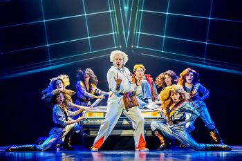 It's hard to believe that it's almost forty years since high school hottie Marty McFly (Michael J. Fox in a dazzling turn in the movie) went from twanging his electric guitar and making plans with his girlfriend Jennifer to inadvertently taking a spin in local eccentric Doc Brown's new creation, a time-travel machine seductively housed in the body of a DeLorean, the ultimate automobile-as-sex-object. When the Delorean lands, Marty is still in Hill Valley, his fictional California hometown, but it is 1955, 30 years earlier. Doc had set that date for the first time travel trip because that was when he first thought of inventing the time travel machine. Unschooled on how a time traveler needs to behave, Marty unwittingly disturbs the time-space continuum–that is, he allows his presence to alter the course of events. This isn't good in any case, and really not good for Marty because his interference may prevent his parents from making the special connection that led to them becoming a Mr. and Mrs., and hence keep Marty from having an existence. He has to think and act fast, manipulating his alcoholic mother Lorraine, now a hot-to-trot high schooler with a raging crush on Marty, though she calls him Calvin; his dad, George, a dweeby pushover as Marty's 1985 father, now as dweeby a pushover as a 1955 teen; Biff, a bully who pushes himself insufferably on the teenage Lorraine and who torments George both in high school and thirty years later as George's boss. Marty must also connect with the thirty years younger Doc Brown, his only hope of finding a way back to his own time, his rock band, and Jennifer. Both as a movie and as a stage musical, Back to the Future is hilarious. Part of the wit in the movie draws on satirizing the mid 1980s, when the movie came out, by way of comparison to the 1950s, and visa versa. Now, in 2024, with a few more decades passed, the mix of nostalgia and riffing on the changes wrought between not two, but three eras makes for even more comic combustion. To wit, Marty's repeated use of the euphemism "that's really heavy" to comment on his predicament when talking with Doc Brown in 1955 spawns a funny line; for us, watching in 2024, the use of the word "heavy" in that context is a throwback to an earlier time and generates a different humorous reaction. Like the movie, Back to the Future: The Musical has a trifecta: science fiction, romantic comedy, and rock and roll. It ices that cake with lots of songs, robust dancing, and dazzling stage effects, more impressive than effects on the screen because we watch, our mouths gaping open, wondering, "What kind of geniuses did it take to pull this off?" Seriously, if the brain-power that makes Marty McFly appear to really travel through time, and the cosmic Delorean lift off the ground, were applied to something like, say, climate change, we might all be able to breath a little easier. To give credit to those brainiacs, we cite video designer Finn Ross and illusion designer Chris Fischer, with sound designer Gareth Owen and lighting designers Tim Lutkin and Hugh Vanstone contributing to the magic, while expertly lighting and providing sound through the entirety of the show. While we are talking about design, Tim Hatley designed the period-perfect costumes and the elaborate scenery that gives the show a sense of being full blown, in comparison to many recent musicals that offer skimpy sets where the audience is expected to fill in the blanks. While this is a musical comedy bonanza from a quality aspect, the show skews to comedy, with a book by Bob Gale who, with film director Robert Zemeckis, co-created and co-wrote the movie. A great many of the situations and a good share of the dialogue on stage come straight from the movie, and it all works just as well in its live rendition. The original songs by Alan Silvestri and Glen Ballard fit in well enough to embellish the story, and provide multiple occasions for the frisky dancing choreographed by Chris Bailey, but none make a lasting impression. Silvestri's greatest contribution is the soaring orchestral theme, written for the movie, which serves as an overture, with underscoring teased out from bits of it throughout the show. A few genuine rock and roll songs that were used in the movie are inserted into the show. To lend authenticity to the mid-1950s high school dance, "Earth Angel," by Curtis Williams, Jessie Belvin, and Gaynel Hodge and recorded in 1954 by The Penguins (their only hit), and Johnny B. Goode," written and recorded by Chuck Berry in 1958 (yeah, the movie is set in 1955, but the song works, so why quibble?). Also returning from the film is "The Power of Love," written by Huey Lewis specifically for the movie. At the time (1985), Huey Lewis and the News were riding high on their bestselling album, "Sports," and "The Power of Love," became a huge hit for them as well. The song shows up near the end of the musical as a feel-good anthem meant to wrap things up, and it accomplishes those aims with a joyful flourish. If you are a fan of the movie, it may be hard to shake the iconic performances by Michael J. Fox as Marty McFly and Christopher Lloyd as Doc Brown. I love them both, but newcomer Caden Brauch as Marty won me over on his own accord, emitting a charisma that melds boyish charm with incipient sex appeal, terrific line delivery and timing, a lithe body that handles physical comedy and dance with aplomb, and even a bit of a catch in his throat, a Fox trademark. Don Stephenson, a veteran, gives a solid performance as Doc Brown, though he is a bit more restrained than one familiar with the movie might expect. When he utters the famous "Great Scott," it's an exclamation all right, but doesn't come across as if his mind is being blown. George McFly appears as Marty's milquetoast dad in the 1980s and a wimpy human punching bag as a 1950s high school student; from the latter status he must summon the bravado to win the heart of the luscious Lorraine Baines. It's a 