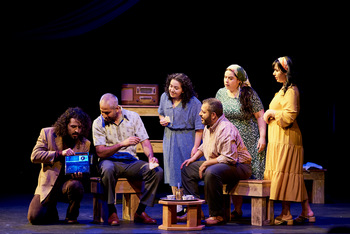 Yes, you know all this–but I lay out that context to tell you how inspiring it is to see Rosette, a play set in the Israeli city of Haifa that tenderly depicts two families who have had to realign their lives to live, in spite of their losses and hardships, with a new normal in the years following those upheavals of 1948. The playwright, William Nour, says that the play is semi-autobiographical. He grew up in Haifa after his Palestinian family was displaced from his family's village, which was razed in the fighting. They were among the Palestinian families who remained in the newly formed state of Israel, far from the community where they had lived for generations. Others from their village fled the land completely, moving into hastily formed refugee camps beyond the borders. Nour's play, in its world premiere production by New Arab American Theater Works at the Mixed Blood Theatre, depicts two families that made it to Haifa, a seaport on Israel's Mediterranean coast. One family is Muslim and one is Christian. Rosette, who is nominally the central character of the play, is the high school-age daughter of Christian parents. Rosette is, in the context of her place and time, a rebel. For example, she wants a bicycle (considered very unladylike) and she suggests that women should be able to wear trousers. Most notably, she wants to complete high school, go on to college, and become a surgeon. Going to college is no easy matter for any of them: her older brother attends college in Russia because the Israeli colleges give preferential admissions to Jewish youth; for a woman, college is an even greater reach. Rosette's father, Yusef, has an appreciation for his daughter's drive and encourages her. However, to her mother Ida, Rosette is a dreamer, and her dreams must be stamped out. Ida would rather have her think about getting married and having children, as girls are meant to do–oh, but her husband must be a Christian. That puts the sweet Muslim boy next door, Omar, out of the running. Omar and Rosette have known each other all their lives, as their respective parents are best friends. It is evident that they share an awkward attraction to one another, much as they try to conceal it. Like Rosette, Omar has a rebellious streak. His father Jameel is very hard on Omar, critical of the boy's every move and utterance, but his mother Maryam encourages Jameel to think for himself. In fact, Maryam is the most forward thinking of any of the four adults, and she dispels the stereotyped notion of repressed Islamic women. In some ways, the 70-minute long one act plays like a double-episode of a sitcom. I mean this in a positive way: the main characters are arranged in two symmetrically composed families, with enough differences among them to generate jokes and create plot points, but with an underlying affection for one another, and a sense of sharing common ground, so that we feel confident their bonds will hold and they will be back for another episode next week. Rosette has two primary plot lines. There is the tension about a letter that Omar writes to Rosette and hides in her book, expecting her to find it, only to have it intercepted by Ida, who is incensed that Rosette is receiving a "love letter" (though no one has actually read the letter) from the Muslim boy next door, never mind that the Muslim boy's mother is her oldest and best friend. The second plot line relates to the high level of anticipation they all have about Rosette's brother's impending visit back from college in Russia. These plots address important feelings and events in the lives of family members and are certainly worth dramatizing–but the wondrous thing is to realize that these normal feelings and conflicts are taking place in the context of extraordinarily difficult political and economic circumstances and that, despite the loss of their homes, the humiliation of riding the bus past the ruins of their village on the way to work, and the scant opportunities for advancement and employment, they remain two families with familiar joys and problems. Moreover, featuring two Palestinian families of different faiths, Christian and Muslim, shows us people with such fundamental differences living side by side in peace. That is not to say there are never conflicts–some slight, such as Yusef bewailing the wreckage of the church in their village with only the bell tower left standing, to be rebutted by Jameel who says he should be grateful for the bell tower as the mosque was burned to the ground, and some more critical. But they recognize the bonds that draw them together are stronger than their differences. At least that was when the play was set, decades ago. One can only hope that were the play set in 2024, the same would hold true. Taous Khazem directs Rosette with a naturalistic feel, creating a sense that we are looking through the windows into the lives of these families. The humor is gentle, drawing on human frailties, simple misunderstandings, and character traits that rub against one another. Though I found myself agreeing, in perspective, with the more modern-thinking of the characters, I liked them all, and saw in all of them the redeeming quality of people trying to live their best lives, based on their understanding of what that means. More serious undercurrents addressing the fact that these six people are refugees and that their lives now are a shadow of the lives they lived before, can be felt, but not in a way that strikes us over the head or draws our attention away from their humanity. Laila Sahir, as Rosette, creates the play's central focus, a young character with the intelligence and guts to believably set her sights on change. Sahir has a loveliness about her that makes it easy to see why Omar is drawn to her and why her mother, in spite of objections to Rosette's words and deeds, cannot help but reach out to her daughter with affection. Leor Benjamin, as Omar, is well matched with Sahir, as he vacillates be