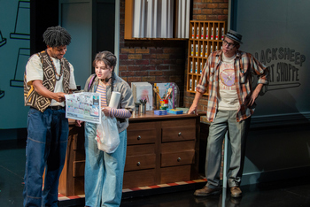 It is the first day of school for Kate (Oliva Lampert alternating with Mars Niemi), a new student at a middle school in Minneapolis. She and her father Matt (Matt Park), who is Korean, moved there over the summer from St. Paul, a short distance measured in miles, but a vast distance in Kate's mind. As a new student, Kate's sense of being different is so extreme that she finds it impossible to speak, either to other students or to her teachers. Some students, like Omar (De'Anthony Jackson), reach out in friendship, but Kate is unable to respond, which only makes her feel more isolated. Then there are super-achievers like Lia (Malia Berg) who reinforce Kate's feelings of inadequacy. Kate's mother died when Kate was seven, so it has just been Kate and Matt. Matt operates a music studio where he gives after-school lessons to neighborhood kids. Kate isn't interested in music, though. Her passion is drawing, which she does constantly, getting herself in trouble when she should be paying attention in class, especially in strict Miss Evans' (Sophina Saggau) social studies class. Kate finds refuge at a neighborhood art supply store owned by a cartoonist named Paul (Jim Lichtscheidl). She begs Paul to give her drawing lessons. He firmly refuses, but her persistence wears him down and a mentor-mentee bond grows between the two. However, Kate's father adamantly objects to her interest in drawing, and conflict ensues in their family. When Matt's aunt (Katie Bradley) comes to visit, she finds her nephew and his daughter at chilly odds with one another. An ingenious element of Drawing Lessons is the use of drawing, made visible on screens above the stage, to flesh out the settings, as well as allowing us to see Kate's work, which becomes a window into her thoughts and feelings. Kate's classmate, Omar, introduces her to comic books, with her interest deepened by Jon (Darrick Mosley), who works at Paul's store between his acting gigs. When her great-aunt visits, she introduces Kate to manhwa, a Korean variation on manga comics produced in Japan. By way of the images on screens, we see Kate's abilities develop as a result of Paul's lessons and the influences that feed her interest. Drawing Lessons takes Kate through her doubts and discomfort and leads her to an appreciation for her family, her peers, and herself. It is an uplifting journey that will have resonance for any in the audience with life experiences that resembles Kate's. Barall has created a set of believable characters, and writes dialogue that rings with authenticity, homing in on each of the characters' temperaments and perspectives. These include Matt's nervous encouragement for a daughter he isn't quite sure how to parent, Paul's disappointment with the current status of his career arc, and especially Kate, who expresses a great deal through silences. Gomo, Kate's great aunt, is especially well conceived, as a woman who has learned to form a life that bridges her traditional past, through a history of conflict, to the fast-past optimism of the present. One could argue that Miss Evans pushes the role of strict teacher, unable or unwilling to engage a student who is clearly troubled, to the edge of stereotype, though that may be how such teachers' students perceive them. Playwright Barall co-conceived Drawing Lessons with Jack Tamburri, who directs the production. Tamburri gives the play fluid movement, with set pieces that roll in and out (the nifty designs are by Junghyun Georgia Lee) in tandem with the projections of drawings (projections by Elizabeth Barrett) that create a universe that is partially concrete reality, partially the expansive impressions of Kate's mind. The compact design for the art supply shop, crammed full of wares with a bulletin board laden with postings of opportunities for artists, is a small wonder. Trevor Bowen's costume designs hit the mark in capturing each character's nature, drawing contrast between the loose-fitting, zero-effort garb worn by Kate with her tightly wound classmate Lia's put together wardrobe. Every performance in this production hits its mark. Park is affecting as a father cluelessly trying to guide his daughter while wrestling with his own demons. Bradley is wonderful as the Great Aunt, Gomo–presenting herself first as a tradition-bound voice of old Korea, and gradually revealing the adaptations she has made to thrive in contemporary American life. Lichtscheidl gives a winning performance as Paul, an artist troubled by waning fortunes and growing doubts, who learns to reinvent himself in the process of helping Kate tap into her gifts. A ubiquitous porkpie hat reinforces his iconoclastic nature. Mars Niemi, who appeared as Kate at the performance we attended, is marvelous in capturing the fears and loneliness that accompany so many middle school students, even without the baggage of losing a parent, changing schools, and feeling culturally apart from one's peers. Jackson is a likeable presence as Omar, and Berg brings depth to Lia's over-achieving Hmong student who is privately miserable. Sophina Saggau fiercely delivers Miss Evans' misguided rigor, and Darrick Mosley is delightful as the life-affirming Jon. Drawing Lessons is set in 1995. While the play has universal themes and a narrative that could take place in any major American city, Barall references actual locations in Minneapolis, like Town Talk Diner (sadly, no longer in business) and Sebastian Joe's Ice Cream, that will appeal to the hometown audience. One note that rings false in terms of fidelity to the Twin Cities setting is when Kate complains about being compared to Lia, saying they are the only two Asian girls in the school, so of course people compare them. Given the Twin Cities' extremely large Hmong community, as well as Vietnamese, Cambodian, Filipino, and other Asian-American communities, it is highly unlikely that a public middle school in Minneapolis would have only two Asian girls enrolled at that time. Of course, tha