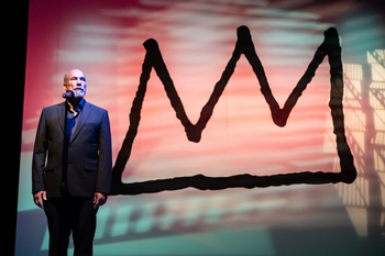 Smith has a long list of credits in film and television and on stage. He made his film debut in 1988 in Spike Lee's School Daze, the same year his friend Basquiat passed away from a heroin overdose. Smith's stage credits include three previous appearances at Penumbra, all of which he both wrote and performed in: the one-man plays Frederick Douglass Now, and Rodney King, and Inside the Creole Mafia, which he co-wrote and performed with Mark Broyard. Having seen the first two listed above, I expected going in to In Honor of Jean-Michel Basquiat to see a dramatic work devised with a blend of poetic vision and searing reality, and I was not disappointed. In Honor of Jean-Michel Basquiat feels less like a play than a meditation, told with great reverence, love, and a touch of anger. The piece tightly integrates Smith's text with the sound design created by Marc Anthony Thompson, Smith's frequent collaborator. Thompson uses the musical genres that were backdrops to Basquiat's life–jazz, hip-hop, beat-box, blues–along with sounds of city streets, sounds of nature, and tonal chords that suggest the pulsations of life. In concert with the sound score, Smith delivers droplets of facts and insights into Basquiat's life, most often in hushed tones. Smith expresses anger–about the inequities that a young Black man inevitably encounters and about a friend lost too soon–without raising his voice or agitating his physical presence, but through subtle turns in his consistent soft delivery, through silent pauses, and eyes lifted up, as if asking "why?" Smith makes connections between all manner of elements in the constellation that surrounded Basquiat's star. His Haitian father fled Haiti with attitudes based on the violence inflicted by the dictator Duvalier on the Haitian people, and these attitudes had bearing on his expectations for Jean-Michel, his oldest surviving child (an older brother died the same year Jean-Michel was born). At age seven he was already drawing human forms when he sustained serious injuries being hit by a car on the street. To keep him occupied during his hospitalization, his art-loving mother brought him a copy of "Gray's Anatomy" that the boy read to inform his drawing precision. We hear about the young artist's life on the street, first as a runaway and then kicked out by his father for dropping out of school, and how that young man of no means created a life of art-making that brought him into the inner sanctums of the art world, being taken up by Andy Warhol as a protégé, and earning $1.4 million a year by his mid-twenties. It was during a period when Basquiat lived in Los Angeles that he met Smith in a dance hall, and Smith draws parallels between their meeting and the meeting of Basquiat's parents in a Brooklyn dance hall. For every aspect of Basquiat's life, Smith draws connections–parallel incidents, events that occurred in the same year or at the same age as other people. On occasion, Smith adopts the guise of another person with such a connection, such as the unctuous auctioneer who sells a Basquiat painting for $110.5 million dollars and a bereaved woman kneeling at the cemetery near Smith, one mourning a sister lost to cancer, the other a friend lost to the weight and speed of his life. Smith drops each new morsel of information upon us like a tear drop, a tear that encompasses both joy and grief. Surprisingly, we are not told a great deal about Basquiat's art itself. Nor are there any projected images of Basquiat's work. Yes, we hear about its origins as graffiti, the primary media being spray paint and blank walls, and that its themes are challenges to the social, economic, and racial status quo, often making satiric jabs at the power structures. But the focus is on the man and his passion, and not the artifacts he left behind. It is ironic–an irony that Basquiat seemed aware of–that it was the well-heeled subject he was satirizing who were spending millions of dollars to add his work to their private collections. Throughout the performance, which runs just under an hour, Smith seldom moves his feet, standing in one spot as if immobilized by the profundity of his subject. He does, however, shift his hips, wave his arms, and adjust his facial composition, all to brilliant effect. In addition to Thompson's essential contributions to this production, Wu Chen Khoo has designed beautiful lighting changes that illuminate, in different hues, a subtle but evocative scenic backdrop painted by Seitu Jones, with the outlined three-point crown that Basquiat often used in his work to mark the subject as a hero. Smith does not offer a reason for presenting this program, honoring a man who was a radically innovative artist as well as his dear friend, at this time. Perhaps there is never a wrong time to pay tribute to such a man. Still, considering that it has been thirty-six years since Basquiat's untimely death, if Smith was moved by some current impulse, whether within his own life or external to himself, acknowledging this might have given the show an added sense of urgency and purpose. And yet, there is no denying the beauty and strength embedded in Smith's text and delivery, nor the stirring integration of words, gesture, sound and light to create a coherent whole, itself a work of art. In Honor of Jean-Michel Basquiat is a beautiful piece of stagecraft that transmits a hero's journey to our eyes, our ears, and our hearts. In Honor of Jean-Michel Basquiat runs through October 27, 2024, at Penumbra Theatre, 270 North Kent Street, Saint Paul MN. For tickets and information, please call call 651-224-3180 or visit www.penumbratheatre.org. Playwright and Director: Roger Guenveur-Smith; Sound Designer: Mark Anthony Thompson; Scenic Painter: Seitu Jones; Lighting Designer: Wu Chen Khoo; Stage Manager: Ronald Alois Schulz; Assistant Stage Manager: Constance Brevell. Cast: Roger Guenveur-Smith Reviewed by Arty Dorman |