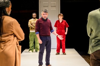I urge you to make time to see The Ally for yourself before trying to answer or dismiss these questions. The play is currently at Mixed Blood Theatre, hot on the trail of its Off-Broadway premiere at New York's Public Theater last winter. It is the first production directed by Mark Valdez since he picked up the reins as Mixed Blood's artistic director following the retirement of founding artistic director (of 46 years) Jack Reuler, though Valez had guest-directed nine Mixed Blood productions over the past eighteen years, so his work had already been oft seen by Mixed Blood audiences. In his directorial premiere wearing the artistic director's cap, Valdez demonstrates a capacity to synthesize the needs of staging a fairly traditional–structurally speaking–play, with the progressive aims of Mixed Blood as an engine for community engagement and social change. In a sweet touch, Valez mounted the stage to welcome the opening night audience, then took a couple of selfies of himself, the audience behind him, to send to his mother. Moses is a Tony Award winning (for the book of the musical The Band's Visit) playwright. His central character in The Ally, Asaf Sternheim, finds himself in a morass of judgments over his ability to be and remain an ally to anyone in a whirlwind of political issues. These issues may or may not be linked, depending on your–and, in terms of the play, each character's–perspective and view of the world's wrongs on a systems level, versus distinct pools of self-contained conflicts. Significantly, the time is established as September, 2023. Asaf is an atheistic Jew raised in Berkeley (as was the playwright), that mecca of progressive thought, and he has gone on to write plays about 18th and 19th century Europe–not exactly in step with the headlines. His parents were Israelis, but left Israel when Asaf was quite young, and he does not identify as an Israeli. His wife Gwen, a second generation Korean-American, has been hired as the community outreach officer of a prestigious university, to which Asaf has relocated with her. There, he tries to discipline himself to work on his writing while teaching one writing class a year as an adjunct at the university. Being an ally comes into question when Asaf's star student from last year, Baron, approaches Asaf to sign a manifesto decrying the police killing of an unarmed young Black man on campus. The murdered man happened to be Baron's cousin. Asaf has remained somewhat aloof from this incident, but when he learns of Baron's personal connection he expresses great concern and is eager to sign the manifesto. However, upon close reading, Asaf discovers that the lengthy manifesto goes beyond demands concerning police brutality and racial profiling to cover other injustices, including Israel's policy toward Palestinians and its illegal occupation of territories held since the 1967 Six Days War. Words like "apartheid" and "genocide" appear, and, though not in any way a religious Jew nor identifying as a Zionist, Asaf is deeply discomfited. To sign or not to sign becomes the question. Factoring into his decision is Gwen's present work trying to reach an accord with the Black community adjacent to campus–the community in which Baron's cousin resided–over the university's plans to expand its campus footprint into that neighborhood. Further factoring in is that (spoiler alert) once he does sign, Asaf, now perceived as an anti-Zionist, is pursued by a left-wing Jewish student working with a Palestinian student to sponsor a new student activist group, and pursued by a Zionistic graduate student of Jewish Studies to withdraw his signature and denounce the manifesto's stand on Israel. It further complicates things that the force behind the manifesto is a local African American activist, Nakia Clark, who–and here is where the playwright, for all his excellent work, stretches the credulity of "small world-ism"–is Asaf's ex-flame. Moses conceives their encounters and writes the ensuing dialogue quite convincingly, and Nakia, as a character who has made a career of social activism, adds a valuable dimension to the play. Still, it seems that tossing in this personal history should not have been necessary for the playwright to make his points, and feels a bit like window dressing that, if anything, perhaps diminishes those points a bit. Nonetheless, the play as a whole functions like clockwork, arguments and positions deftly teeter-tottering back and forth, as the chafing against the purity of Asaf's desire to be an ally begins to painfully burn. Valdez chose to mount the play with a traverse staging–scenes enacted on a runway that divides the audience into two sides, each directly facing that runway. Set designer Eli Sherlock provides a stark white runway floor that curls up on one end, with a portal allowing characters to enter and exit somewhat ambiguously, and with a door on the other end for more definitive entrances and exits. Wu Chen Khoo's lighting design creates pools of light when needed to narrow a character's–most often Asaf's–available space as he feels the constrictions of struggling to be a good ally, a good husband, and, it turns out, a good Jew, while maintaining a sense of himself. Garry Lennon's apt costume designs and C. Andrew Mayer's sound design further build upon the production's strength. All of the other characters engage in verbal sparring with Asaf, who, as the title character, is an unintended hub pierced by these opinionated spokes. Valdez keeps Asaf and his adversaries at different ends of the long white runway, creating a sense of the distance between allies and true believers. Sasha Andreev gives a powerful performance as Asaf, showing us from the start how his whole existence in this college town is an effort to be an ally to his wife, then caught off-guard when his approach to social and political discord–that of a bystander, concerned while watching a house afire and wanting to know if there 