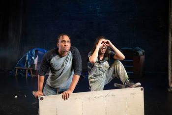 I offer this background as a context for Homo Dramaticus, which is being given a compelling production through a collaboration between Teatro del Pueblo and Pangea World Theater, playing at the Southern Theater. The three plays, Marcha (March), Palabras (Words), and Criaturas (Children), are non-specific in time and place, as is typical of absurdist theater, but it is helpful to know the frame through which Adellach viewed his world. They are performed in English, though their physicality in many regards could override reliance on language. An ensemble of six actors appear variously in the three, bringing each to searing life. Marcha, or March, directed by Alberto Justiniano, presents three women (Paulina Aparicio, Wasima Farah, and Sarah Furniss) in humble garb, marching onward. We don't know what their destination is, and it is not clear that they know either, but they know that they are compelled to continue and that their destiny depends on not giving up no matter what obstacles they face. Those obstacles include shots fired at them at random intervals. One will fall and the others keep marching, each in their own ring of light (excellent lighting design is by Jordan Z. Hall). After some time elapses the fallen woman rises and resumes marching, with the three usually arranging themselves in a different formation, so it would seem that this is a new comrade, come to fill in for a fallen one. On some occasions men (Nate Kay and José Sabillón) come from behind to harass the women, snatching at them and taunting them. Still, the women preserve and march, talking among themselves, at times in a show of mutual support, at other times denigrating each other, and still other times marking the futility of their efforts. They seek someone to make sense of it. "What we need is a politician," and the others respond in turn, "a leader," "a strongman," "a visionary." As the marching goes on, their feet require more effort to move, noting their weariness. In writing Marcha, Adellach surely thought of the Madres de la Plaza de Mayo, who began holding marches in central Buenos Aires in 1977, at first to demand the release of and then to honor the memory of their children who disappeared during the junta's reign. The marches continue every Thursday to this day. Palabras, or Words, directed by Meena Natarajan and Dipankar Mukherjee, opens with the five actors seen in Marcha barreling one by one onto the stage, as if shot from a cannon. They gain control over themselves and begin to form temporary groups, constantly rearranging. Their interactions are sensuous, lascivious, unrestrained. A sixth person enters (Ernest Briggs), adorned in a white robe and reading from a book, beginning "You are the salt of the earth! You are the light of the world!" He goes on, reading the Christian gospel as the other five mock him, taunt him, tug at him, and try to snatch his book away. His words convey nothing of value to them, and they scorn him for his efforts. He perseveres, even as they torment and finally humiliate him. At the end, he is reborn but in a new image that seems more in harmony with his world. Criaturas, or Children, directed by Sir Curtis Kirby III, presents two boys (Nate Kay and José Sabillón) in play clothes as they engage in pretend stories that embody male cultural archetypes, among them: cowboys and Indians, war (fighting both on land and in fighter jets), castaways and astronauts. Their imaginations lead them from one gambit to another, tossing hand grenades, floating on a raft, experiencing zero gravity. They drag onto the stage a kitchen table (circa early 1960) to crawl under, climb atop, or put on end to create their hideouts, cockpits, and other settings. One of the boys seems to be dominant over the other, though each contributes to creation of the narrative that is the basis of their games. They are delightfully imaginative and playful but also chillingly, absorbing traditional macho rules of the way the world works. When one boy protests the way the game is going, the other (the dominant one) earnestly explains to his playmate that "You have to suffer." During as well as between the plays, Vladimir Garrido provides a lush musical soundtrack and effective sound effects such as the zing of a bullet striking its target. Garrido uses stringed instruments, Andean panpipes, and various drums and percussion instruments to accomplish this, and is an indispensable part of the production. Sandy Agustin is credited as the show's choreographer. While I would hesitate to say that Homo Dramaticus includes dance sequences, intentional movement is very much a part of the show, which depends heavily on the physical depiction of its ideas. M. Curtis Grittner's spare set, Abigail Vaughan's costume designs, and Diego Vasquez Rios' sound design also contribute to the almost hypnotic effect of the production. The actors are all deeply committed to the spirit of Homo Dramaticus. Paulina Aparicio, Wasima Farah, and Sarah Furniss are remarkable in revealing a host of different ways, both in physical manner and voice, of portraying the never-ending march. Ernest Briggs marvelously presents the detachment of the priest, committed to his words but clueless in being able to make them meaningful to the people he hopes to save. As the boys at play, Nate Kay and José Sabillón convey the very essence of these childhood rites, so much that their games triggered vivid memories of my own boyhood playing similar games with other boys. Though long established, Teatro del Pueblo and Pangea World Theater have lower profiles than some of our other local theatre companies, and it could be easy to overlook their work. Don't! Homo Dramaticus is compelling, beautifully rendered and deeply thought provoking. The work is challenging, which is what makes it all the more essential. Homo Dramaticus, a co-production of Teatro del Pueblo and Pangea World Theater, runs through November 17, 2024, at the Southern Theater, 1420 Washingt