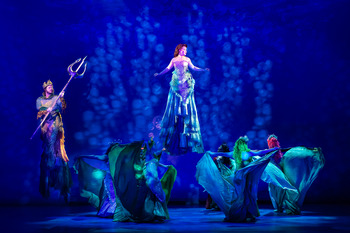After the phenomenally successful stage adaptations of their animated films Beauty and the Beast (1994) and The Lion King (1997), the Disney organization was eager for a third screen-to-stage venture and selected The Little Mermaid. The 1989 film had been a huge success, credited with launching a renaissance in Disney animated feature films after a couple of lackluster decades. The Little Mermaid movie also came with a musical pedigree, its Oscar winning score by Alan Menken and Oscar winning song by Menken and lyricist Howard Ashman. The Little Mermaid began its Broadway run in 2007. It did not receive the critical acclaim, nor did it draw the rapt audiences of Beauty and Lion King, and it closed after 685 performances and 50 previews, a longish run, but not a hit. For a musical full of characters whose fluid motion is a major characteristic, the show was sadly stuck to the ground. The question of how to present a live show with characters, including its heroine, who spend their lives underwater had posed a challenge. Disney turned to Francesca Zambello, known principally as a director of operas, to helm the musical. Zambello's solution was to put the underwater characters on Heelys, footwear with built-in wheels, so the actors could be seen gliding, rather than walking, across the stage. It was discovered, too late, that gliding and swimming are two different things. After The Little Mermaid closed on Broadway, director Glenn Casale was given a shot at it. Casale had great success directing the musical Peter Pan, giving gymnast Cathy Rigby a career in musical theatre. Peter Pan famously has characters that fly above the stage and off into the wings. Taking his cue from Peter Pan and Wendy, Casale, working with flight choreographer Paul Rubin to put the aquatic characters in harnesses. Only their movement through the air signifies swimming, rather than flying–with the actors contributing appropriate body movements to firm up the impression. And it works. Sure, we know they aren't really swimming, just like we know Peter Pan isn't really flying, but the effect allows us to suspend our disbelief and dive in (no pun intended) to the story. That, plus Charlie Morrison's phenomenal lighting, Kevin Foy's sets that make splendid use of scrims, and Amy Clark and Mark Koss's costume designs, place Ariel, the little mermaid, in a watery world. In the plot loosely based on the fairy tale by Hans Christian Andersen, Ariel is the youngest daughter of Triton, King of the merpeople and all of Atlantica. Ariel is the kindest and most beautiful of Triton's seven daughters, and she has the most beautiful singing voice–for some reason, a quality greatly prized by the merfolk. However, she is headstrong, with an unnatural and, in the eyes of her father, dangerous interest in the humans who live above. Against his wishes, she swims to the surface whenever she has a chance to observe them, and dreams about being "Part of Their World." When Ariel espies the human Prince Eric on a sailing ship, she is instantly taken by his handsome visage. A sudden storm sends the prince overboard and Ariel rescues him. She places him on shore and waits on the surf until he regains consciousness, then retreats, allowing him to catch just a glimpse of his savior's face, but he also hears her beautiful song. By now, she is in love with Eric, and he states that he must find the girl with the beautiful face and voice that saved him, in spite of the fact that in three days he will turn twenty-one and be required to select a bride and assume the throne as king. The story that ensues hinges on Ariel making a devil's bargain with Ursula the sea witch in order to fulfill her desire. Also in the mix is the high-strung choral director crab, Sebastian, whom Trident charges with keeping an eye on Ariel; Scuttle, a gull who gives Ariel regular reports about life above the surface, full of misinformation; Flounder, a teenage fish with a crush on Ariel; Ursula's two electric hench-eels, Flotsam and Jetsam; and Grimsby, who has been Prince Eric's guardian since the king's death years before. They all are given a chance or two to sing and dance–and those who are not human, to swim or fly. The plot offers moments of suspense, romance and comedy–the latter particularly in a madcap musical number in which Sebastian faces off against the royal chef to avoid becoming Prince Eric's dinner. The other songs that are holdovers from the original film are terrific–Sebastian and company's pean to the life aquatic, "Under the Sea," lavished with a marvelous production number; Sebastian and Flounder's calypso beat efforts, joined by other animals, to get Prince Eric to "Kiss the Girl"; Ursula's tour-de-force declaration of her creed, "Poor Unfortunate Souls"; and Ariel's Oscar winning "I want" song, "Under the Sea." The staging for "Under the Sea" is the one moment in the show when I wished Ariel would stop swimming and stay still so that the importance of her statement, as well as the loveliness of Menken's melody, could be fully conveyed. The rest of the songs, written for the stage musical, with lyrics by Glenn Slater (Ashman died of complications from AIDS in 1991) are hit and miss. Strongest among them are "If Only (Triton's Lament)"; "Positoovity" in which Scuttle, joined by a few gull-friends, boosts Ariel's confidence in finding her sea legs; "One Step Closer," which opens up into a beautifully staged dance between Ariel and Eric; and a reprise of "If Only" as a quartet in which Ariel, Eric, Sebastian, and King Triton each express their hopes and fears. All of the songs are beautifully performed by a twelve-member orchestra conducted by Brent Canyon, including that rarity, an actual overture at the top of the show. The one weak element in the production is the sound leveling, with the orchestra at times making it difficult to hear actors' voices, and their voices themselves sometimes sounding muddled while singing so that lyrics become ind