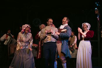 Open Window's A Christmas Carol uses an adaptation of the Charles Dickens novella by Emily C.A. Snyder, which is interspersed throughout with traditional Christmas carols. It remains the story of a wretched skinflint who lives only to make and keep his money–the character who is the basis of the euphemism "scrooge" for a tightwad–scorning Christmas for its goodwill, cheer, inclusion and generosity. He is forever changed one Christmas Eve when the ghost of his deceased partner Jacob Marley visits him, followed by visitations from three more ghosts who take Scrooge on a spirit journey to Christmas past, Christmas present, and Christmas yet to come. Scrooge is thus shaken out of his misanthropic state and embraces the qualities of Christmas that day and all through the year. Snyder's rendition adds brief but significant bits of dialogue, in particular pertaining to Scrooge's past, that serve as his backstory, enabling us to understand, if not excuse, Scrooge's transgressions. In doing so, Scrooge becomes a more fully fleshed out human being than we usually come to know. The separate episodes we are accustomed to seeing in Scrooge's past Christmases become interconnected to depict a fleshed out human being. We see him tormented as a child at school for his poverty and isolation; see his concerns regarding the business sense of Fezziwig, his congenial employer; witness his meeting and courting Belle, who is presented as Fezziwig's niece; see responsibility for his nephew Fred fall to him after his sister Fanny's death; and watch him be lured away from Fezziwig by the glib Marley. Same plot, but the sense of the story being a whole cloth lets us know and understand Scrooge better. This effect is deeply enhanced by Peter Colburn's penetrating performance as Scrooge, which in the course of the play runs the gamut of emotions from ferocity to despair to elation. Our understanding of Scrooge is further deepened by Noah Ratgen's astute performance as the younger Scrooge. Ratgen conveys an earnestness, rather than a callousness, presenting a young man struggling to figure out his life's course, who makes bad choices, as any mortal is prone to do. We see how he slips into his miserly state, and while that doesn't cause us to excuse his later behavior towards ... well, everyone, we have a better grasp of his humanity buried within, even before he himself does. Other subtle but meaningful alterations in the narrative include having several employees at Scrooge's counting house, with Bob Cratchit being their spokesperson rather than the sole employee; Scrooge inquiring of the ghost of Christmas Past whether his sister Fanny walks the Earth in chains like Marley, and being perplexed by the ghost's answer; Scrooge offering condolences to Cratchit (who does not recognize him to be Scrooge) for the terrible loss his family suffers and Cratchit's touching response; and Scrooge's housekeeper appearing early in the play, showing up (as usual) during Christmas future as part of the degrading of Scrooge's estate and returning at the end as Scrooge transforms into a changed man and extends an act of love beyond even what Dickens had conceived. Twelve of the thirteen cast members–all but Colburn's Scrooge–are cast in multiple roles, or are part of the ensemble, or both. Director Joshua Zapata-Palmer, making his professional directing debut with this production, ably handles the transitions, not only between scenes but among actors switching off their parts, to create a seamless whole. Zapata-Palmer makes good use of the simple but effective set (designed by Robin McIntyre), which includes a number of wooden boardwalk sections that are moved about to create different locations, and even to become the Cratchits' dining table. In addition to Colburn and Ratgen's stellar work (Ratgen is also an extremely effecting Fred, Scrooge's warm-hearted nephew, here given even more cause to long for his uncle's company), other standouts in the cast include Jacob Koshiol, excellent as Bob Cratchit and also as Mr. Fezziwig's son, a character Snyder inserted into the play to a powerful effect. Sarah Stanbary conveys the outspoken Mrs. Cratchit with dash, and her heartbroken moments with tenderness. Peter Aitchison is Marley's fearsome ghost, the generous-to-a-fault Fezziwig, and a life affirming ghost of Christmas present. Jillian Ehlke is deeply affecting as Belle, and Meg Bradley makes a strong case for the charity solicitor who, early in the show, shows her great offense to Scrooge's outrageous dismissal of her cause, and is amusing as the choirmaster of young Ebenezer's school. I certainly cannot overlook Justus Heisler, among the most winning Tiny Tims I have seen in decades of A Christmas Carols. The singing of Christmas carols is integrated appropriately into the narrative as well as being used as a bridge during scene transitions. For the most part, the cast sounds splendid lifting their voices in song, though on a couple of the occasions with only two or three singers on stage, the voices are a bit reedy, and on one occasion out of sync with the fine accompaniment by Kurt Larson who plays keyboard, cello, penny whistle, and accordion in the course of the evening. Robert Graff's costumes are wonderful, looking very much in place in early Victorian London, and not so opulent as we sometimes see, which seems proper for the period. Sue Berger's lighting design captures all the nuance of the greatly varied moods throughout the play, and Nate Farley designed a cornucopia of suitable props. Jeremy Stanbary's sound design allows the cast to be clearly heard throughout the performance, though I am not a big fan of the amplified voice given to Marley's ghost. His appearance, to say nothing of his very presence, makes him fearsome enough; the sound effect seems a bit of excess. Overall, this production is thoughtfully mounted and extremely well acted. Snyder's adaptation of A Christmas Carol brings new perspectives to the cha
