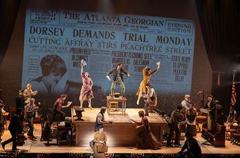 Prince directed the production of Parade that opened at Lincoln Center in December 1998 and closed after just two months, failing to find an audience in spite of the impressive work by all parties. Typical of Prince, it was a large production, perhaps too much so for a fact-based story about a Jewish man lynched by a Southern mob crazed with antisemitism and the lingering belief that the South had lost the war but not been defeated. Despite its lackluster box office, the prestige and awards (besides its Tonys, Parade received the Drama Desk award for Best New Musical and for its book, music, orchestrations, and two lead performances) enabled it to launch a tour, which played the Ordway. Going in, I was already enamored with the score, from repeatedly playing the original cast recording, and rivetted by the Leo Frank story, but I felt that the production, slick and professional, was at a remove from the subject matter. In 2023 a revised Parade (which had been presented the year before in a City Center gala performance) opened on Broadway in a scaled-down production that drew focus more closely to the historic and political significance, and lasting relevance, of Uhry and Brown's creation. It was cheered by critics, and this time the audiences followed. Parade won the 2023 Tony Award for Best Revival of a Musical, and also for Michael Arden's insightful direction. That production's national tour launched this week (after technical previews in Schenectady) at Minneapolis' Orpheum Theatre. Though the venue is mammoth (2,579 capacity compared to 1,092 at the Jacobs, which housed the revival in New York), Arden's conception for staging the show, along with Dane Laffrey's scenic design, maintain a compact feeling, keeping the primary action on a small, raised platform that first appears as a hillock where a young couple are engaged in a passionate farewell tryst before the young man heads off to fight for the Confederacy, assuring his beloved that he will protect "The Old Red Hills of Home." This then transforms into a viewing platform for the 1913 Confederate Memorial Day parade marching through the streets of Atlanta. The strong, gallant soldier is now a crippled veteran. The swell of the music, though, is every bit as impassioned and reverent as the crowd pays homage to its heroes. Leo Frank, a Jewish transplant from Brooklyn, defies the day's spirit of fidelity to the "lost cause" and goes to work at the pencil factory. His position as manager is what brought him to Atlanta and led him to marry the factory owner's niece, Lucille, in what appears to be an awkward and icy relationship. Though they are both Jewish, Lucille is also Southern; to her, Confederate Memorial Day calls for a picnic, while to Leo, the idea of celebrating a war that was lost seems ludicrous as he ponders "How Can I Call this Home?" with the realization that "being Southern's not just being in the South." A 13-year-old factory girl, Mary Phagan, stops by Frank's office to collect her pay. Later that night, Mary is found dead in the factory's basement. With the other workers celebrating the holiday, only Leo, the custodian, and the night watchman who found Mary's body have been in the building. The latter two are Black men, but it is Leo, the Yankee Jew, who becomes the target of scrutiny. The case is inflamed by sensationalistic journalists, an antisemitic evangelist, and an ambitious district attorney who is encouraged by Georgia's governor. Pressure is easily put upon the Black men to bear false witness, and a trio of Mary's friends are driven to invent devilish testimony damning Leo in a mania resembling the condemnation of John Proctor in The Crucible. Leo is found guilty and sentenced to death. Lucille steps out of the shadow to defend Leo, breaking through barriers set before her and igniting a depth of love between herself and her husband. The two extol their newly realized love and bemoan "All the Wasted Time," which in my estimation, is one of the most beautiful songs ever written for any show. How the story ends is recorded in the history books. If you are unfamiliar with the shocking conclusion, I will leave it to you to choose to seek out the story in advance, or wait and experience its full force in Parade. In addition to the use of the small platform for most of the dramatic scenes–expanding to the full stage for epic moments such as public rioting against Leo Frank, street celebrations upon hearing the verdict, and, of course, the parade–this production makes wise use of projections (designed by Sven Ortel) of old sepia-tone photos showing the locations in which the story plays out as well as the actual people depicted in the course of the show. This draws us inward to the grueling fact that this is no hypothetical story, but historically documented events that demonstrate the effect of racism and antisemitism, and a lingering legacy of Southern hatred for what was viewed as elite Northerners. If, in 1998, with Bill Clinton in the White House, Parade seemed like it was needlessly resurrecting a horrible chapter of history, today it may seem to be exposing the roots of the impasse in two discordant arms of our nation's citizenry. The touring company is cast beautifully, with two exceptional leads in Max Chernin as Leo Frank and Talia Suskauer as Lucille Frank. Chernin persuasively conveys Frank's discomfort of being a fish very far from water, a college-educated Jewish New Yorker in the South, and the righteous indignation he expresses at the charges levied against him, which only serves to move the public's opinion of him from disdain to loathing. Suskauer embraces Lucille's frustration at being caught in a disappointing marriage, once thought to be promising, then unleashing her inner strength to fight for Leo's life in "Do It Alone," persevering with grace and chutzpah. The pair's two duets, the ecstatic "This Is Not Over" and the soaring "All the Wasted Time," are gloriously delivered. Andrew Samon