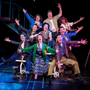 However, the recent opening of their current production, Grease was an exception. The audience was glad to be there and eager to enjoy the show, but for must of us, our minds were fixed on the news that just two days before, Michael Brindisi, longtime artistic director of Chanhassen in his 37th year on the job, had unexpectedly died in his sleep. For many of us, Brindisi and Chanhassen had become almost impossible to separate, and the sudden loss of that talented, generous, gracious, and hospitable leader in our theatre community came as a jolt. Brindisi directed this production of Grease–one of the more than 140 productions he directed at Chanhassen. The company quickly made the decision that they knew he would want–the show would go on. With its high spirits, bouncy score straight from the late 1950s, lively choreography, and powerhouse performances, the show cast its positive energy over the audience, making the evening a celebration, not only of a particular breed of wise-guy innocence that circulated among teenagers in 1959, but also of the ambition and first-rate execution that was as good as guaranteed when Brindisi directed a show. Grease first sprung to life in Chicago, in 1971, created by Jim Jacobs and Warren Casey, with its Rydell High setting based on Jacob's memories of his years at Taft High School in blue-collar northwestern Chicago. The show, much raunchier than the version that made it to New York, played in in a small Chicago club where it was scouted out by New York producers who, after some sanitizing, quickly brought it to the Eden Theatre in the East Village of Manhattan and, by June 1972, to Broadway where it played almost eight years, passing Fiddler on the Roof to become, at that time, the longest running Broadway show ever. The show depicts, with both affection and snark, the concerns and dreams among a group of ten working-class high school students in the waning days of the Eisenhower era. Among those concerns were cars, music, dancing, friendship, honor, dating, sex, and especially, fitting in. As for dreams, they were modest and devoid of lofty ideals–not a word about racial inequality, women's subservience to men, the invisibility of lesbian or gay students, or the degradation of the environment. No one had yet heard of Vietnam (on the world maps it was still marked as French Indochina), let alone worried about being drafted to fight in its jungles. By 1971, all of those "lofty ideals" were being championed by young people coast to coast, raising the ideals of a generation, but also a sense of a past good and simple life that had gone off the rails. With Grease, Jacobs and Casey created an idyllic (even if one of the Pink Ladies does fret over a late period) look at that earlier time, setting off a spree of 1950s nostalgia that led from the stage to the movies (American Graffiti) to television ("Happy Days"). The driving narrative in Grease is about Danny Zuko, a member of a cool, though completely harmless, gang called the Burger Palace Boys, and Sandy Dumbrowski, a new girl at Rydell High. Sandy and Danny met over the summer at the beach, and had what was apparently a sweetly chaste romance, not knowing that they would end up at the same school. When Danny runs into Sandy there, he acts aloof, not wanting to betray his feelings of affection in front of his pals. Sandy, whose overall appearance and habits are of the clean, prim Sandra Dee / Doris Day mode, is out of step with the female equivalent of the Burger Palace Boys, called the Pink Ladies–with matching satin jackets to make sure everyone knows it. The DannySandy romance is off again, on again, off again, and so on, with other plot strands like tough girl Betty Rizzo's anxiety over that late period, Frenchy's decision to drop out of school and pursue her dream of going to beauty school, hotrodder Kenickie's goal of getting a set of wheels, all of them competing to win the hand jive dance-off at the school dance, and a challenge to the Burger Palace Boys to defend their honor against a rival gang (fear not, these gangs are powder puffs, nothing like the gangs in West Side Story). The resolution for Danny and Sandy has always been greatly disappointing in terms of women's self-determination, though there's a good chance that it reflects the realities of 1959 and it enables the show to end with a rousing closing number. Like all the shows I have seen at Chanhassen, the action is briskly paced, one scene fluidly following the other and staged to draw our focus exactly where the next plot point is being made. There is never a moment when characters watch while others are center stage–every character is constantly engaged in some business or other that fleshes out their reality–Brindisi's master touch at work. Choreographer Tamara Kangas Erickson furnishes the show with lively, athletic dance numbers, which the limber cast delivers with swagger, especially big numbers "Greased Lightning," "We Go Together," "Shakin' at the High School Hop," "Born to Hand Jive," "You're the One That I Want," and the finale, a reprise of "We Go Together" paired with "Grease." The songs "You're the One That I Want" (by John Farrar) and "Grease" (Barry Gibb) as well as the teenage equivalent of a torch song, "Hopelessly Devoted to You" (Farrar) were written for the 1978 movie based on the musical, and–having become hit songs in their own right–have been routinely added to productions of the stage show. The cast up on stage does not look anything like a group of teenagers, so anyone hoping to have a good time at this production of Grease must suspend their disbelief and accept that even if they appear to be in their 20s or 30s, they are kids enrolled at dear old Rydell High. With that provision, the cast does a swell job. Sam Stoll portrays Danny Zuko's ambivalence–whether to be the sweet guy Sandy met over the summer, or the tough dude his friends have come to expect–along with terrific singing and dancing