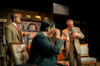 Ron Reed, founder and former long-time artistic director of Pacific Theatre in Vancouver, BC, wrote a play that is largely about this friendship, though skewed to a focus on its title character, Tolkien. The play premiered in Vancouver in 2018, and was picked up by Open Window Theatre where a production was planned for 2020. COVID kiboshed that plan, but at last they have been able to bring Tolkien to its stage, for what is the play's first U.S. production. Similar to Open Window, Pacific Theatre was conceived as a company devoted to works that profess a redemptive quality. It is, then, not surprising that Reed's play focuses on the spiritual leanings of the two great authors and the role those leanings had in their friendship as well as in their writings. Much of the play consists of conversations, often veering into arguments, about the weight their religious views have or ought to have on their written work. Their conversations sometimes include colleagues in an informal literary club called "the Inklings" that met weekly to share excerpts from works in progress, and chat about the larger context of their work: personal, social, political and religious. Tolkien was born in 1892. He was only three when his father died and his mother Mable, though raised as a Baptist, found solace in the Roman Catholic Church and converted to that faith in 1900. Tolkien was just twelve when Mabel died in 1904. She left her two sons in guardianship of a trusted Catholic priest, with instructions to raise the boys to be good Catholics. Lewis was born in 1898 in Ulster and baptized into the Church of Ireland. Like Tolkien, his mother died when he was still a boy, only eight years old. Lewis was sent to boarding school in England and, except for brief periods back home, lived most of the remainder of his life in England. In his adolescence he became disillusioned with religion and became what some would describe as a rabid atheist. It is in the mid-1920s, both having served in World War I, that the two meet at Oxford. Tolkien occupies a prestigious chair teaching philology, an apt outlet for his love of the origins and structures of language. He is exasperated by his students' lack of intellectual curiosity, but takes comfort in the presence of some of his colleagues, among them his friend Hugo Dyson, and an instructor named C.S. Lewis. During the play, Tolkien's wife Edith several times refers to Lewis as her husband's "best," and on occasion "his only" friend. In spite of his admiration for his friend and the pleasure he takes in his company, Tolkien is appalled by his outspoken atheism. Along with fellow writer Hugo Dyson, Tolkien argues for Christian faith, which Lewis deflects. And yet, Lewis admits to a yearning for something beyond disbelief that would provide uplift and bring joy into his life–a joy he currently derives from study of the ancient Norse mythologies. Tolkien is elated when (not a spoiler to anyone familiar with "The Chronicles off Narnia") Lewis seizes Christianity as the source of the joy he seeks. However, Tolkien holds to a Catholic understanding of Christianity, while Lewis embraces a universal Christianity (he has described it as "merely Christian"), unbeholden to denomination, and so their arguments continue, albeit on a different plane. Not all of their conflicts are about religion. Tolkien becomes possessive of his friend's attention to a new writer Lewis invited into the Inklings, Charles Williams, so much as to deride it as "a schoolgirl crush." When Tolkien invites writer Roy Campbell into their fold, Lewis is the affronted party, accusing Tolkien of being taken in by Campbell's hollow boasts of heroism. Tolkien in turn berates Lewis for the latter's new-found celebrity as a reader of Christian messages on the BBC (meant to boost public morale) when WWII breaks out. Tolkien is a wordy play, as the two literary giants exchange perspectives on Christianity and writing, some of it barbed with criticism, and much of it erudite. Beneath the labyrinth of their rhetoric, the play's depiction of the emergence, blossoming and dissipating of an intense friendship between two men is the aspect that I found moving and that gives the play it's driving force. Director Joe Hendren's staging balances the play's weighty conversations with frequent movement to keep it from becoming mired in discourse. The set design (by Robin McIntyre) spreads out across the stage to give us the feel of a corner of Oxford, with one section of the stage set up as Tolkien's living room, another as his office, still another Lewis's quarters, a pub at which Tolkien, Lewis, and various other members of their crown convene, as well as a tree-lined knoll through which Tolkien and Lewis take strolls while gathering inspiration. Alex Clark's lighting and projection designs go far toward altering the tone of these various locations, and Marybeth Schmid's costume's effectively convey the starchy, tweedy feel of Oxford in the mid twentieth century. Jeremy Stanbary and Joe Hendren's sound design further enhances the production. Shad Cooper is excellent as J.R.R. Tolkien, absorbed in the creation of a fantastic universe, Middle Earth, while maintaining a staunch view of Catholic conventions and beliefs. Cooper depicts Tolkien as part wide-eyed child explorer, part curmudgeon fixated on unchanging law. He is wonderfully matched by Caleb Cabiness as C.S. Lewis. Cabiness has a keen fix on Lewis's atheistic convictions early on while also conveying his quest for meaning beyond material existence, so that his eventual conversion to Christianity feels wholly credible. He also shows us Lewis's easy way with a wide swarth of society, as opposed to Tolkien's thorniness. Shana Eisenberg creates the image of a strong partner as Tolkien's wife Edith, though Reed's script limits the character's purpose in the play almost solely to encouraging her husband to apologize to Lewis after yet another of their spats. While their marriage app