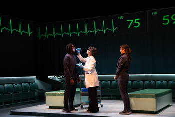 So it is with The Effect, easily her best-known play stateside, now being given a razor-sharp production by Jungle Theater. The Effect takes on another dicey topic, controlled trials of psychotropic drugs using human subjects to measure the effectiveness of substances intended to stimulate desirable moods. Of course, exactly what constitutes a desirable mood is a subjective question, as is the issue of whether feelings and actions taken under the influence of drug-triggered moods are the human subject's authentic nature or merely the nature of the drug acting out through the conduit of the subject's body. The Effect premiered at the National Theatre in London in 2012, and won that year's Critics' Circle Award for Best New Play. There was an off-Broadway production in 2016. A successful revival at the National Theatre in 2023 transferred intact to New York for an off-Broadway run last year. The Effect is a juicy mix of funny, sexy, and provocative and has become an oft-chosen play among regional theaters. Jungle's production is the first to appear in the Twin Cities. The setting is the trial of a new drug aimed at elevating the test subject's moods as a treatment for depression. This trial requires the subjects to remain on site for forty days, during which time they will receive gradually increasing levels of the new drug–unless they are receiving a placebo, which they know is a possibility. All the while, their physical functioning and their emotional state are monitored. They are required to turn over their cell phones, ostensibly because the phone signals interfere with the signals on monitoring devices; whether or not that is true or a ruse, the effect is to leave them without any connection to the outside world. Test director Dr. Lorna James interviews two test subjects. In this way we begin to see how the test is to run, and also get to know Connie and Tristan. Connie is a grad student in psychology who signed up for the trial in part out of academic interest, and also for money to pay for school. Tristan has done similar drug trials before. He appears to be a free-spirited sort, who turns to these kinds of experiences as part of his livelihood. This time he plans to use the money to go travelling cross-country. He is also a flirt–seen first with Dr. James and, as soon as the opportunity arises, with Connie. A secondary plotline, very much integrated into the primary plot, is about the relationship between Lorna and the experiment's principal investigator, Dr. Toby Sealey, a prominent researcher for the pharmaceutical firm behind the project. We discern early on some kind of past history between them, and that Lorna's being hired to conduct this experiment was a kindness on Toby's part. As we learn more about their past and get a glimpse of their future (as we also do with Connie and Tristan), we see a counterpoint to arguments illustrated by both pairs regarding the use of medications and the role of one's autonomy within a relationship. In both cases we observe soaring highs, devastating lows, and placid but comfortable places in between. Director Alison Ruth keeps the scenes moving fluidly, like the blood and drugs coursing through Connie and Tristan's veins, metabolizing from one state to another without pause. She slowly parcels out characters' information, like puzzle pieces seen one at a time, that may or may not fit with the pieces already laid out, but hang on long enough and everything fits. Whether the picture revealed when all the pieces are connected is the one you were expecting is your call, as Prebble leaves open the possibility of imagining different best-outcomes, depending on what lens the audience is looking through. Becca Claire Hart, as Connie, and Kamani Graham, as Tristan, give finely calibrated performances and are perfectly matched. Hart's Connie is initially a bit guarded, even chilly, while Graham's Tristan presents himself as a player, not a serious person. As their drug dosages increase along with their time spent together, Hart's Connie warms up, relaxes, and reaches out, while Graham shows Tristan to have genuine feelings and vulnerability beneath his glib persona. It is a case where the two don't have instant chemistry, but rather, the chemistry bubbles up in tandem with the chemicals they ingest. Christina Baldwin gives a powerful performance as Dr. Lorna James, starchy and stern in the conduct of her experiment, all business in her interactions with the test subjects, but awkward and defensive around her boss Toby and determined to suss out the motives for his choices. When things go awry with disastrous outcomes, Baldwin vividly conveys the anguish that has plagued Lorna's past, now returned to haunt her anew. Greg Watanabe as Dr. Toby Sealey, keenly portrays the arrogance of someone who has climbed to the top of his field, brashly selling his success to stockholders and viewing his test subjects as just so much lab equipment, only as a last resort revealing a capacity to truly care. The open-space clinical setting designed by Benjamin Olsen provides a blank slate on which the characters present themselves. Projections designed by Leslie Ritenour and Peter Morrow provide updates on the course of the experiment and maintains a sense of continuous transformation. Shannon Elliott's lighting enables us to see Connie and Tristan isolated in their own space, together in the broad open area, and closing narrowly in on one another. Dan Dukich's sound and musical composition create the auditory equivalent of Elliot's lighting, shifting between a broad and narrow focus. Annie Enneking's intimacy and fight choreography brings an authentic feeling to both. Prebble has written a probing and engrossing play with markedly authentic dialogue, but there are some gaps in its logic. For one, the notion of test subjects being confined for forty days begs the question of how they are expected to occupy themselves. It is also not clear how Connie and Tristan manag