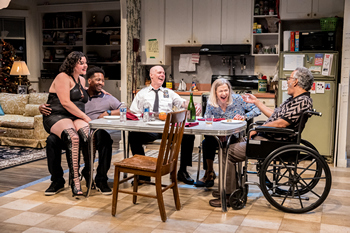 The Riverside Drive address is highly desirable, the solid pre-war construction of the buildings that grace its length solid bulwarks against the outside. Rent control gives it, and the lives within, a sense of stability. But, as Guirgis shows us with biting humor, heart and clarity, the thick walls can't keep a host of psychic windstorms–all the things we call "crazy"–from blowing their way into their interior. Walter was a New York City cop forced into retirement eight years ago when he was injured while off-duty by a series of shots fired by another officer. Walter is Black, the other cop was a white rookie, and Walter has been working on a race-based discrimination lawsuit against the city ever since. While he is at an age that, by now, he well might be retired, injury or not, those life-changing bullets cost Walter much more than his job. Now, in addition to those losses, Walter grieves for his wife, who passed away a year ago. Since then, and likely during the illness that led to her death, Walter has neglected to keep up the apartment, focusing on his lawsuit with rabid bitterness. He has let his home slide into numerous code violations that make him a target for eviction, which the building's owner is eager to pursue and cash in on that rent increase. Given its Riverside Drive location, the apartment will go for ten times what he now pays. There's more on Walter's plate: His son, Junior, recently released from prison, has moved in with him, and may not have totally foresworn his illegal activities. Junior brought his girlfriend Lulu with him, a bubbly but rather dim woman. Lulu tells Walter she is a studying accounting, though she dresses as if any accounts she keeps pay hourly rates. Walter has also taken in Junior's friend Oswaldo, a recovering drug addict. As children, both Lulu and Oswaldo had marginal, at best, parenting and Walter's place is the safe home they never had–so much so that they both call him Dad. This is sweet, but also means they are okay letting Walter take responsibility for them when he has trouble enough taking responsibility for himself. This is plenty, no? No. On top of all this, Walter's former partner Audrey, who he mentored as a rookie on the force, comes for dinner with her police lieutenant boyfriend Dave. After a nice dinner, reminiscing about the old days, and the surprise announcement that Audrey and Dave are engaged, the boom gets lowered: Dave has been assigned to get Walter to take a settlement and make the lawsuit go away. While Audrey begs Walter to let the past go and get on with his life–and, by the way, walk her down the aisle–Dave lays out all that Walter stands to lose if he doesn't agree. That's just about everything Walter contends with, though the weekly visits from a church lady don't help matters either; Walter's view of God is that, if there is a God, he hasn't done Walter any favors. There's also the puppy Junior brought home, having heard that it's good for a person who is grieving to have something to take care of, though Walter already has a house full of puppies of the human variety. Also, Walter has a round-the-clock drinking habit. Yes, he has a tendency to be his own worst enemy, but Guirgis' script makes everything about him real and has us rooting for him. Stephen DiMenna, Park Square's executive artistic director, is at the helm as director of this production. He creates a sense that this collection of troubled and somewhat lost souls is a family unit, albeit one rife with dysfunction, and that the cozy apartment is Walter's fortress against the slings and arrows of the world. That apartment is rendered in a fantastic set design by Benjamin Olson that shows, in cutaway, the kitchen, living room, and a fire-escape that serves as a kind of outdoor confessional booth. The place shows evidence of having been an elegant, old-school Manhattan apartment, with touches such as its built-in bookcases, chandeliers, and once-fine–though now beaten to an inch of its life–flooring. You can see that, with enough spit and polish, the place could shine once again. Emil Herrera is terrific as Walter. His shortcomings and bad choices are totally apparent, yet Herrera enables us to understand Walter's need to overlook his own rough edges and to sympathize with his plight. His delivery of the text is flawless, reacting in the most natural manner to the gauntlet of challenges he endures. Herrera makes it easy to grasp how Walter goes to pains to make Lulu and Oswaldo feel safe, yet he withdraws like a scared turtle into his shell when his own son tries to get real, threatening to rip the bandage off old wounds that Walter wants to believe are healed. Laura Esping as Audrey and Terry Hempleman as Dave make a convincing pair. Esping packs a range of emotions into Audrey: swooning over her own engagement ring and the thoughts of her wedding, expressing genuine concern for her friend and mentor's wellbeing, and toughening up to present some unpleasant truths to Walter. Hempleman is effective as a man who expects to get what he wants, preferably while remaining pleasant, but willing to ratchet up the stakes and be as unpleasant as necessary. Darius Dotch is persuasive as Junior, showing a tendency to contradictions (genuine concern for his dad's well-being, while not as scrupulous about his own affairs) that may be a trait handed down by Walter. Isabella Dunsieth is perhaps just a shade too much as Lulu–or perhaps it's that her costumes (Matt LeFebvre's designs) are a shade too little, as her character teeters on the edge of caricature, though Dunsieth does know her way around a laugh line. José Sabillón manages to make us care about Oswaldo, and even believe that he really is trying to straighten out, in spite of some glaring evidence to the contrary. Rounding out the cast is Kiko Laureano, compelling as the unlikely church lady, a small but catalytic role. "Crazy" is an apt word for the various tribulations that cross Walter's