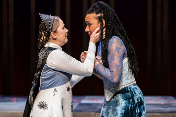The gist of the story is the doomed love between Romeo, scion of the Montague clan, and Juliet, only daughter of Lord and Lady Capulet, heads of their clan. The two families are engaged in an ancient feud, each treating the other as a scourge upon their city, Verona. When young Juliet, not quite fourteen years old, and Romeo meet, an instant electrical charge between them produces undying love at first sight. Because of their families' feud and Juliet's parents intent to have her marry the well-placed Paris, kinsmen of the Prince of Verona, the two lovers act in secret and in haste to seal themselves in marriage, with famously tragic results. Harris has given the familiar story a bit of a twist by raising the prominence of Juliet's nurse, a character usually seen as a supportive role that often adds a bit of comic relief to the otherwise sorrowful story. Though called a nurse, she is more akin to a governess who cared for Juliet since her infancy, and, from appearances, has a more tender relationship than Juliet has with her own, rather aloof mother. The play opens with the Nurse, played with a sense of her own centrality by Stephanie Lambourn, presenting the prologue, which Shakespeare wrote to be given by a chorus. In this production we are made more aware of the Nurse's mention, early on, of having long ago lost a daughter of her own who would be the same age as Juliet. Nothing new is added to the text, yet through these words that often are spoken with little emphasis, we understand the place Juliet has in this woman's heart, as a surrogate child, and we are given to feel the depth of this tragedy through the eyes of someone whose grief is markedly genuine. Similarly, when the lights go out at the end of the first act, the last image we see is of the Nurse pondering the events that have transpired with a heavy heart. This slant allows us to see Romeo and Juliet through somewhat new eyes. This is particularly helpful for viewers who have grown weary of the tale of young men overly eager to raise swords against another for the slightest provocation–as happens between Juliet's cousin, Tybalt, and Mercutio, a member of the Prince's family and friend of Romeo; of poorly timed events, such as occurs in the final scenes where a chance for a happy ending is thwarted by a matter of minutes; and young lovers on the cusp of maturity, unable to restrain themselves from satisfying their urges in the fastest possible time, risking everything for what they take to be the dictates of true love. Their passion is taken by some observers as a highly romantic tribute to the power of a love that feels ordained by the stars, while to others, more cynical, it is a cautionary view of the folly that accompanies impulsive actions spurred by the physical attraction between two people who have scarcely just met. Lambourn, happily returning to Great River Shakespeare's company through the eyes of the nurse, enables us to feel the agonies of the young lovers, through her acceptance of the genuineness of their love for one another and her commitment to the happiness of the lady she serves. Of course, it is incumbent upon the actors who play Romeo and Juliet to do their part in making us believe the intensity of their emotions, both in joy and in grief, while also conveying the innocence of their youth. Playing Juliet, Serena Phillip conveys the passion with which Juliet burns for Romeo, as well as the disdain she has for her parents' attempts to manipulate her affairs. Phillip, who was in Great River Shakespeare's company as an understudy last season, has moved up to take on this leading role with aplomb, showing the combustion that occurs in the heart of an adolescent reckoning with adult feelings and circumstances. Unfortunately, for the performance I attended, Alessandro Yokoyama, who also moved up from the ranks of understudy last season to the role of Romeo this season, was unable to perform, so I missed seeing the chemistry present between the two. Understudy Denzel Dejournette took up the role, and his performance lacked a believable passion for Juliet, certainly not the depth of love for which one would swallow poison, nor reveal the grief that would drive him to avenge Mercutio's slaying heedless of the great cost it would bring upon him. Dejournette was more effective in his scenes as a cohort to his friends, conveying (with Diana Coates as Mercutio and understudy Clay Cooper covering for Eliana Rowe as Benvolio) the brash comradery of young men early in their experience as adults. For his part, Cooper was a winning Benvolio, conveying his loyalty as a friend with a more reasoned temperament than the other young men, and was also effective as a genteel Paris. Coates plays Mercutio as a combustible young man, with a manic delivery of Queen Mab's tale, and rashly launching into a fight with Tybalt that might easily have been avoided. She is effective as stony Lady Capulet, whose regard for status above her daughter's own feelings costs her dearly. Gavin Mueller does fine work playing two opposites: Tybalt, the Capulet nephew who is stoked with an urge to inflict violence upon the Montagues, and a tender-hearted Friar Lawrence, who consents to consecrate Romeo and Juliet's love with hope that their union might reduce the enmity between their clans, and, doing so, feels compelled to assist the couple as the walls close in around them. Michael Fitzpatrick, the most veteran of Great River Shakespeare's current company members, is excellent as Lord Capulet. Emily Fury Daly has little to do as Montague–this is the second production of Romeo and Juliet I have recently seen that did without a Lord and a Lady Montague, and simply had one head of the Montague clan. Eliminating a character who has little bearing on the narrative makes sense, though in this case, the odd costume design for "Montague" makes the character seem like an odd duck among the others. Daly is effective as the slow-witted servant, Peter. Wi