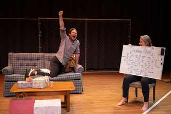 Artistry is giving us a romantic comedy that, to sweeten the deal, incorporates sports metaphors and a few legendary (at least in baseball circles) stories from the annals of the great American game: baseball. Love and Baseball is a delightful ninety minute-long two-character romantic comedy without an intermission, but a pause between each of the innings, er, scenes. The show is mounted in Artistry's Black Box Theater, the first time it's being used for a public production since pre-COVID, and the venue perfectly suits this baseball-mitt sized play. Love and Baseball is by Jerry Montoya. It premiered in 2016 at the B Street Theatre and Sofia Center for the Arts in Sacramento, where he serves as artistic producer. Since then, it has had a modest production history. I was able to track down production two years ago at Acadia Repertory Theatre in Mount Desert, Maine and last year in Mishawaka, Indiana and the University of Idaho. However, shortly after the premiere, Montoya must have scored a movie deal, because Love and Baseball came out as a feature film in 2021–same plot and the same length, meaning no padding from stage to screen. The movie was a low-budget effort and, within that context, a modest success. Maybe you saw it. I did not, though I remember seeing trailers for it and thinking, "That looks cute." Love and Baseball onstage is indeed cute, and I would add that it is funny and thoroughly enjoyable. The plotting requires some suspension of disbelief, and some allowance for bad choices made by the two characters, each of whom intend to be good people. Will (Dustin Bronson) is Michael's roommate in a house in Los Angeles. Michele (Kendra Mueller) lived with Michael before Will. The conversation about whether they were "just friends" or not is kind of dodgy, but in any case, she and Michael are still friends, so Michele shows up at the house to wait for him, having made plans to go to a movie together. Because Michele still has a key to the house, she has let herself in. Will charges into the house, desperate to both take a pee and turn the TV on to the Dodgers playoff game. He spots Michele, a total stranger, freaks out, and picks up the baseball bat he keeps near the door in case self-defense proves necessary. This is how Will and Michele meet. Love and Baseball follows the logic that you get three strikes before you're out, or three outs before your team goes down. This meet-cute scene is Will's first time at bat, though it is Michele who leads off, making the pitch by openly flirting and toying with Will's mix of awkwardness, uncertainty about the current state of affairs between this woman and his roommate, and indecisiveness about whether to watch the game (the playoffs!) or see if he can get on base with this enigmatic woman, a philosophy professor no less. Will is a documentary filmmaker, his fall-back career choice when pro baseball player didn't work out. The first at bat, or scene, ends with Will enacting a legendary baseball story: Kirk Gibson's pinch-hit home run, with two severely injured legs, to score the winning run for the Dodgers over the Oakland Athletics in the first game of the 1988 World Series. If you are not a die-hard baseball fan, this may mean nothing to you, but Will's enthused enactment, as performed by Bronson, is a treasure. At the end, Michele looks up and says, "I think that's the most adorable thing I've ever seen," adding after a short pause, "in a manly way." You know for sure, then, that you are in rom-com land, and for all the unlikeliness of the set-up and the speed at which things develop, it is easy to have a delightful time. Will gets two more at bats, each two years apart, and each having him return like an eager mascot to undermine Michele's resolve to leave the field. In his second time at the plate, Will outdoes his enactment of the Kirk Gibson story with a dramatization of "Merkle's Boner," a chapter in baseball history that dates back to 1908. In the course of doing so, Will does something so boorish and thoughtless, one expects Michele to be through with him for good. And yet ... there is a charm she cannot deny and an attraction she cannot avoid. There are developments, some that are a surprise, some that are predictable, and both Michele and Will make some unadvised choices. Montoya manages to end the game in a way that feels like neither a grand slam nor a shut-out, which, for all the times the play stretches credulity, leaves us able to leave thinking, "This, I can believe." Will and Michele both have flaws that might keep a person from wanting to pursue more than a casual friendship with them. To Montoya's credit, the dialogue is snappy enough to keep us interested in spending time with them. To director Eric Morris' credit, the pacing, blocking, and energy between the actors keep us engaged from the cry of "Play ball" till the final at bat. To the credit of actors Bronson and Mueller, we believe these characters. We sometimes shake our heads at their choices, thinking "how could you?," but we can believe that they did. Bronson's forte is puppy-dog geniality, while Mueller's is conveying a protective coating to shield her from disappointment–no doubt an artifact of her childhood, which she has occasion to reveal–but beneath that outer crust is an active yearning for a connection that she has never been able to make good on. Katie Phillips' set design offers an authentically lived-in apartment, cluttered with apt props, also designed by Phillips. Grant E. Merges' lighting design matches the mood, from subtle moments of near-intimacy to the glare of the Polo Grounds, while Richard Graham's sound design brings us the backdrop of a stirred-up crowd to accompany Will's baseball stories, and music with awesome fidelity to justify Will's obsession with high-end stereo equipment. Samantha Fromm Haddow's costumes are well suited to the characters' situations from scene to scene. In a nice touch, between scenes we see the actors c