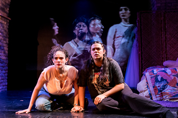 In 2022, Exposed Brick launched Through Our Eyes, a festival of new works that adhered to that mission with robust stagings and great promise. The company has now mounted Through Our Eyes 2, a second festival of new work, encompassing full productions of two one-act plays and readings of two more works in progress. I had the opportunity to attend Burn & Dash and Quinceañera, the two one acts, separated by an intermission. Burn & Dash, by Sunny Thao, takes place in the woods near a village in an unnamed Southeast Asian country and, briefly, in the back of a van. Two girls, Hli (pronounced "Lee") and Nou, have met and become fast friends. They find one another in the forest where they play games like hide and seek, groom each other's hair, and share fragments of their hopes and dreams. They also harbor fears, but do not express these aloud. Instead, these are projected as interior monologue on a screen above the actors. Nou is native to the village. At the age of 13 she yearns to run away to the city and experience the world beyond. Her parents, though, expect her to stay and marry, as many girls her age have done, to continue their traditional way of life. Hli cautions Nou about her ambitions. Hli has travelled here from another place in a van with a man who is not her father but who, she asserts, takes good care of her. He travels to sell the wares in his van. Nou asks If he sells cloth and Hli responds, no, he sells girls. Nou does not understand and Hli does not have the words to explain. Yet, Nou understands traditional "bride-napping," citing a case in her village that occurred two years before. That distinction raises the thin margin between unwelcome cultural practices and criminal acts. Hli wants to warn Nou, yet cannot speak forthrightly. The play feels like an exchange between two girls on different sides of a threshold that leads nowhere. Their conversations are broken by uncomfortable pauses, creating a sense that the characters are unsure where their exchanges are heading and what comes next. When Hli must abruptly depart, Nou is sorry to see her friend go, but is none the wiser. A final scene depicts the moment when Hli fell in with the trafficker she calls Uncle, making it clear how easily these things occur and how guileless these girls are when the game begins. Lily Bo Eun Gobel as Hli and Gracy Ly as Nou both do their best to create viable characters given the lack of momentum in their story. Ly especially conveys authenticity as a typical thirteen-year-old, summoning her emergent maturity one minute, and flighty or fitful as a child the next. The two characters wear identical costumes based on traditional attire. These underscore a sense of their interchangeability in the eyes of their abductors. Look at their faces and they are quite distinctive; listen to them speak, and they have their own cadence expressing their unique personalities. But to men who lure them into their vans, one is like another. Burn & Dash features shadow puppets, designed by Ches Cipriano, fanciful images that seem to pertain to innocence and its loss, though–truth be told–that is just my best guess, as I was never certain what the puppets were meant to depict. I would have preferred if the playwright had instead devised a more engaging narrative and allowed the characters to express their feelings more directly. Quinceañera, written by Mayra Gurrola Calderón, is the more successful of the pair. In a Hispanic-American community, Alessandra prepares for her upcoming quinceañera, but is distracted by her disdain for religion–being confirmed in the Catholic Church is part of the quincé package–and skepticism over the existence of God; her unresolved grief for her older sister who died not long ago and who appears in her dreams; her status as a lesbian and disinterest in quincé dresses that resemble ornate wedding cakes; and her massive crush on a classmate named Juliana. All that sits atop the usual business of high school classes and tolerating squirrely (though totally supportive) friends. Calderón's play offers a clear narrative arc as the extremely likeable Alessandra faces and overcomes these obstacles. The most challenging one is to recognize and address her grief, and to understand how grief has also affected her mother. That burden is to be absorbed by a cluster of women, seen on film, who silently circle one another with elegant gestures. These film clips mean nothing at the onset but as their meaning is made clear, they provide a source of comfort and courage for Alessandra. As for catching the eye of Juliana, Alessandra's friends hatch a plot that, while perhaps a stretch of credulity, works in a romcom-spirited way, though the tone of this aspect of Quinceañera is rather at odds with the fraught challenge of her haunted dreams and aching loss. Lucia Salazar-Davison as Alessandra and Reyna Rios as her mother wonderfully capture the struggles embedded in their relationship in both heartfelt and comedic veins. They are especially delightful out shopping for the right dress for that special day, each with a different notion of what the "right dress" looks like. While many of the mother's lines are in Spanish (which feels authentic to her character), Rios' keenly expressive performance allowed me to follow those conversations without ever wondering what I might be missing. Isa Condo-Olvera is captivating as passionate Aurelia, returning in spirit form to guide her sister through this pivotal moment in her life. Samuel Osborn-Huerta, following a strong turn last spring in Mae West and the Trial of Sex, is splendid as confident and seductive Juliana, while Bella Maldonado and Phi Hamens Nelson are high spirited as Alessandra's BFFs. Burn & Dash and Quinceañera are both about girls coming of age. The former proffers a world in which that crossing can be made either by sticking to traditional customs that deprive woman of choice or by falling victim to predatory men, also robbing