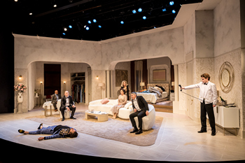 It's Only a Play takes place on the opening night of the fictional play The Golden Egg, where wealthy, clueless producer Julia Budder played by Emily Gunyou Halaas hosts the opening night party while waiting for the reviews from various New York theatre critics. Scenic designer Ben Olsen presents a lavish guest suite and gigantic soft couch allowing for various consistently hilarious pratfalls by every actor. Not to be outdone, costume designs by Matt LeFebvre are often the butt of the joke, most memorably in bits regarding the coats from various Broadway casts and stars being laid on the bed upstage by naive coat checker Gus P. Head, played by Nate Turcotte. Wingert is a stand out as has-been, alcoholic, drug-loving Hollywood actor Virginia Noyes, attempting to salvage her career by performing on Broadway. She wrings every last bit of comedy out of the role, clearly having a blast with her physical bits on the couch and her shiny jumpsuit. Lichtscheidl and Andreev do not seem to have the same level of playfulness in their roles as old friends, actor and playwright, respectively. Lichtscheidl's arch interpretation of narcissist James "Jimmy" Wicker comes off as reserved, an adjective rarely applied to the actors who most recently played the role on Broadway, Nathan Lane and Martin Short. Andreev enters with a fair amount of neurotic energy, rapidly blinking as nervous playwright Peter Austin, but this energy dissipates quickly and Andreev then plays Austin as a sort of comedic wet blanket. Gunyou Halaas gets consistent laughs with her character's misquotes of various sayings and proverbs, and Daniel Petzold literally throws his body into the role of director Frank Finger to great comedic effect. Ultimately, the physical comedy has the biggest pay off in It's Only a Play. Because this production is performed by Twin Cities actors for a Twin Cities regional theatre audience, the comedic lines that probably felt dangerous and hilarious for Broadway actors and television or movie stars to say in a Broadway theater do not pull as much of a punch. It's Only a Play runs through October 19, 2025, at Park Square Theatre, 20 W 7th Pl, St Paul MN. For tickets and information, please visit parksquaretheatre.org or call 651-291-7005. |