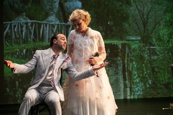 Yet, it appears that the orchard, managed by Andréyevna's adopted older daughter, Várya, in the matriarch's absence, has been unprofitable and that Andréyevna's flagrant spending and careless generosity has put the family in serious debt. Andréyevna's brother, Leonid Andréyich Gáyev, isn't much help, only preparing to protect himself by taking a job as a banker a step down for the landed gentry. Andréyevna's 17-year-old younger daughter, Anya, who returned from Paris with her mother, seems like unmolded clay: she enjoys the flouncy dresses and life of leisure she has always known, while drawn to the revolutionary rhetoric of Trofimov, a perpetual university student who is Anya's friend and perhaps her suitor, though he disavows any place for love in the purity of his socialist vision. This dilemma, along with the shadow it casts on servants and others who live in the orbit of the Gáyev's largesse, is the thrust of The Cherry Orchard , considered one of Anton Chekhov's quartet of great plays, along with The Seagull, The Three Sisters and Uncle Vanya. The Moving Company and Jungle Theater have joined forces in a co-production, currently playing on the Jungle's stage and directed by Dominique Serrand, a co-artistic director of The Moving Company. The production maintains the play's potency and poetry, with Chekhov's empathic illumination of characters, and the clear intimations of impending loss as new ideologies pry away the old guards grasp of power. But the play's relevance is not confined to that particular historical time and place; change, and the willfully oblivious response by those whose lives the change is about to upend, is a recurring event in history. As is the modern custom, Chekhov's four acts have been condensed into two. Under Serrand's direction, the first act is presented in a naturalistic style, akin to the type of presentation that has typified work by Jungle Theater throughout its history. It feels like a wall has been sliced off the Gáyev manse and we observe the interactions within, with all their realism intact. The second act is stylized and whimsical in the manner I have come to identify with The Moving Company. The language is still Chekhov's, but the movement and blocking of characters creates an almost surreal affect. This is particularly true during a ball held in the Gáyev home while offstage the property is being auctioned off. Characters express themselves through posture, position, and proximity to one another, as much as by their words or voice. Chekhov called The Cherry Orchard a comedy, even though it has serious themes of loss and social upheaval. In the first act, the text presents most of the comedy, whereas in the second, the staging draws out its comical aspect along with the text, as if the decorum of this family, representing the landed gentry, has cracked open and they are moving through limbo in search of a new way to live. In addition to directing, Serrand designed the production's largely bare set and magnificent projections. The projections dominate the rear stage wall, inserting monumental, curved staircases, pillars supporting plaster arches, a lush garden trellis, and other images, zooming in or out, scrolling up or down, and altering images to depict the creeping onset of decay. Similarly, Sonya Berlovitz's costumes convey elegance and charm at the onset and become increasingly askew and unlikely as the play moves forward. Note in particular the difference in Madame Andréyevna's gowns. Marcus Dilliard's lighting adds nuance and underscores the shifts in emotional tone. The cast is a seamless ensemble, with precisely timed entrances and exits, and lines exchanged between characters without an iota of hesitation. Tracey Maloney, in what is considered the lead role of Liubóv Andréyevna, is a marvel, conveying the luminosity of a woman who has always been pampered by life, even in the midst of grief over the early death of a beloved child, and later, shows us the pall that settles over this same woman when the new reality crashes down upon her. Nathan Keepers (another of The Moving Company's co-artistic directors) is outstanding as Lopákhin, the astute businessman who, through tireless work, usurps control of the estate from its founders and celebrates having dominion over the land his grandparents toiled on as serfs. The sign of the rising middle class, he is proud of working hard, while the gentry take pride in others laboring on their behalf. Kenzi Allen is an engrossing Anya, conveying a blend of innocence and insights, torn between a desire to be part of a world changing for the better and her devotion to a mother who is drowning in the weight of a society facing its death knells. Elizabeth Efteland is quite remarkable as both Várya, the older daughter burned with responsibility for an estate she seems to have little fondness for, as she dreams of the serenity of life as a nun while harboring a love that has yet to bear fruit; and as Trofimov, the student whose starry-eyed radicalism far outstrips his actual life experience. Efteland conveys Trofimov's obvious affection or Anya, despite the youth's resolve to put ideals before love. Dominique Serrand plays the role of Andréyich Gáyev, resigned to whatever fate brings his way. Randy Reyes is delightful as two comedic characters, Pishchik, a near-do-well neighboring landowner in constant need of a loan, and Yepikhódov, a self-effacing clerk who doggedly pursues the housemaid Dunyásha. As Dunyásha, Sophina Saggau expresses deference to the obedience forced upon her station in life, allowing herself to take pleasure in her employer's downfall, mixed with the uncertainty of not knowing how she will live now. This production is based on a translation of The Cherry Orchard by Paul Schmidt that has been widely used around the United States since it appeared in 1997. This, and Schmidt's translation of other Chekhov plays, has been hailed for making the works more accessible t