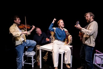 The individuals whose testimony was tapped include refugees from the current war to fend off the Russian invasion, immigrants who left Ukraine after the fall of the Soviet Union, descendants of earlier immigrants searching for their cultural heritage, a young Ukrainian in the U.S. on a student visa, an American mother of an adopted Ukrainian daughter, an interpreter helping to bridge language barriers, a Ukrainian mother desperate to get medical help for her wounded child, a prosthetist who founded a non-profit organization in the U.S. that provides Ukrainians who lose limbs in the war with artificial replacements, and a Ukrainian deminer (a job title I had not heard before) in need of those services. They range in age from elderly to children. The testimonies were divided among six actors who adeptly switched off roles, each playing two to four characters. Actually, calling them characters feels like a disservice, as every speaker and each scrap of dialogue represents a real person's actual experience. Many are horrific, though there are some moments of tenderness and joy. Some of the speakers are in relation to another, such as a husband who insisted there was no need to worry and a wife who was frantic to flee their home, fearing the attacks would reach them. The husband scoffed, saying "You watch too much news." And then ... An Ocean Away opened and closed with Ukrainian music performed by the actors, with music interspersed throughout, which provided a direct, sensory experience of Ukrainian culture while offering a reprise from the text's intensity. Kureichik has woven the narratives back and forth throughout the play's two acts, with a character sharing their story in one scene, and returning later to continue their tale, so that we received short bites of each testimony at a time. This made for an engaging audience experience by breaking up what would otherwise be a series of long monologues, though it counted on the audience being able to follow the hopscotching from one story to another. Fortunately, the actors make nimble transitions from one character to another. The actors were effective as each of the persons they portrayed, but I will cite the most memorable of those guises. David Mitchell was compelling as the student whose student visa to study in the U.S shields him from being conscripted into he war back home as he struggles with considering whether this makes him a coward. Timothy Thomas, as a foreman who has given up an arm to the war, yet, at the age of 50, intends to go back to the fight, was equally stirring. Kayla Dvorak Feld was immeasurably moving as a mother seeking justice for the losses she was forced to bear. Barbara Berlovitz cast a spell as a child of the old diaspora, unable to accept these new refugees into the community her people has worked to build; Liv Kemp was memorable as a teenager struggling to meld her Ukrainian and Jewish ancestry into a self-identity. Most gripping was Sam Bardwell's portrayal of the deminer left blind and legless by his vocation, whose stoic attitude toward survival was conveyed with chilling authenticity. Lisa Channer and Vladimir Rovinsky, co-directors of this production (and co-founders of Theatre Novi Most in 1998), used simple set pieces–three white, square tables and about a dozen white straight back chairs against a black background–to fashion various locations and effects, such as having chairs lifted at their bottom by actors, then set down in upturned positions to effectively convey the results of a bomb explosion. The shift from one speaker and their story to another was presented with both clarity and fluidity–the audience easily knew when the narrative was being reset without feeling an intrusive stop and start. The title An Ocean Away was made visible with captivating projections by Kathy Maxwell that depicted a swelling ocean, with images overlaid to emphasize the distance between those who have sought refuge in distant Minnesota from the turmoil of a land still beloved to them. The projections also included film footage of their homeland, both its beauty and the destruction wrought by war. Dan Dukich's sound design and Shirley Runkel's lighting design worked in tandem with the projections to create the range of emotions that accompany these testimonies. Runkel also coordinated the simple scenic and props for the production. Lily Turner's costume designs effectively carry traces of the old folkways–in particular, the resplendent embroidery–laden on the work-a-day apparel of contemporary life that has become fairly universal worldwide. Andrei Kureichik is Belarusian by birth. He has academic training in law, journalism, and non-profit management, and has worked in all three realms, in addition to being a prolific film director, screenwriter, and playwright. His work champions the cause of democracy, peace, and justice and has been performed in Belarus, Ukraine, Poland, Lithuania, and Finland, in addition to the United States, where he is currently in residence. While in An Ocean Away he synthesized statements collected from Minnesota's Ukrainian community, rather than devising an original text, his knowledge of the world being described clearly serves to enhance the play, and he has used sound dramatic judgement in making choices about the sequencing and pacing of these segments. An Ocean Away is a modest work, in some ways–certainly in the scale of its production and its presentation of snippets, albeit compelling ones, rather than an elaborate narrative. It is not what one thinks of as a "theatrical event." There is a place for work on this scale that informs audiences to build a knowledge base regarding a corner of the world that may not be well known, and to develop empathy for the human lives touched by that corner. The Theatre Novi Most production of An Ocean Away presented both the facts and the humanity behind the facts to convey the challenges, joys, and heartbreak of this diaspora communit