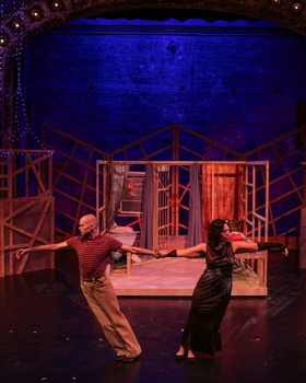 Besides Valentin and Molina, there is a third major character in the story, a fabled film actress called Aurora, whose films rabid fan Molina recounts over and over in his mind to escape his gruesome reality. He adores revisiting the strong, glamorous women Aurora portrays–all but one, the Spider Woman who lures men into her clutches and kills them with her kiss. That one frightens Molina. Since its publication, Kiss of the Spider Woman had been wending its way through various art forms. Puig wrote a play based on his novel in 1983; an English translation by Allan Baker had its London premier starring Mark Rylance and Simon Callow in 1985. 1985 also saw the release of a film version starring Raul Julia, William Hurt, and Sonia Braga. Hurt won the Best Actor Oscar as Molina, and the film was nominated for the Best Picture Oscar, Best Director (Héctor Babenco), and Best Adapted Screenplay. From there, a stage musical might have seemed not so great a leap. The task was undertaken by a quartet of extraordinary talents: composer John Kander, lyricist Fred Ebb, playwright Terrence McNally, and legendary director Harold Prince, who helmed its original production. Not only did it open on Broadway in 1993, starring Chita Rivera, Brent Carver and Anthony Crivello, but it won that year's Tony Award for Best Musical, as well as Best Book, Best Score, Best Costumes, and for each of its three stars, and ran for 904 performances. In spite of the accolades, since then the show has not reappeared with much frequency in terms of revivals or regional productions, though just this fall, a film adaptation of the musical brought the show back to our attention. Because it shows up so rarely, I suspect there are many readers who, like me, have never had the opportunity to see the stage musical–I regrettably missed the national tour that played at the Ordway in 1996. You may, like me, be completely familiar with its score, laden with great Kander and Ebb songs–not quite Cabaret or Chicago great, but still great. I am grateful to Teatro del Pueblo for creating an opportunity to see the show, especially how those songs meld with a fiercely intense book, and how the musical gaiety of some of the songs meant to be "big numbers" from Aurora's movies work in the context of such a somber narrative. McNally's book works extremely well. The majority of the book scenes are between Molina and Valentin, and some between Molina and the prison warden who sets Molina up to spy on his radical cellmate in exchange for an early release to be with his ailing mother. There are also the taunts flung by the prison guards at both Valentin and Molina–though Molina has learned, from years of living as a homosexual in a society that glorifies machismo, to deflect their taunts, even if the price is humiliation. Throughout, the dialogue feels authentic, especially in building the central relationship between Valentin and Molina. Songs that are embedded in these places work well, with standouts such as "Dressing Them Up/I Draw the Line," "Dear One," "Gabriel's Letter/My First Woman," and "Anything for Him." There is also a powerful anthem, "The Day After That," to express the belief that liberty and equality will ultimately prevail. However, the songs that are presented in full floor-show manner that are meant to be taken from Aurora's movies are jarring. Rather than provide dialogue for Aurora that allows her to reflect on Molina and Valentin's situation, the show pops right into production numbers that don't add much more than glitz. There are two songs for Aurora–"I Do Miracles," which offers healing by force of love and compassion, and the title song, in which Aurora, fully transformed into the Spider Woman, conveys the futility of resisting her deadly kiss. But those would-be showstopper numbers fall flat. It may be that with a blazing talent like Chita Rivera, or Vanessa Williams who scored big making her Broadway debut as Rivera's replacement, those numbers are exciting enough to make up for their abrupt arrival and ill fit. Unfortunately, Teatro del Pueblo's production is unable to deliver that level of excitement. Lelis Brito has devised choreography that is pleasing enough, but the ensemble as a whole, and Maria Isabel at the center of these numbers as Aurora, don't have the zest for these numbers to do for us what they do for Molina, which is to whisk us away from our lives, if only for a moment. That said, Teatro del Pueblo's Kiss of the Spider Woman is a moving, deeply felt, and inventively staged production. Justiniano's direction of books scenes draws us to the two lead characters, building their relationship with conviction, while allowing that each remains flawed. He also makes terrific use of Jacelyn Stewart's inventive set, with the realistic prison cell front and center, backed by a weblike grating that contains the other prisoners, and a perch on one side that transforms into the Spider Woman's lair, abetted by Bill Larsen's effective lighting design. Caroline Amaral Zaltron's costumes serve the production well, sparkling for the production numbers, sobering for the prison scenes, and enticing for the Spider Woman. Zakary Thomas Morton is phenomenal as Molina, delivering a range of emotions from the giddy "Dressing Them Up" to the wistful "She's a Woman" to the adoring "Mama, It's Me," the impassioned, surrealistic finale. Sylvestrey P'Orantes provides powerful contrast as Valentin, disgusted by his cellmate's rantings and gradually showing how a man can begin to accept, and then to appreciate, what he once abhorred. P'Orantes brings a beautiful, strong voice to the role, especially stirring pining for his girlfriend "Marta," and leading the choral "The Day After That." Maria Isabel makes her strongest impression when she is intimately engaged with Molina and Valentin, as in "I Do Miracles" and "Kiss of the Spider Woman." She is wonderful single-handedly (with Molina's expressive narration) playing out the me