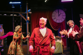 With my schedule this year allowing for just one production of A Christmas Carol, I opted to make a return to Open Window. Once again I was touched by its insightful representation of Ebenezer Scrooge as a whole man on an arc of self-discovery, the deceptively simplicity of its staging, and the open-hearted inclusion of so many traditional Christmas song in the production. Open Window uses Emily C.A. Snyder's stage adaptation of the classic Charles Dickens novella, which omits a couple of things and adds a bit to the story as is usually told. It is still the story of a wretched skinflint, Scrooge, who lives only to make money and to avoid spending any of it–so much so that the character's surname has become synonymous with "tightwad." He particularly scorns Christmas for its goodwill, cheer, inclusion, and especially, its lavish generosity. Scrooge is forever changed one Christmas Eve when the ghost of his deceased partner, Jacob Marley, visits to warn Scrooge that he is on the wrong path in life and will pay for his failings in eternity. Three more ghosts visit and each takes Scrooge on a spirit journey to Christmas past, Christmas present, and Christmas future. Scrooge is thus shaken out of his heartlessness and embraces the qualities of kindness and generosity embodied by Christmas on that day and all through the year. Snyder adds brief but significant bits of dialogue. Some pertain to Scrooge's past, enlarging his backstory and enabling us to understand, if not excuse, his misanthropy. The separate episodes that form Scrooge's visit to his past are more tangibly connected to his present, forming a coherent view of the man. We see him tormented as a child at school for his poverty and neglect; later, that tormentor is seen as a man afflicted by the same strand of greed, as a changed Scrooge laughs him off. We see Scrooge as a young clerk fretting over the lack of business acumen of his congenial employer, Fezziwig, leading him to change employment from Fezziwig to the far more scrupulous, albeit heartless, Marley. We see him meet and court Belle, giving credence to a romance that blossomed before his growing pursuit of wealth turns her away; and we see responsibility for his orphaned nephew Fred fall upon him. Same plot, but the sense of the story being a whole cloth lets us know and understand Scrooge better. This effect is deeply enhanced by Craig Johnson's haunting performance as Scrooge, which is a shade more subversive than Peter Colburn's stirring performance last season. Even at his nastiest, Johnson conveys a vulnerability within the miser, as if his thick crust is formed by pain rather than malice. Johnson expresses the gamut of Scrooge's emotions from ferocity to cynicism to despair to elation. Our understanding of Scrooge is further deepened by Mitchell Geiken's sharp performance as the young man Scrooge. Geiken conveys the effect on Scrooge of a childhood in which he had to look after his own interests, leading to poor choices that compound themselves until he becomes Ebenezer Scrooge as we first meet him, a heartless mercenary. Seeing how he fell into that state doesn't excuse his horrid behavior, but it gives us a better grasp of his humanity buried within, even before he himself does. Thus, Scrooge is not in the end a new man, but a man returned to a core that had been buried alive. Director Kari Steinbach makes the transitions through different settings and points in time easy to follow, and immerses the entire undertaking in a spirit of goodwill. Steinbach makes good use of the simple but effective setting (designed by Robin McIntyre) that includes a raised platform for Scrooge's office, menacingly overlooking his fraught employees, and which cleverly conceals the bed from which the visiting ghosts rouse him. Steinbach adroitly weaves traditional Christmas songs into the staging, including a lovely dance at the Fezziwigs' Christmas party. At times, the music is part of the narrative, and other times used as a bridge between scenes. The songs, under the musical direction of Michael Pearce Donley, are earnestly performed, the voices all pleasing, though when only a couple of actors are involved, a higher volume would have enhanced the presentation. In addition to Johnson's and Geiken's superb work (Geiken is also extremely effecting as Fred, Scrooge's warm-hearted nephew, here given even more cause to yearn for his uncle's company), the play also benefits greatly from Andrew Newman's performance as Bob Cratchit, conveying the humble clerk's modesty and faith. Newman also plays Mr. Fezziwig's son, a character Snyder inserted into the play to a powerful effect. Mandie Siems conveys Mrs. Cratchit's outspoken nature with dash and her heartbroken moments with tenderness. Warren Sampson makes a striking impression as Marley's fearsome ghost, Rick Lamers emits joy as generous-to-a-fault Fezziwig, Julia Ennen expresses the well of sorrow Scrooge's only love, Belle, feels upon realizing that he has turned away from the life she envisioned with him, and Marcie Panian is totally persuasive as the life-affirming ghost of Christmas present. I certainly cannot overlook young Justus Heisler, returning from last season's production and an even more perfect embodiment of Tiny Tim than he was a year ago. Robert L. Graff's colorful and detailed costumes look wholly in place in early Victorian London, yet not so opulent as we sometimes see, which seems proper for the period and the characters. Sue Berger's lighting design captures all of the nuance of the play's vast range of moods, and Nate Farley designed a cornucopia of suitable props. Michael Pearce Donley handles the sound design that allows the cast to be clearly heard throughout the performance, though, as last year, I am not a fan of the greatly amplified voice given to Marley's ghost, which makes it hard to understand some of the text. Other subtle but meaningful alterations in Snyder's narrative include having several employees