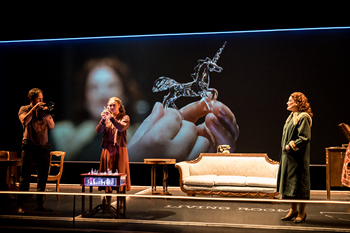 In Theater Latté Da's mesmerizing production of The Glass Menagerie, director Justin Lucero dives deeply into that notion, that our memories are fractions of a whole. Like a film, they may zoom in on particular details at the expense of others or zoom out for a wide angle shot that blurs the specifics. Lucero accomplishes this by taking that fact that Tom is a frustrated, aspiring writer (commonly considered a stand-in for the playwright himself) and has take notes on both the details and broad sweeps of his domestic life that, a decade later, becomes the basis for this account (that became Williams' first success). Rather than jotting those notes on paper, he records them using a camera, privileging the audience to see close-ups on the wide screen behind the fragments of rooms in Joe Thomas Johnson's set design. These images sometimes linger, for what feels like an uncomfortably long time, on teeth and lips that form a smile, or catch the light rising from below that makes a glass unicorn truly appear to be enchanted. On stage, we see what Tom can see; on the screen, we see what he will remember. When I read about this novel concept for staging the play, I feared it would amount to no more than a gimmick, but I am fully disabused of that notion now that I have seen the results. It works brilliantly, with Adam J. Thompson credited for design of the extraordinary video and projections. Similarly, the production incorporates a soundscape using live instruments, sound effects, and recorded music: superb sound design and original music composed by Katherine Horowitz and delivered by Brandon Brooks as soundscape artist, nested in a booth wedged into one side of the theater between the stage and audience. Marcus Dilliard's lighting design focuses, like the camera, on whatever is essential at the given moment, be it the full sweep of the stage, the fire escape to which Tom flees from his family for smokes and solitude, or the luminescence rising beneath the small cart that contains Tom's sister Laura's precious collection of animal figurines, the glass menagerie of the title. The play is set in St. Louis, where Williams lived from the age of eight until leaving home in his early 20s. Tom Wingfield (Williams' given name was Thomas) yearns for poetry and meaning in life. He is profoundly frustrated by the banality of his job in a shoe warehouse (Williams also held such a job for a period). Worse is his mother Amanda's constant harping about what she considers his numerous unhealthy habits. These include everything from his posture to smoking to staying out all night at the movies (or so he says). He is also oppressed by her frequent scolding his lack of ambition–the desire to be a writer not considered a serious ambition–and that his salary is inadequate to support her and his disabled older sister, Laura. Laura's physical handicap affects her gait and makes movement slow and awkward, but her greater disability is her crippling shyness and lack of confidence. She retreats into obsessively admiring and polishing her collection of the miniature glass animals and listening to old records on a wind-up Victrola. Amanda fears for Laura's future, having no means of support unless she marries, an increasingly unlikely prospect. To this end, Amanda prevails on Tom to invite some suitable nice young man from work to their home to meet Laura. Amanda constantly relives her own brilliant maidenhood in Mississippi, beleaguered by gentlemen callers, many of whom, as she recalls, were far better prospects than her children's father, who won her over with charm, turned out to have little else to offer, and has long since abandoned them. Dustin Bronson is wonderful as Tom Wingfield, presenting himself in the opening of each act as the older Tom drawing out his memories. Here he is somewhat more effete in speech, manner, and appearance (with a colorful scarf jauntily encircling his neck), as Williams, and perhaps Tom, had forsaken heterosexuality and taken to having love affairs with men by time in his life. Those qualities are less apparent when we are viewing his memories as a young man living in his emotionally stifling family home. Bronson is equally persuasive as dreamy-eyed Tom on the fire escape, looking out into his unknown future, a combustible brute lashing out at his domineering mother, and a tender-hearted brother who loves his sister, but is unable to sacrifice himself for her wellbeing. It is a brilliant performance, the best I have ever seen by this accomplished actor. Norah Long is mesmerizing as Amanda, wrapped in the double-edged memories of her life as a Southern belle, which allows her to claim a parcel of quality in her life to hang onto in the face of the heap of disappointments she faces in the present. One suspects that her memories are more fantasy than fact, but Long convinces us that Amanda "remembers" them with certitude, recapturing–or perhaps inventing–the rapture of those long-gone days. She also conveys Amanda's desperation to resolve the predicament of her life, and to quickly hatch a scheme or cover-up a fiasco, unable ever to admit defeat. Amy Eckberg is touching as Laura, unfolding like the petals of a tulip when she is at last able to feel at ease in the presence of a man. Brandon Brooks–who greatly impressed me back in 2014 as Young Max (the expressive dog) in Children's Theatre Company's How the Grinch Stole Christmas–fulfills that promise with a marvelous rendering of Jim, the unwitting gentleman caller, exuding self-confidence and empathy, whose intention to deliver nothing but good will fails to salvage the disaster that awaits the Wingfield home. Prior to his entrance as Jim, Brooks ably serves as the production's soundscape artist. Brooks and Eckberg create a moving sequence when Jim persuades Laura to set aside her fears and dance with him, transforming her into a person with untapped grace and him into a person capable of seeing below the surface into the w