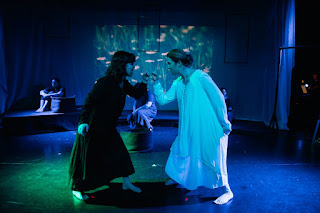 In the Green is about Hildegard von Bingen, who lived in 12th century Germany and was canonized by Pope Benedict XVI in 2012. Hildegard was a multi-faceted woman who was well ahead of her time, with accomplishments as a religious writer, philosopher, mystic, medical writer and practitioner, preacher, and a composer whose soaring melodies go beyond the constraints of traditional Gregorian chants of her era. Her achievements are the more remarkable when one learns that she spent thirty years of her life, from the age of eight to the age of thirty-eight, confined in a cell lacking natural light, within a Benedictine monastery. Hildegard and her compositions garnered attention in recent decades, part of efforts to reveal the historic role and contributions of women, and to expand upon women's roles in the modern church. She was certainly not a typical woman of the church at her time, for in her life work she broke many boundaries, such as being granted permission by church leaders to write down her visions and to preach at church gatherings, rights previously granted only to men. However, In the Green doesn't venture into the boundary-breaking work of her later life–she lived to be eighty-one–but focuses on her time in that darkened cell. The show begins in the year 1106 as Hildegard's parents tithe her as an oblate, meant to live a life dedicated to Christ and God (and relieve them of the burden or her care). She shared that cell with Jutta von Sponheim, who acted as Hildegard's guide both in matters of the spirit and survival. Actually, in the guise of In the Green, the two are closely intertwined. Jutta is an anchoress, meaning a woman physically sealed off from the world as if already dead in order to devote her thoughts to the life beyond. She subsists on meager portions of food and water delivered through a window. Though records suggest that Jutta was only eight years older than Hildegard, In the Green depicts her from the start as a commanding woman. The density of lyrics and complexity of rhythms in her songs bear testimony to her authority. In creating this one-act musical, McLean had the ingenious notion of portraying Hildegarde's brokenness with three actors each playing one element of her sensory experiences in the outside world. The three are Eye, who has seen too much; Mouth, who has said too much and hungered too much; and Hand, whose sin has been to gather too much. Eye, Mouth, and Hand often speak and sing independently of one another, though at times their voices (sung or spoken) join in unison, while at other times they respond back and forth to each other. Jutta promises Hildegard that her brokenness will heal through asceticism, patience, and hard labor–labor represented as constant digging into the earth beneath their cell. When, after struggling with this for some time, Hildegard's broken parts feel little progress and despair of becoming whole, Jutta tells them that she too was broken and followed this same course to make herself whole. She will not, however, reveal the cause of her break. Eventually, Eye, Mouth, and Hand dig deep enough to find another being, called Shadow–the buried shadow of the pain that had broken Jutta. Through Shadow's confessions, Eye, Mouth, and Hand learn Jutta's story and realize that Jutta made herself whole by burying her past, not by knitting it together. This spurs Shadow, Eye, and Mouth to work through the trauma that led to their brokenness and finally become whole once more. After Jutta's death in 1136, the cell opened, allowing Hildegarde to experience light and air. Hildegard is now a thirty-eight-year-old woman, at this point portrayed by Abilene Olson as a unitary person. The cell door is opened to bring in a new oblate, who will be placed under Hildegard's tutelage. However, Hildegard refuses to mentor the child in a darkened cell, and insists that she go on guiding the child in the light of the world. Hildegard becomes engaged in many branches of church-related work, and begins to amass a following. McLean's score contains gorgeous music that uses recurring themes, wending themselves into complex madrigal-like melodies as well as modern theatre songs that hinge between soulful and mournful, with a quality that brings to mind Michael John La Chiusa's Marie Christine and Jeanine Tesori's Violet. McLean's songs for Jutta are more forceful, closer to a blues-rock vein. She makes frequent uses of loop recordings that capture snippets of her voice, repeating those in a loop so that Jutta sings accompanied by iterations of herself, creating a sense of her as a large and omnipresent force in contrast to Hildegard's withdrawn brokenness. The play has a great deal more singing than spoken text. Much of the dialogue is colloquial and contemporary, as when the Marchioness calms the fears of Hildegard's mother about confining her to a cell by saying "Inside the cell, she'll be technically dead, but super comfortable." That easygoing way with dialogue makes it more accessible and guides the audience to consider that this 900-year-old story has something to say to us, and especially to women, today. As always at Theatre Elision, the caliber of both vocal and instrumental music is exquisite. This production would be worth going to even if one kept eyes closed and merely listened. Christine Wade is an outstanding vocal director, as evidenced by the results, and also sings–and acts, but especially sings–with a raging force as Jutta. Deidre Cochrane as Mouth, Abilene Olson as Hand, and Annie Schiferl as Eye all sing beautifully, whether solo or in harmony, and express the pain and eventual redemption Hildegard goes through. Emily Hensley gives an equally strong performance, vocally and dramatically, as Shadow. Music director Harrison Wade and fellow musicians Jeff A. Miller (bass) and Miles Whealy (drums) perform the well-orchestrated score. Director and designer of the costumes and set Lindsay Fitzgerald has created a feel for the e