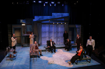 Christie, of course, is the grande dame of the mystery genre. Over an astonishing fifty-five-year career (from 1920-1975), she produced 66 detective novels and 15 short-story collections, to say nothing of her works for stage and radio dramas. Her prose works have sold more than two billion copies, taking third place in total sales after the Bible and the works of Shakespeare. Of that monumental output, Dame Agatha stated that her novel "And Then There Were None" (a note on the title at the end of this review), published in 1939, was her favorite, and also the most difficult for her to write. Her adaptation of the novel into a play was first staged in 1943. Why might And Then There Were None have been the most difficult to write? It veers away from the formula common to most of her works, in which a crime–usually a murder–is committed, a group of suspects identified, and a detective, be they official or amateur, hunts for clues and interviews suspects, leading up to the big reveal. And Then There Were None offers the premise that all of the assembled characters will be murdered (the word "none" in the title is not gratuitous), and there is no detective on the scene assigned to sniff out who is responsible and why this is happening. Dame Agatha set up quite a challenge for herself with this one, but worked it out with remarkable panache. The play is set on a small island off the Devonshire coast of England. Thomas and Ethel Rogers have arrived at the island's sole residence. They are a couple hired by a Mr. and Mrs. Owen as butler and cook, to serve at a gathering of the Owens' associates. One by one those eight guests arrive, each–as is common to the genre–a different type of individual. We have a physician, a retired judge, a secretary, a wealthy bon-vivant, a general, a soldier, an embittered old woman, and a former police officer. A message comes that the Owens are delayed and will not arrive until the next day. Caught off guard by the peculiar circumstance of being a group of strangers gathered without the presence of their host, the guests discover that none of them can remember meeting the Owens. Some were invited as the friend-of-a-friend of the Owens, others don't actually remember the Owens' claim that they had met on a holiday or some such. Even their staff were hired through an agency and have yet to meet their employers. The guests, left on their own, naturally form alliances and antagonisms. And then the murders begin, with only a nursery rhyme framed and hung on the wall and a set of figurines as a guide. I dare not say more about who, how, or why this happens, other than to mention that when adapting her novel into a play, Christie altered the ending, fearing that the level of bleakness with which the novel concludes would not be well received by audiences in the theater. The new ending, actually, feels less of a piece with everything that precedes it than the ending in the novel, but it does allow the audience to leave the theater without a sense of devastation. Director Lee Hanna Conrads works through the intricacies of keeping the plot on track, building the tension as the sky darkens and death toll mounts. A scene enacted by candlelight is especially well played. Conrads knits the differing personalities of the characters together so that their interactions feel fully authentic. In this, the director is aided by a cast that never lets her down. Taking the actors alphabetically, Bruce Abas convincingly portrays the grave moralism and logical mind of Sir Wargrave, the retired judge. David Denninger is persuasive as General Mackenzie, revealing a burden of traumatic memories, Nadya Dominique is sublime as Vera, hired as a secretary quite capable of handling herself under trying circumstances. Davin Grindstaff summons up the anxious energy of that former police officer, Mr. Blore. Emily Jabas happily makes Mrs. Brent a wholly disagreeable character. Michael Quadrozzi, in the role of Fred, who ferries between the island and mainland, is aptly amiable. Drew Reynhout displays the exuberance of Mr. Marston, the bon vivant. Matt Saxe ably conveys Dr. Armstrong's stolid conventionality. Edwin Stout is convincing as the butler Rogers, weary but resigned to his life-long work in service. Brendan Veerman makes a strong impression as the flirtatious and jocular soldier, Mr. Lombard. I missed the chance to see Margaret Reid's performance as Mrs. Rogers, but understudy Sarah Furniss did a wonderful job of playing the role. Without the pre-show announcement, I would never have guessed the role had not been hers all along. Justin Hooper's set design provides the essentials of the English seaside drawing room where the action all occurs. Through a set of glass doors opening to a terrace, we see the view of the churning waters below the bluff on which the house rests. That view is modulated, changing as the sky changes, by Alyssa Kraft's well-conceived lighting design. Brodyn Byington's sound design provides clues as to the plotting by changes in the weather and off-stage events. Zamora S. has designed costumes aptly fitting the period (late 1930s) and each person's station. Now, about the title: The novel originally appeared in print in the U.K. as "Ten Little N...s," the title of an 1869 minstrel song. It was published in the U.S. in 1940 with the title "And Then There Were None," which are the last five words of that song. Between 1964 and 1986, American editions were published as "Ten Little Indians," replacing the British title with a term felt to be more palatable to the public. The original title was used in the U.K. until 1985. However, for her adaptation from book to stage, Christie used the title And Then There Were None from its premiere in 1943. Any fan of Agatha Christie, or more broadly, the mystery genre, will want to head to Lyric Arts in Anoka to see this production. Those who are less smitten by the genre may still find it greatly appealing, owing to its excellen